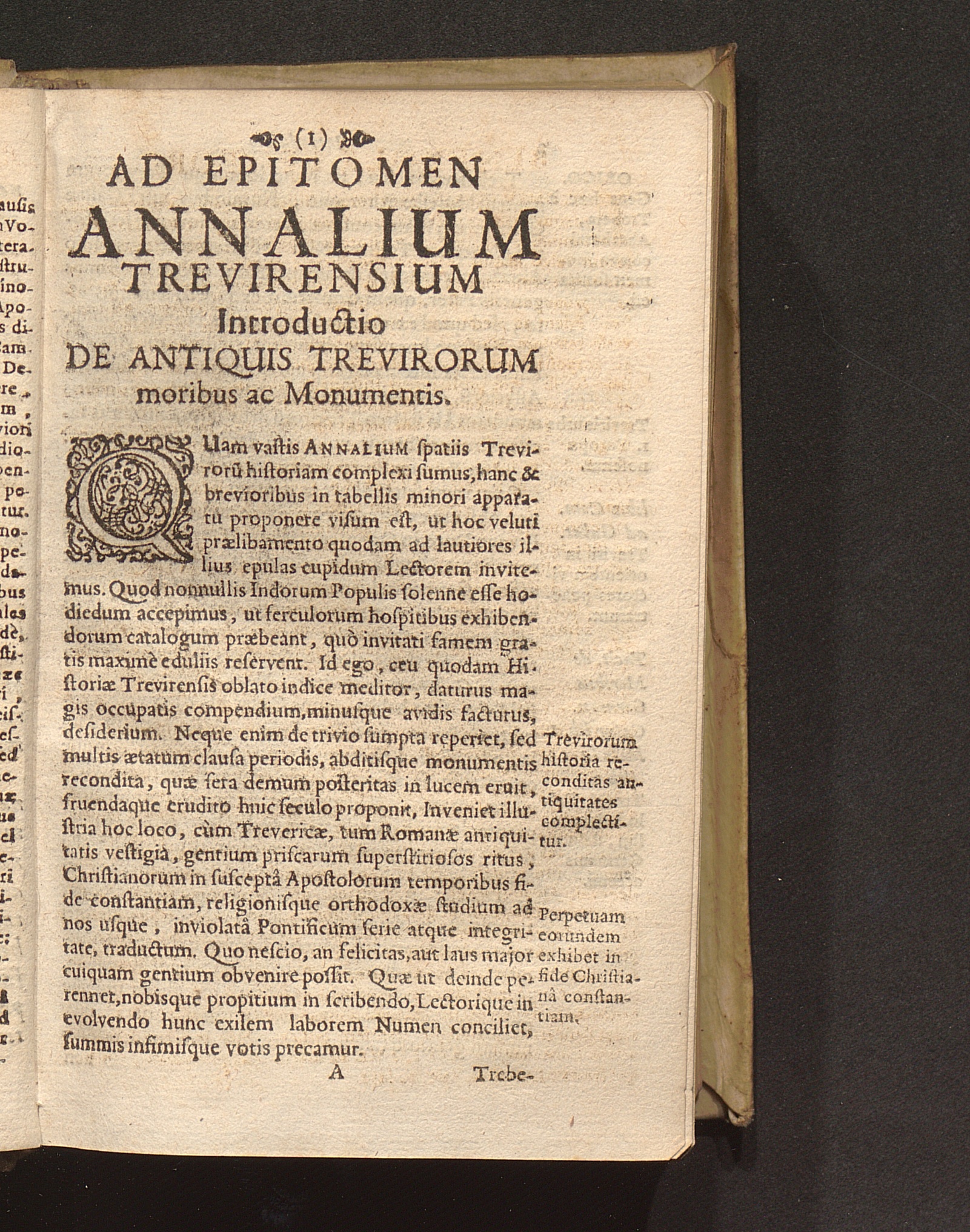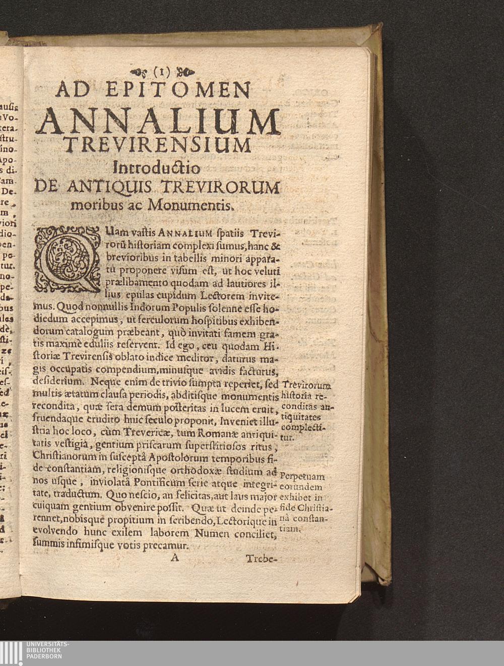 Epitome Annalivm Trevirensium : Qva Antiquae Urbis Ac Dioecesis Trevericae, In Politico Et Ecclesiastico Regimine Exordia, Progressúsque, Ac Res Bello Ac Pace Administratae, Brevi Claroque Ordine digestae sunt, cum aliis Romani Imperii Gestis eidem conjunctis / Per R. P. Jacobum Masenium è Societate Jesu
