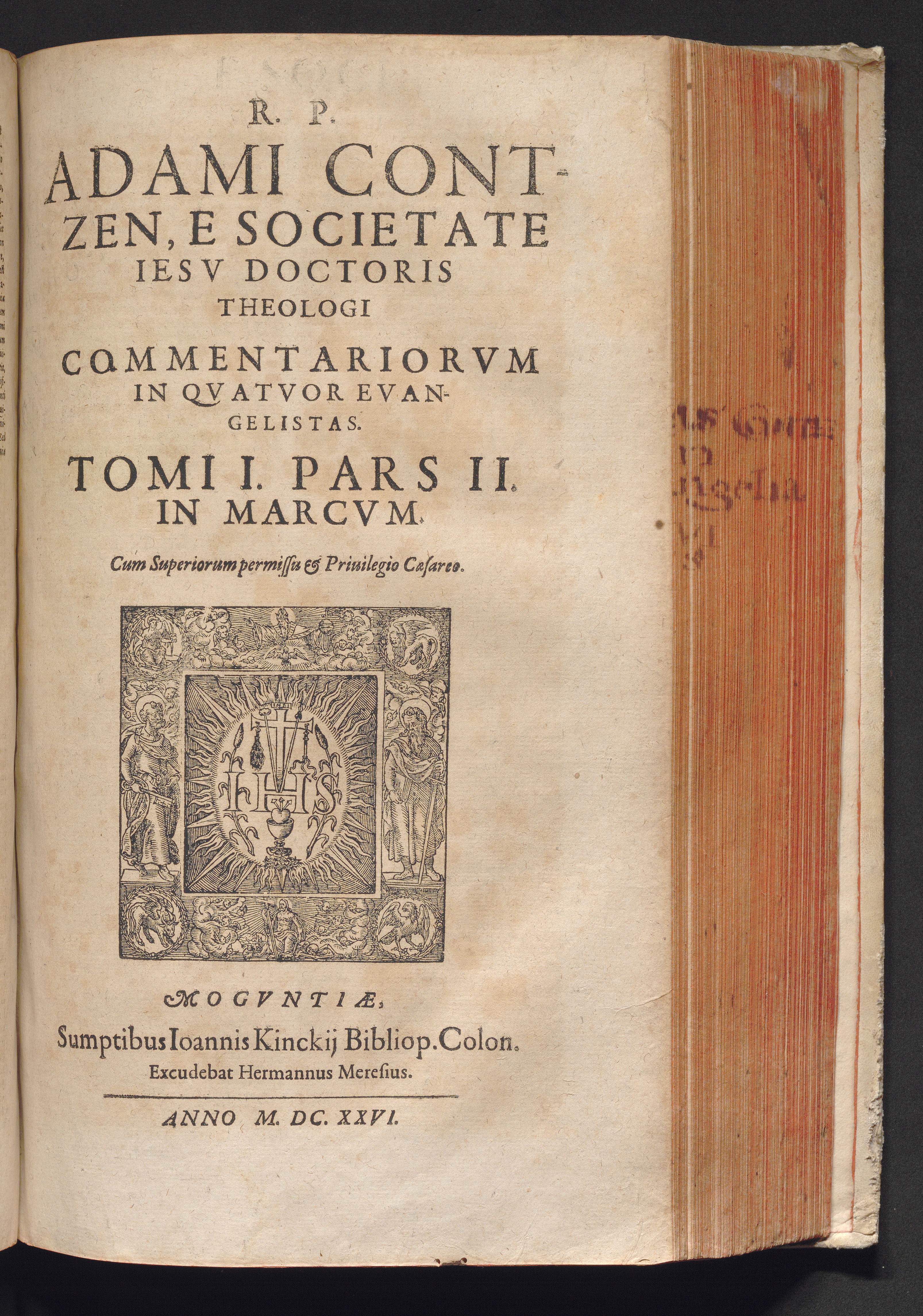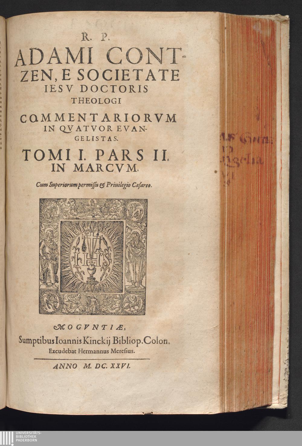 1,2 (1626) R. P. Adami Contzen E Societate Iesv, SS. Theol. Doct. Commentaria In Qvatvor Sancta Iesv Christi Evangelia : In Quibus Sensvs Vervs, Literalis Et Moralis ita explicatur, ut & ipsis verbis, collatione aliorum locorum, Concilijs, Pontificum decretis, Patribus vetustis, ... contra Gentilis, Iudæos, Hæreticos veteres & nouos, veritas apertè vindicetur ..... Tomus I., Pars II / In Marcvm