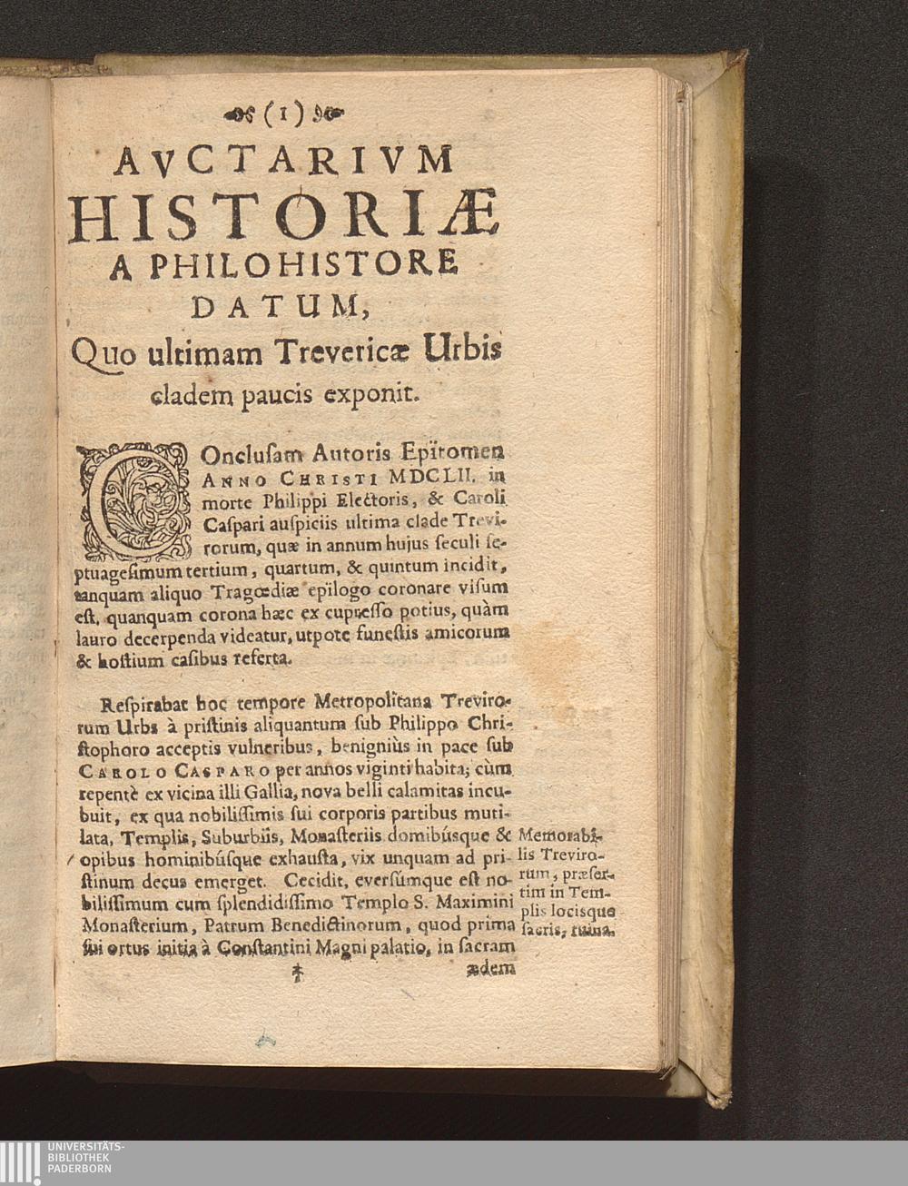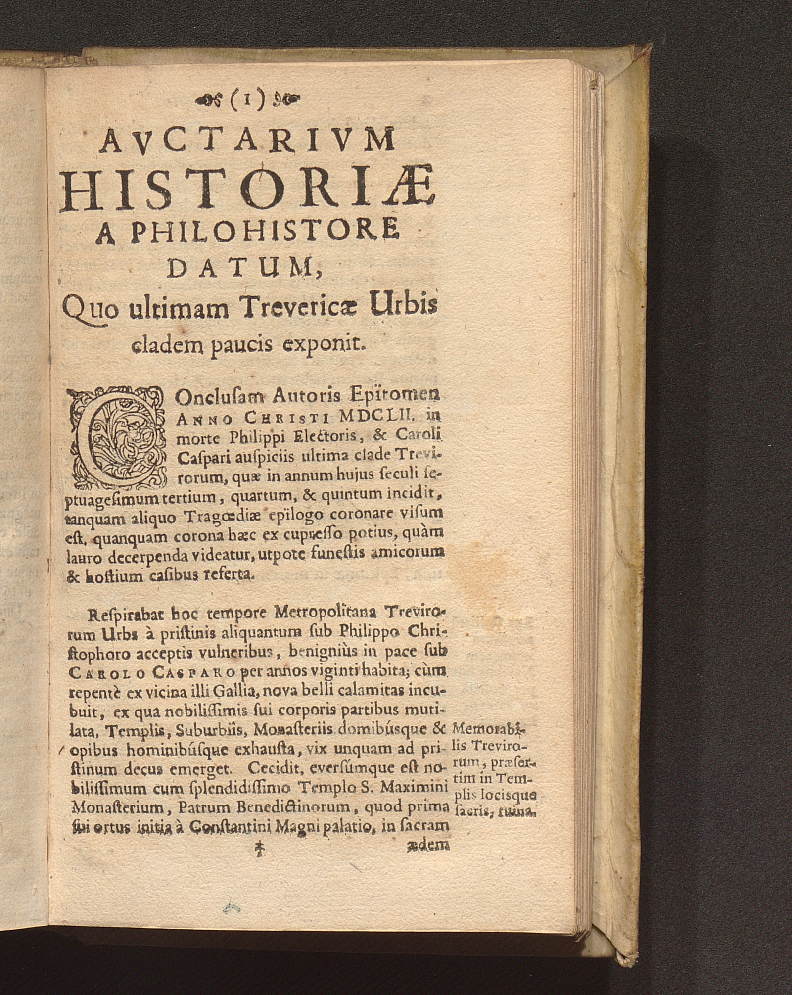 Epitome Annalivm Trevirensium : Qva Antiquae Urbis Ac Dioecesis Trevericae, In Politico Et Ecclesiastico Regimine Exordia, Progressúsque, Ac Res Bello Ac Pace Administratae, Brevi Claroque Ordine digestae sunt, cum aliis Romani Imperii Gestis eidem conjunctis / Per R. P. Jacobum Masenium è Societate Jesu