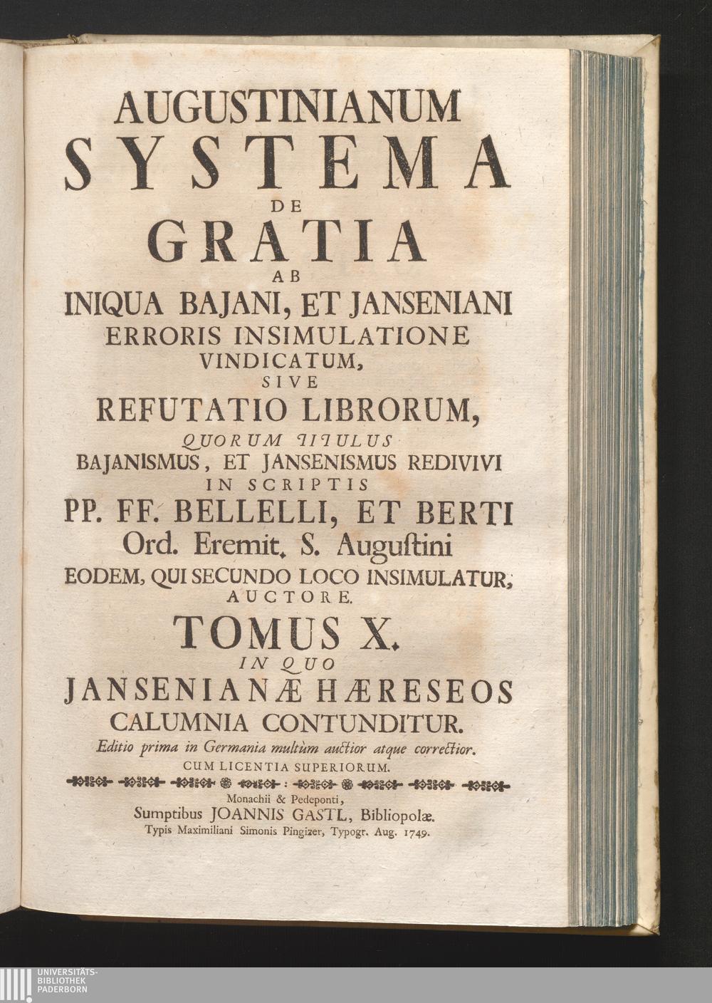 2 (1749) Augustinianum Systema De Gratia Ab Iniqua Bajani, Et Janseniani Erroris Insimulatione Vindicatum, Sive Refutatio Librorum Quorum Titulus Bajanismus, Et Jansenismus Redivivi In Scriptis PP. FF. Bellelli, Et Berti Ord. Eremit. S. Augustini Eodem, Qui Secundo Loco Insimulatur, Auctore : . [2] / In Quo Jansenianæ Hæreseos Calumnia Contunditur