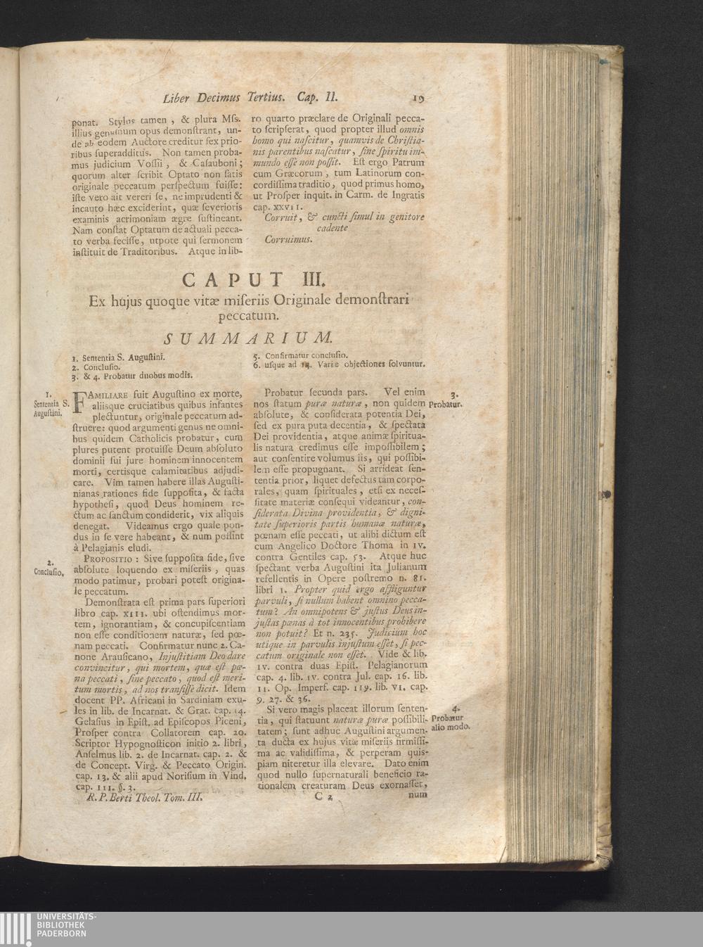 3 (1749) Rev. Patr. Joannis Laurentii Berti, Ord. Eremit. S. Augustini, Theologia Historico-Dogmatico-Scholastica, Seu Libri, De Theologicis Disciplinis : Opus Calculo Calculo Doctissimorum Virorum Sane Præstantium, Primo Octo Tomis Editum Romæ, Quibus Novissime Accesserunt Duo Tomi, Comprehendentes Augustinianum Systema De Gratia, Ab Iniqua Baiani, Et Janseniani Erroris Insimulatione Vindicatum: Juncto Ad Quodvis Caput Summario Materiarum, Nec Non Numeris Marginalibus, Ac In Fine Cujusvis Tomi Indice Locupletissimo: Tomus .... Tomus III / Qui Complectitur Dissertationes De Originali Peccato, De Hæresibus Adversus Liberum Arbitrium, Et Gratiam, Atque De Ipsa Gratia Reparatoris