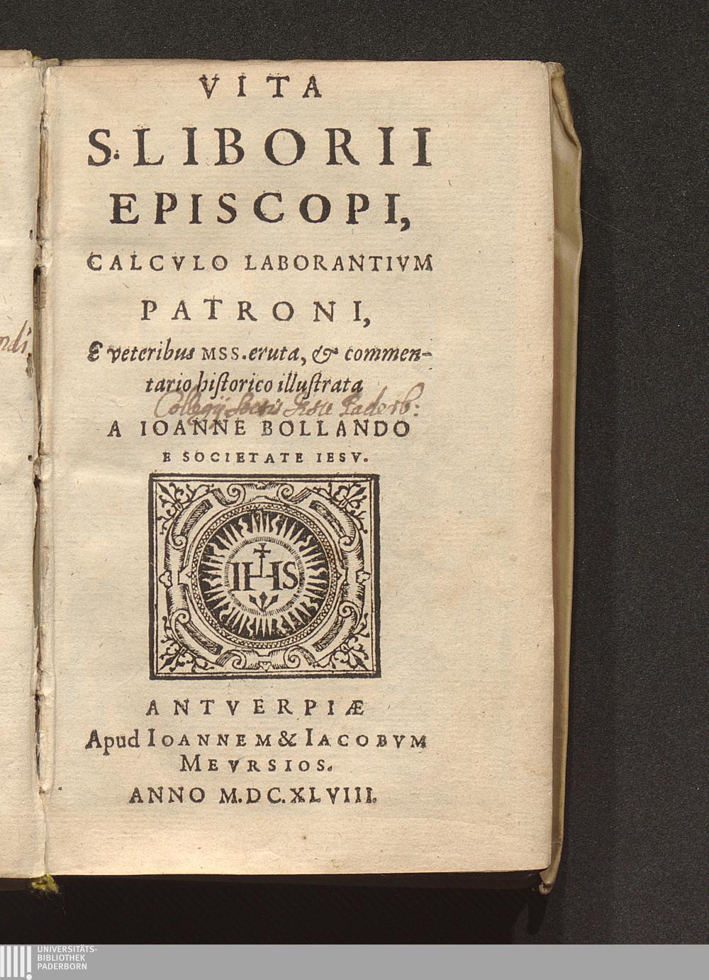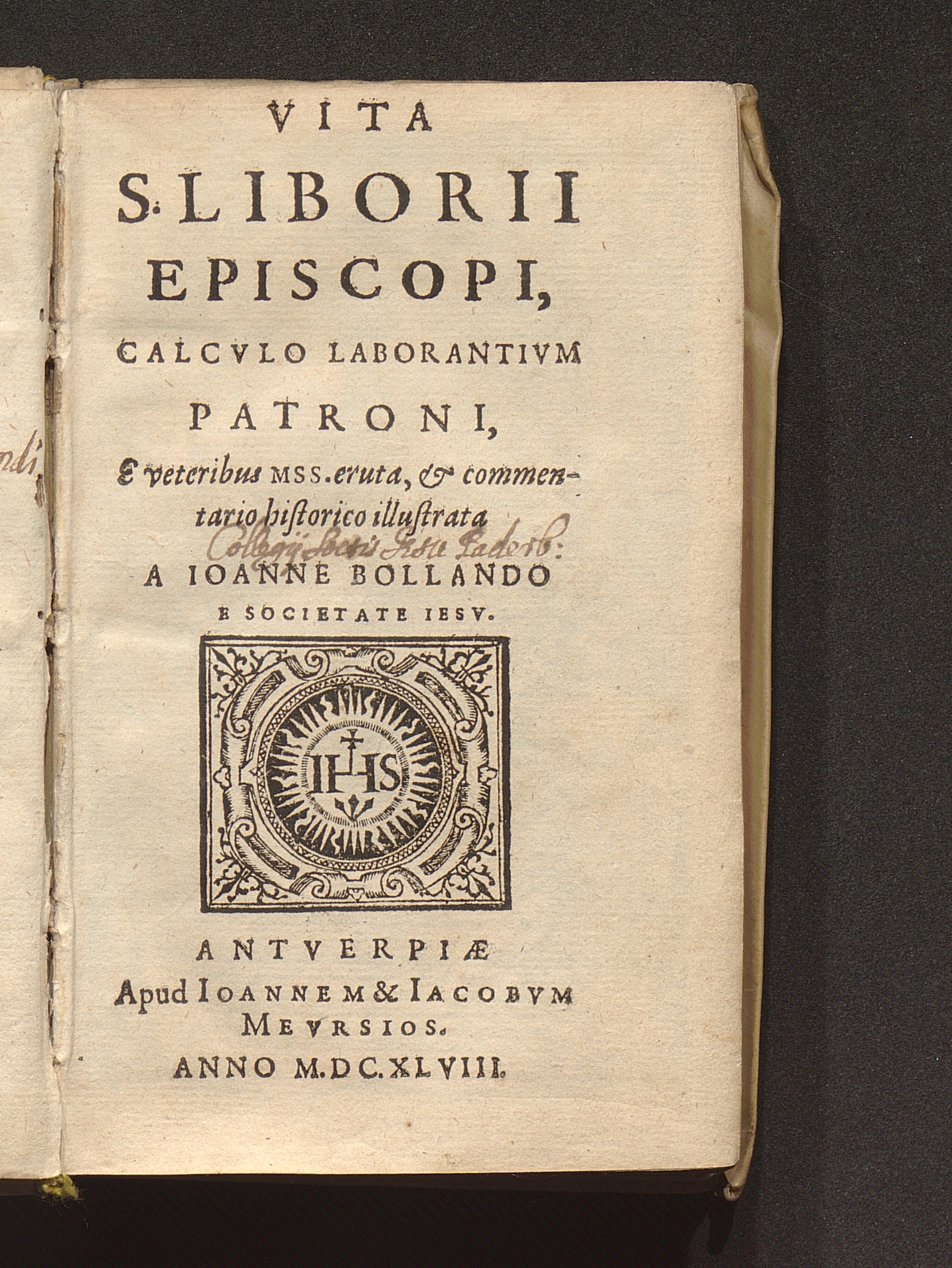 Vita S. Liborii Episcopi, Calcvlo Laborantivm Patroni / E veteribus Mss. eruta, & commentario historico illustrata A Ioanne Bollando E Societate Iesv