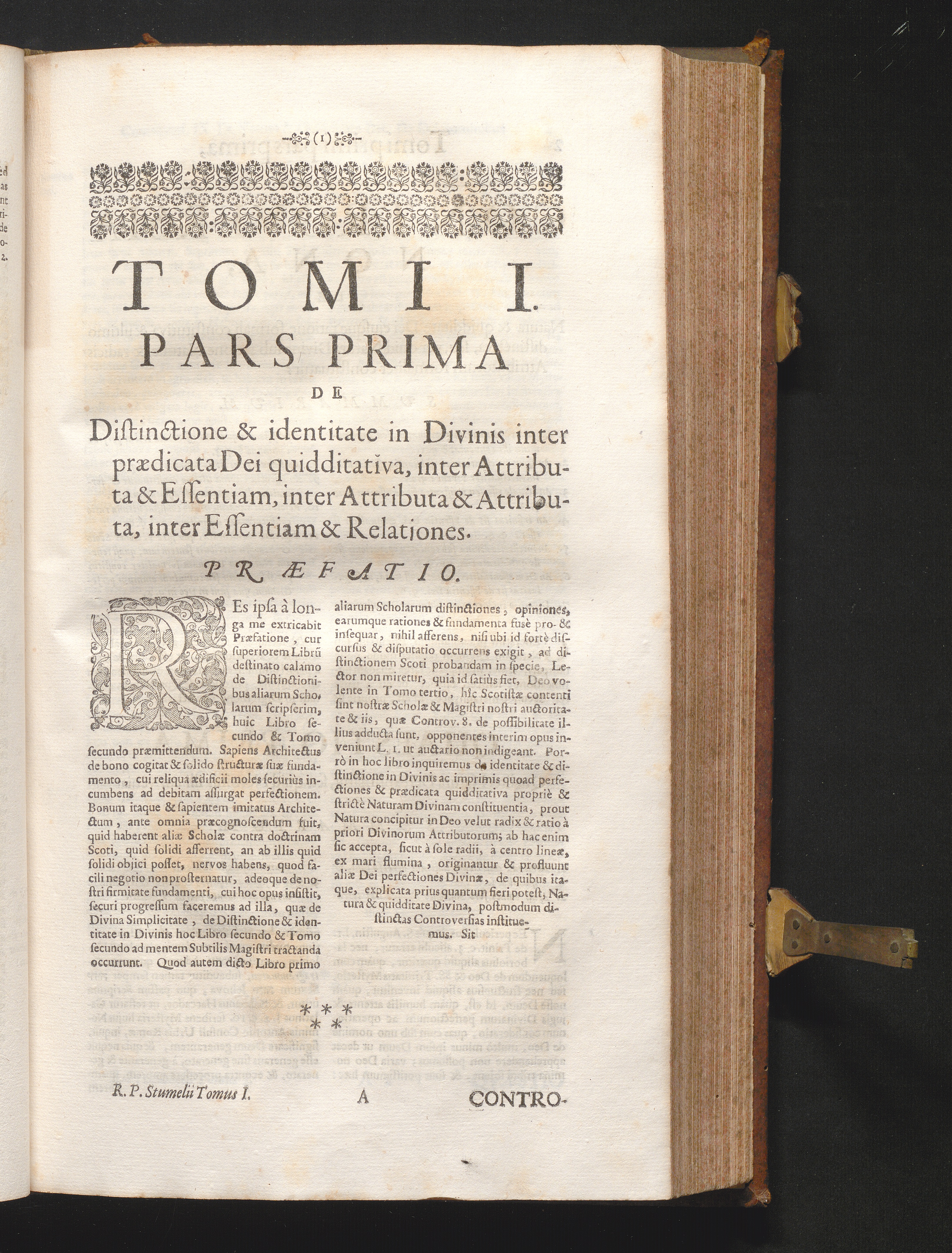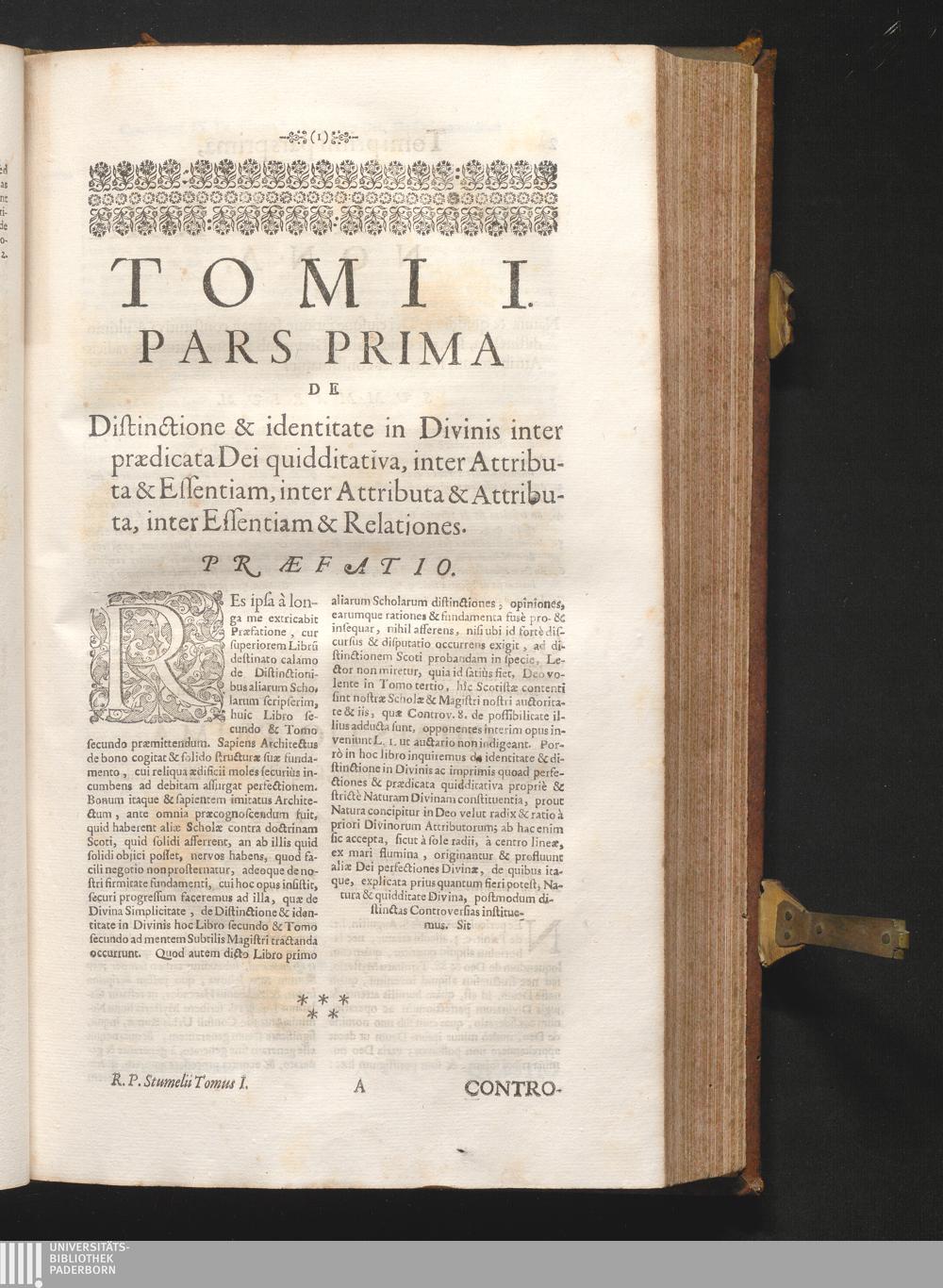 1-2 (1680) Controversiarum Inter Principes Cathedras Divi Thomæ Doctoris Angelici, Et Scoti Doctoris Svbtilis : Nec Non Aliarvm Illvstrissimarvm Scholarvm De Simplicitate Dei, Et Distinctione In Ipsa Deitatis Ac Identitatis Divinæ Abysso Latenter Recondita, Eaque Ad Divinam Simplicitatem Comparata Primum & Perenne Mobile ... In Dvos Divisvm Tomos / Auctore R. A. P. Friderico Stvmelio SS. Theol. Lectore Iubilato, Ord. FF. Min. Recollect. Provinciæ Thuringiæ S. Elisabethæ Patre