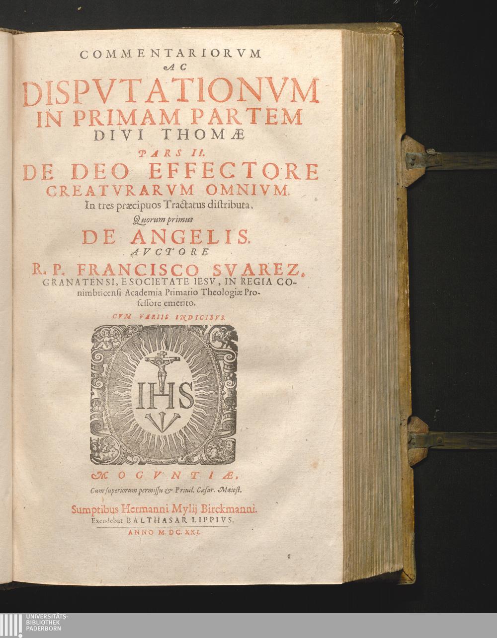 2,1 (1621) De Deo Effectore Creatvrarvm Omnivm. In tres præcipuos Tractatus distributa. Quorum primus De Angelis / Avctore R. P. D. Francisco Svarez Granatensi, E Societate Iesv, In Regia Conimbricensi Adacemia Primario Theologiæ Professore