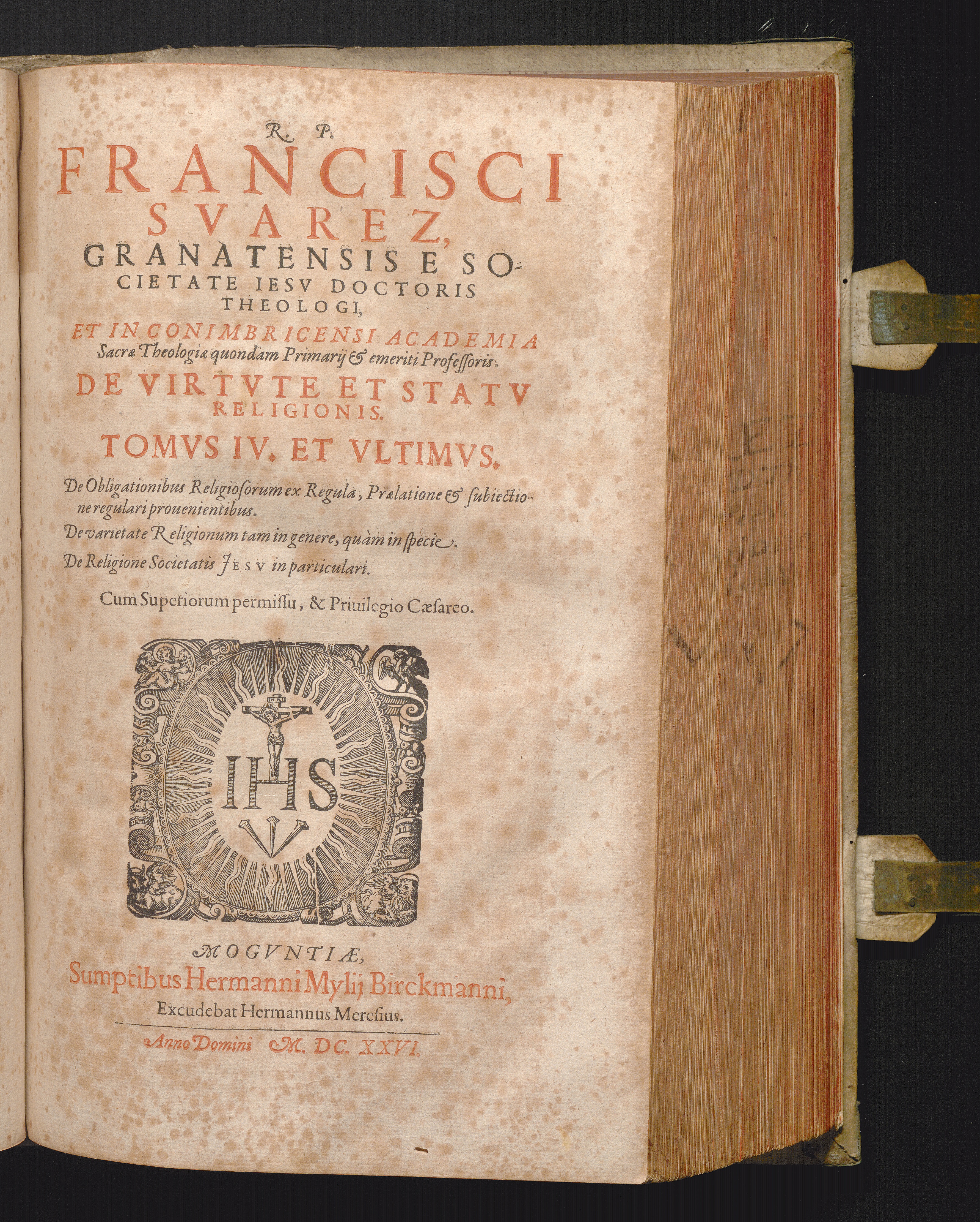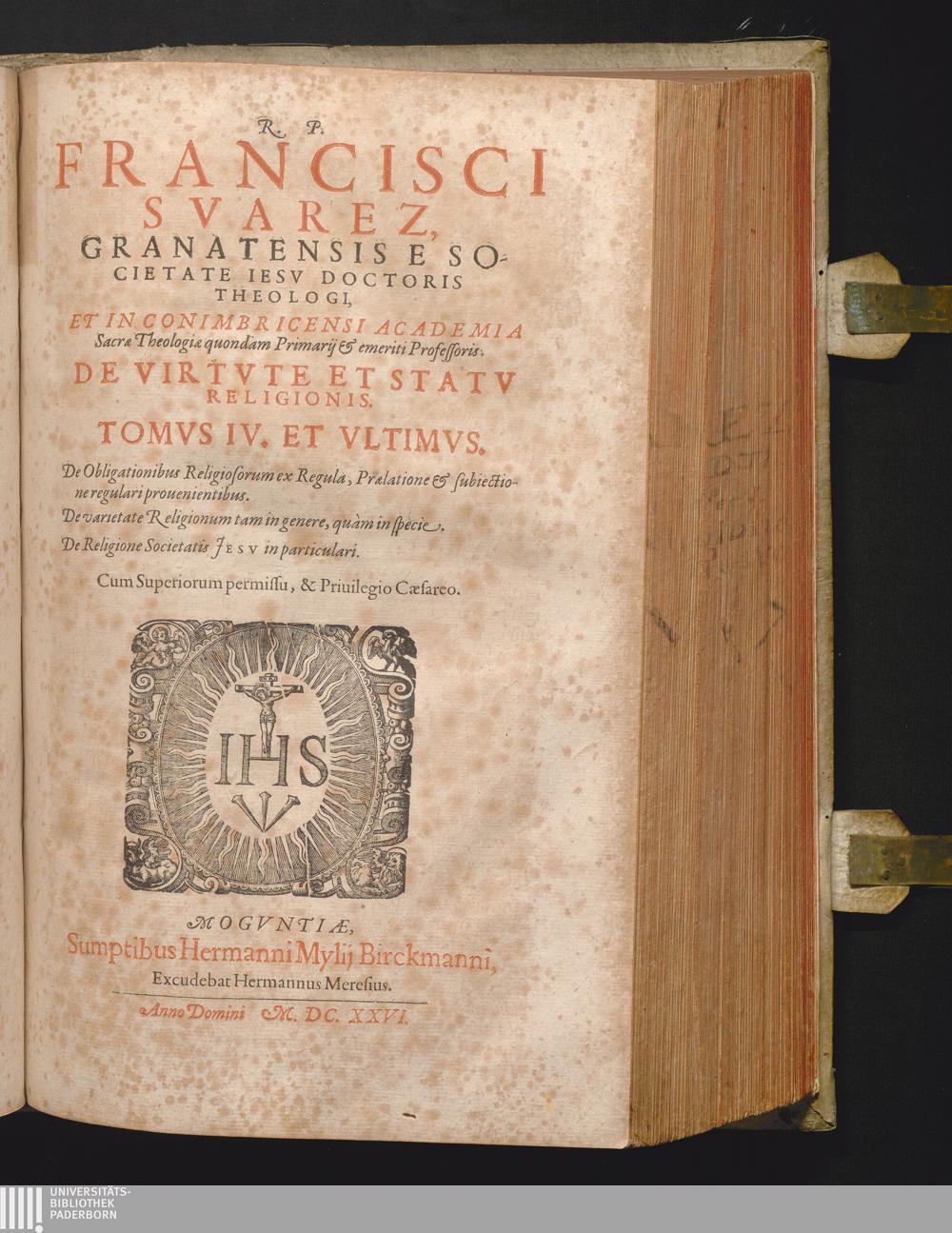 4 (1626) De Obligationibus Religiosorum ex Regula, Prælatione & subiectione regulari prouenientibus, De varietate Religionum tam in genere, quàm in specie, De Religione Societatis Jesv in particulari