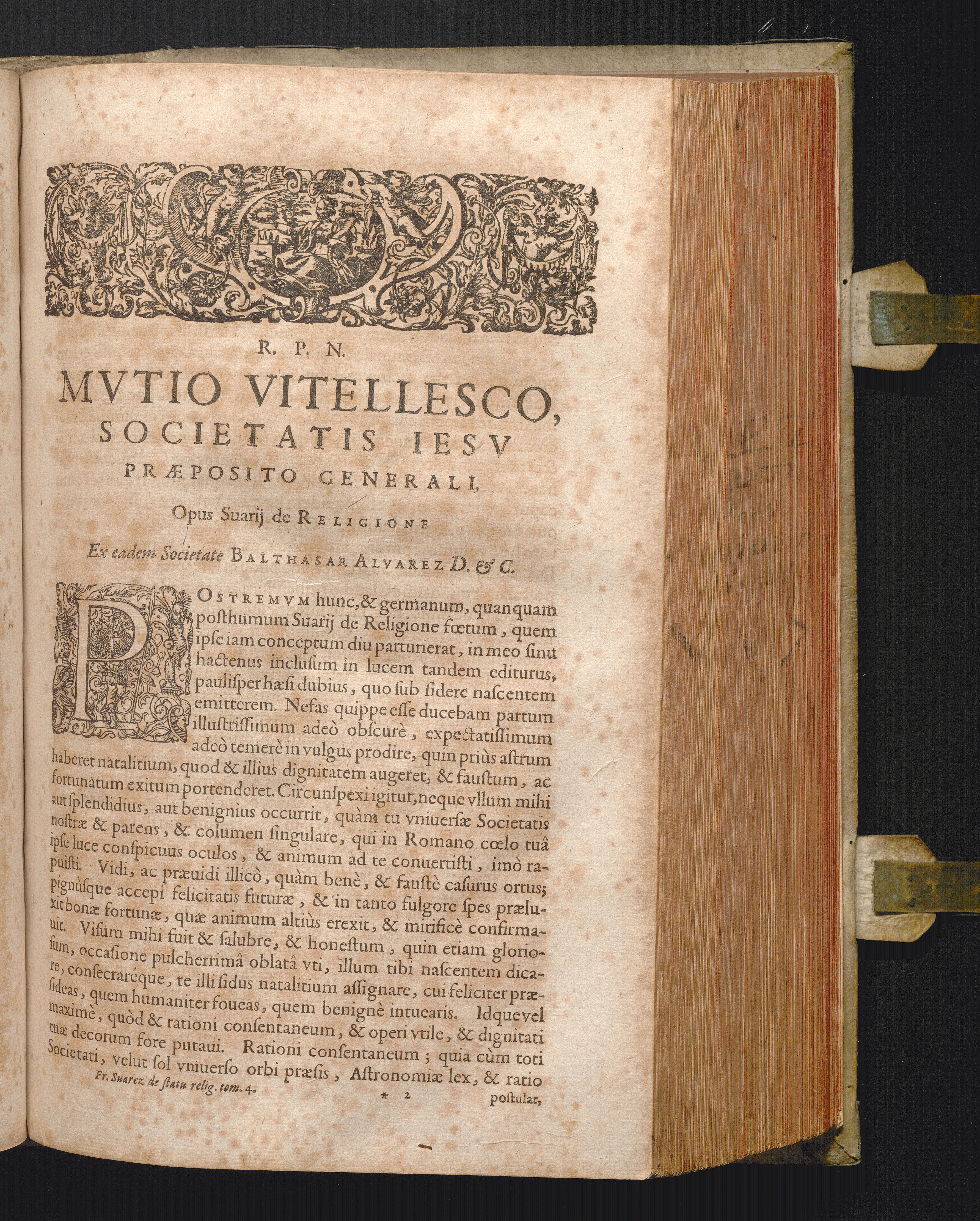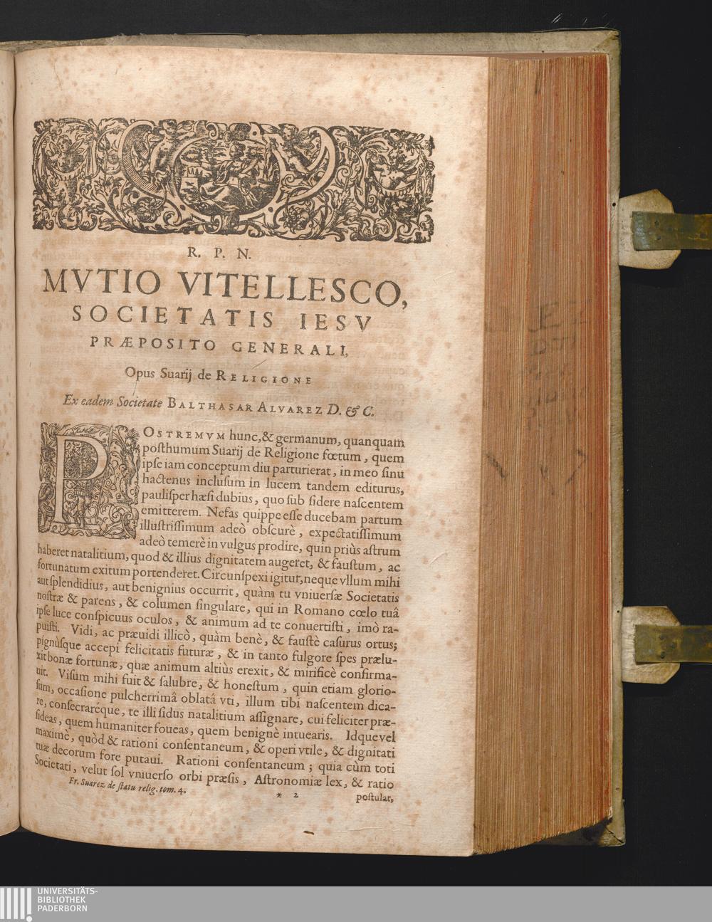 R. P. N. Mvtio Vitellesco , Societatis Iesv Præposito Generali, Opus Suarij de Religione[...]