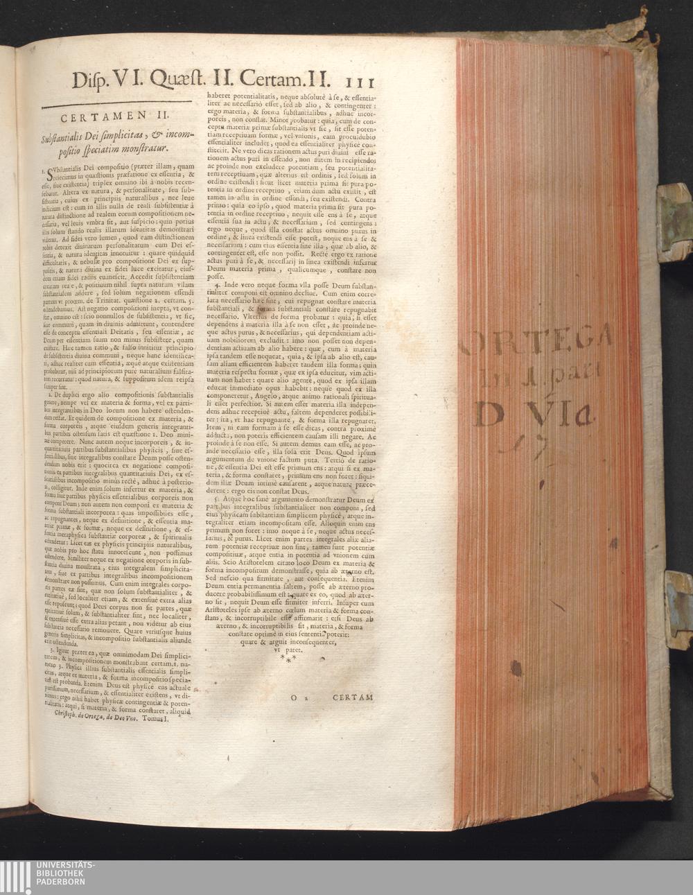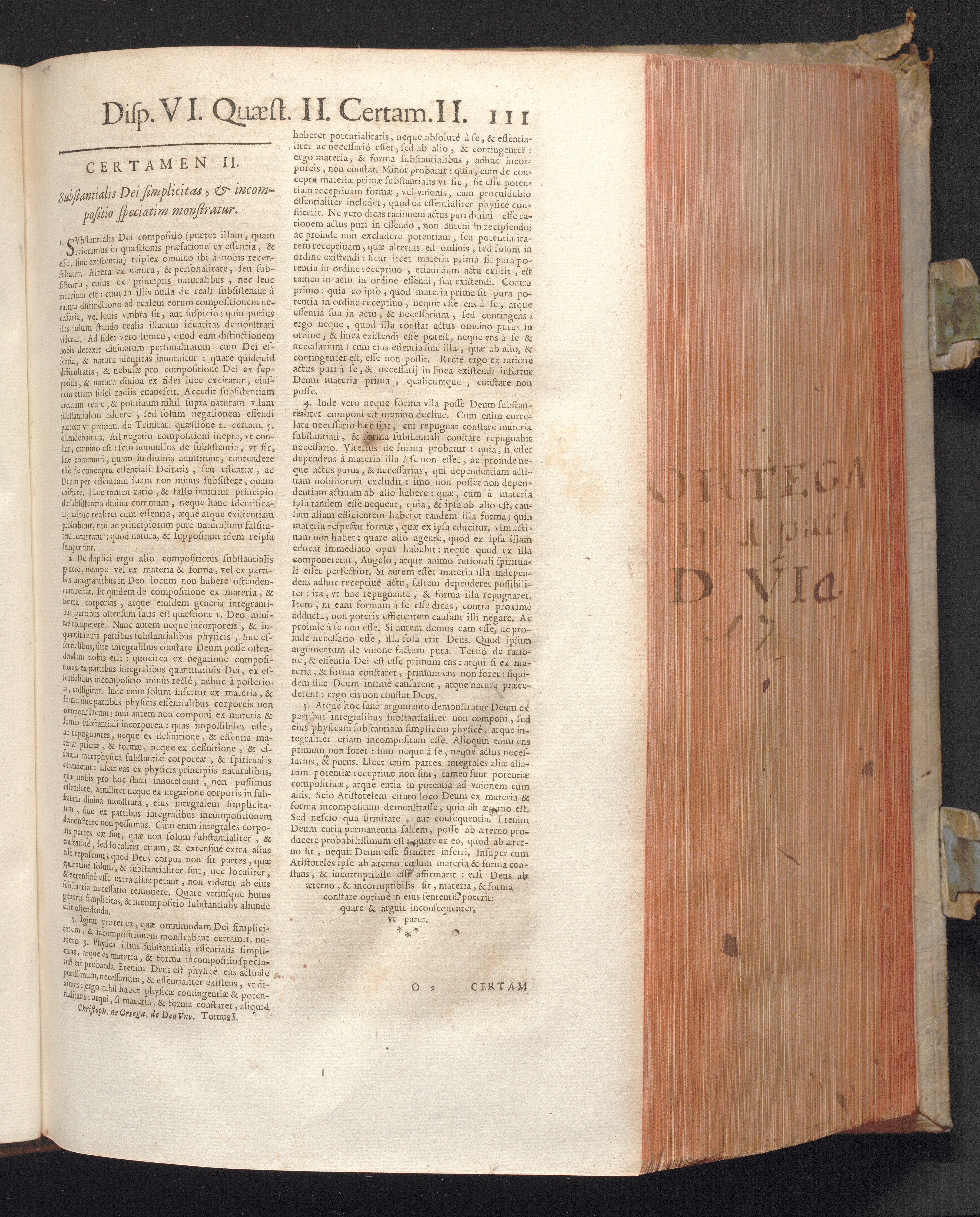 1 (1680) R. P. Christophori De Ortega È Societate Iesu, Quondam Scolasticæ Theologiæ publici Professoris, ac ejusdem Facultatis Præfecti ... Theologia Controversiarum Dogmaticarum, & Scholasticarum, de Divina Essentia, Attributis non vitalibus, de Scientia, & de Decreto concurrendi cum causis liberis