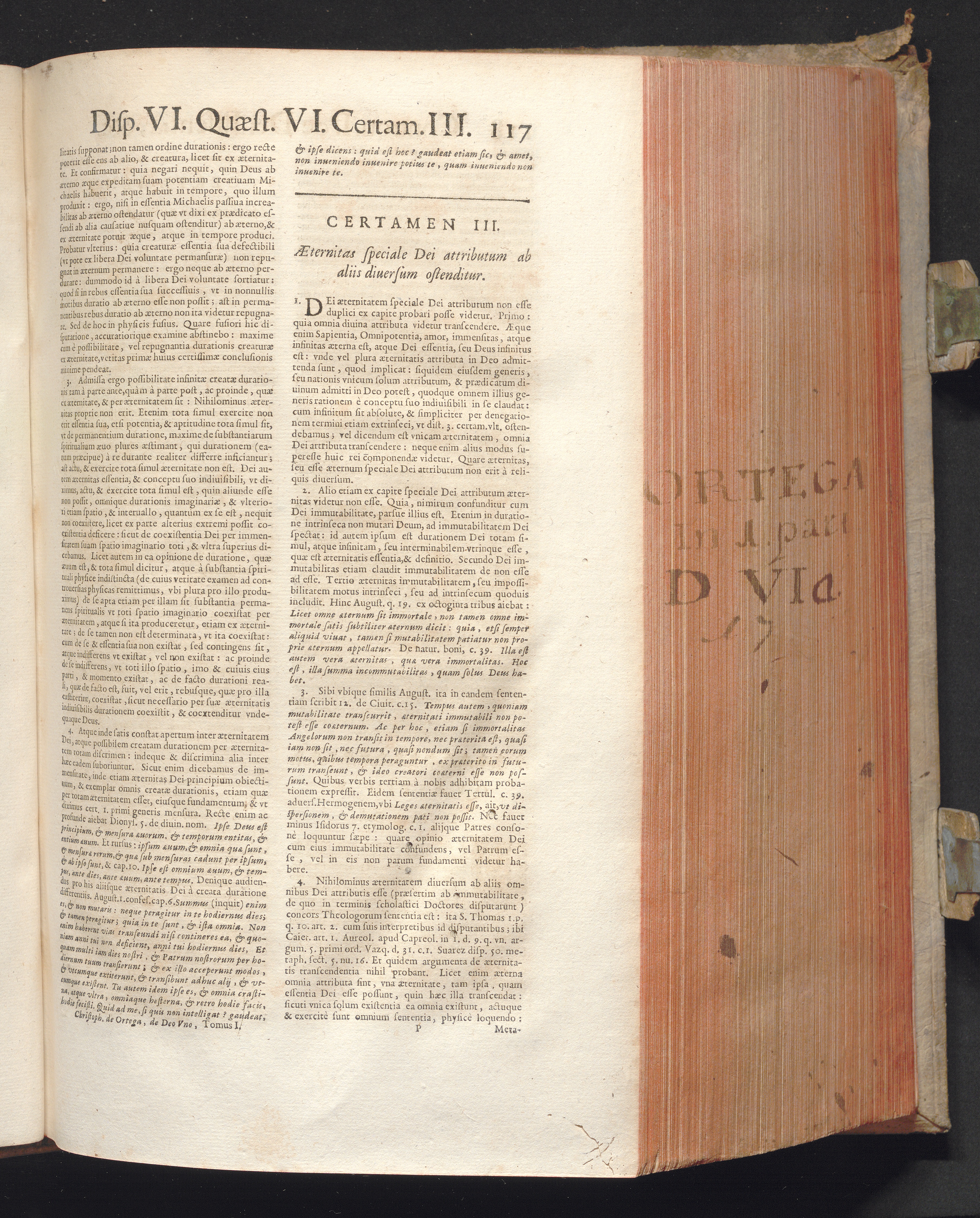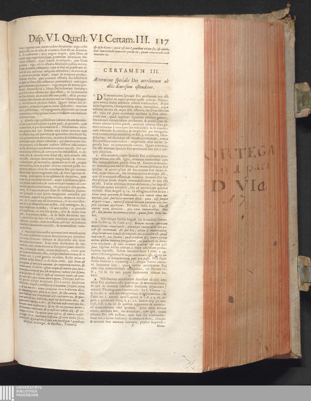 1 (1680) R. P. Christophori De Ortega È Societate Iesu, Quondam Scolasticæ Theologiæ publici Professoris, ac ejusdem Facultatis Præfecti ... Theologia Controversiarum Dogmaticarum, & Scholasticarum, de Divina Essentia, Attributis non vitalibus, de Scientia, & de Decreto concurrendi cum causis liberis