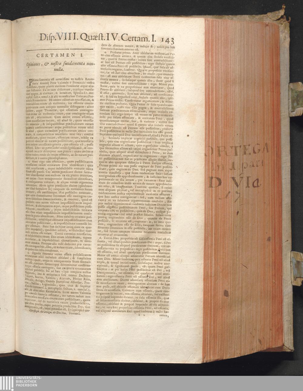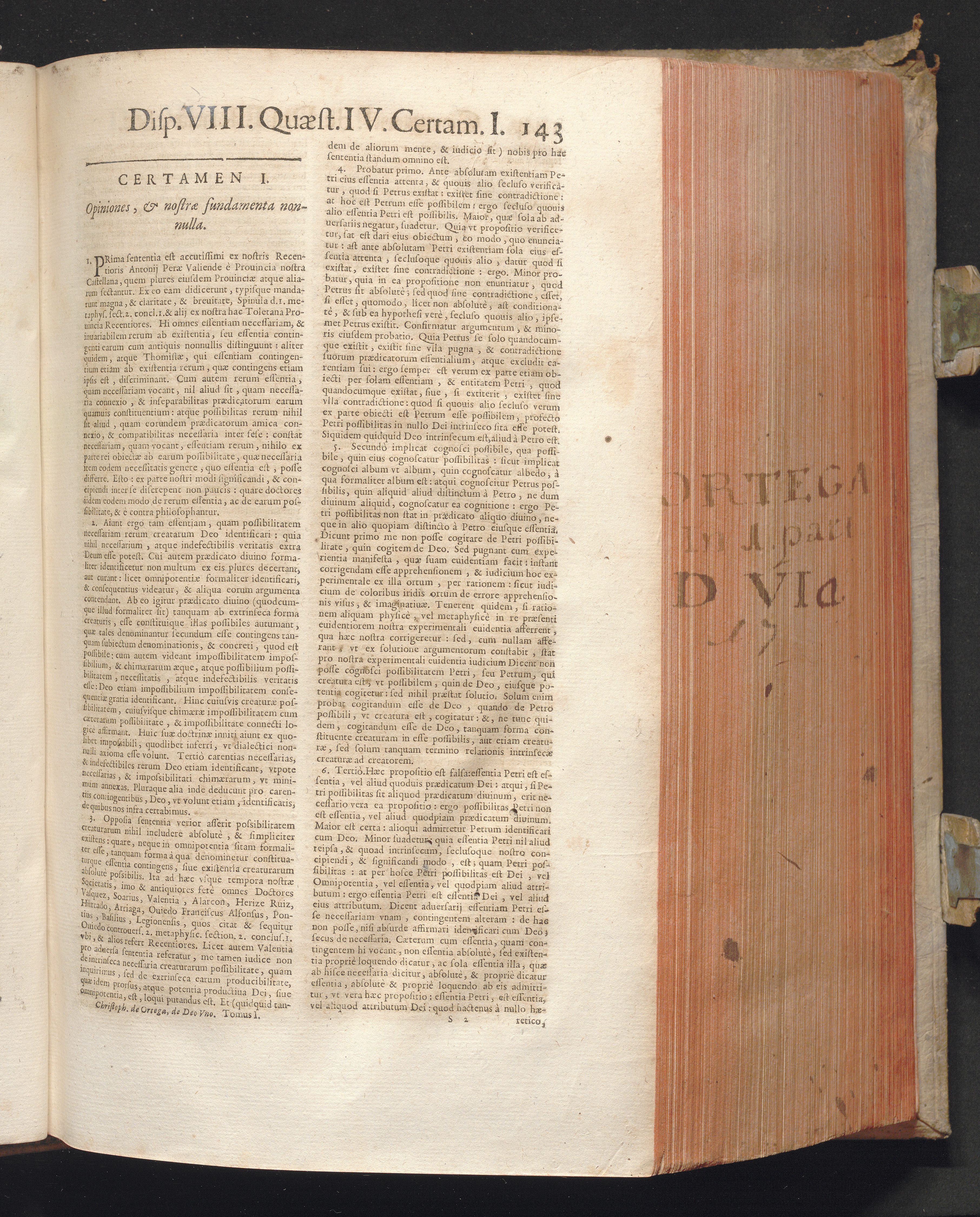 1 (1680) R. P. Christophori De Ortega È Societate Iesu, Quondam Scolasticæ Theologiæ publici Professoris, ac ejusdem Facultatis Præfecti ... Theologia Controversiarum Dogmaticarum, & Scholasticarum, de Divina Essentia, Attributis non vitalibus, de Scientia, & de Decreto concurrendi cum causis liberis