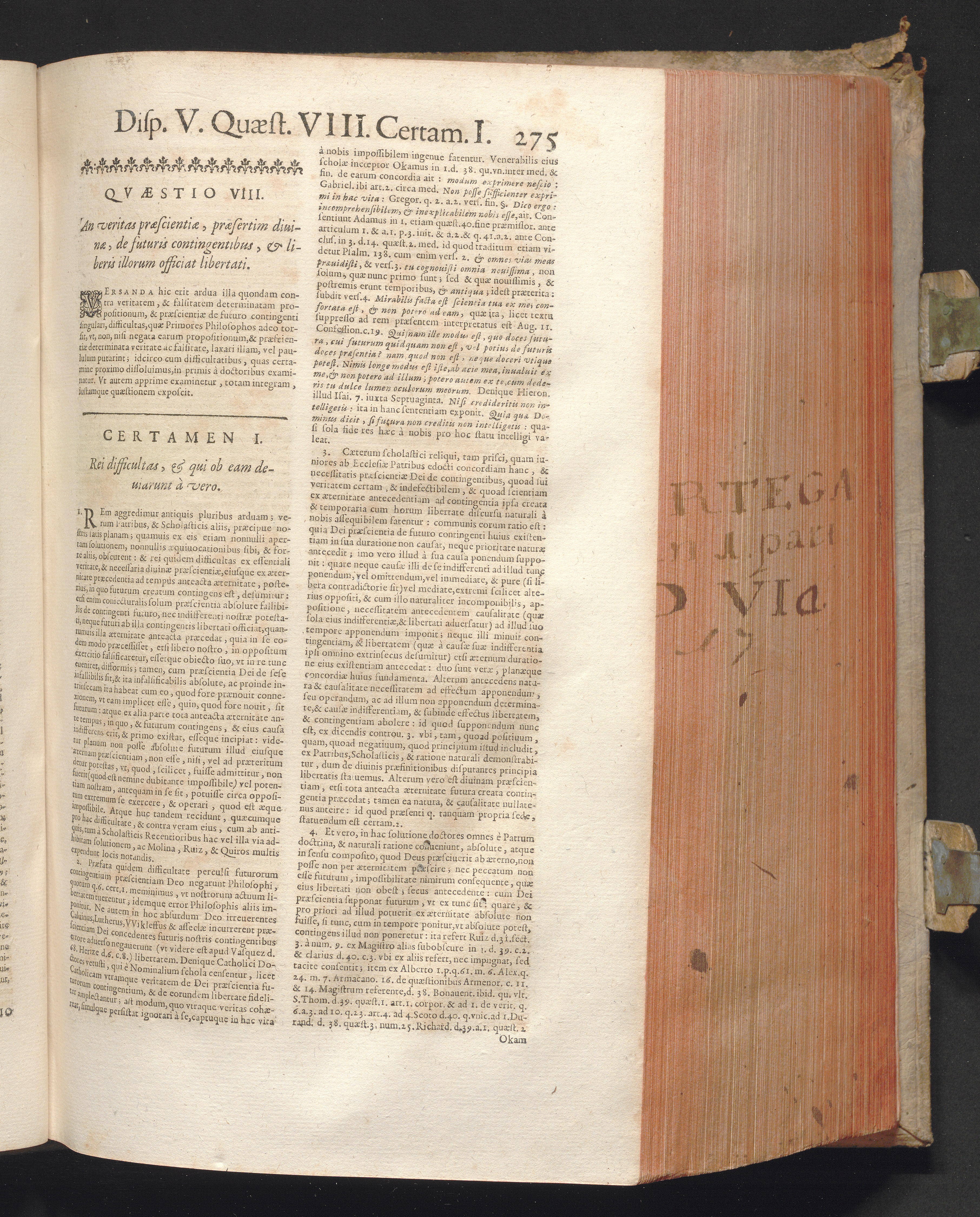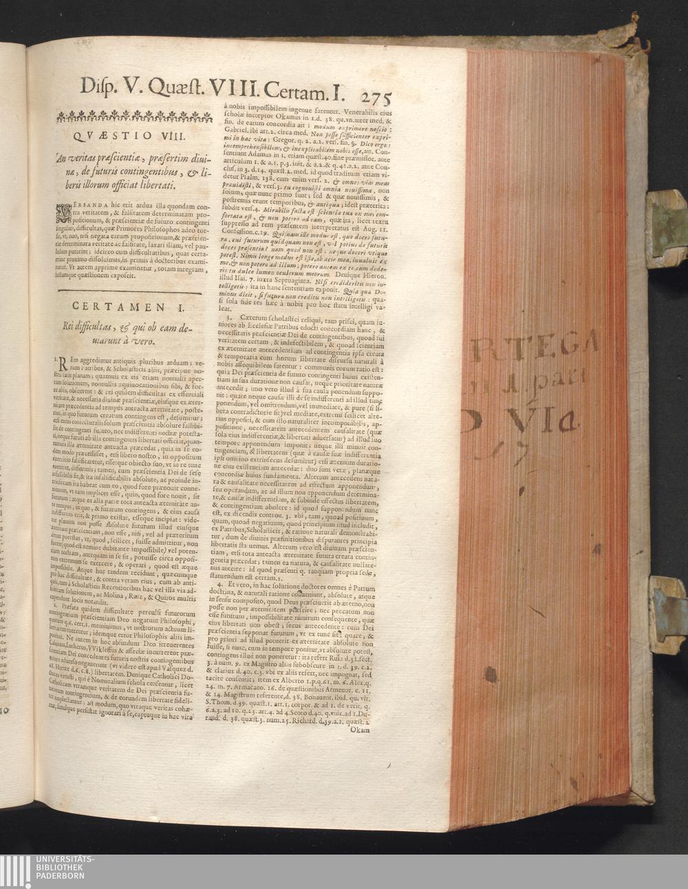 1 (1680) R. P. Christophori De Ortega È Societate Iesu, Quondam Scolasticæ Theologiæ publici Professoris, ac ejusdem Facultatis Præfecti ... Theologia Controversiarum Dogmaticarum, & Scholasticarum, de Divina Essentia, Attributis non vitalibus, de Scientia, & de Decreto concurrendi cum causis liberis