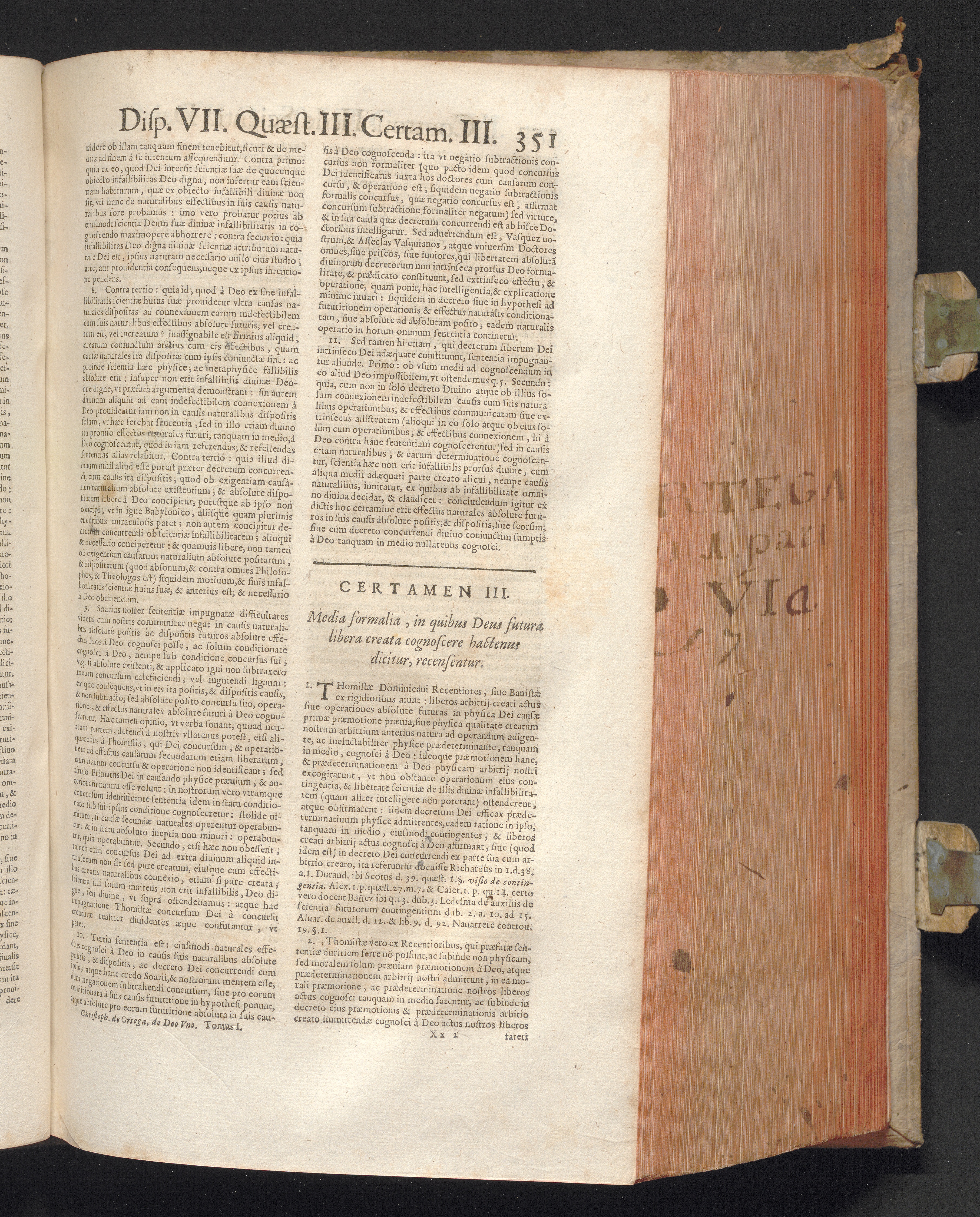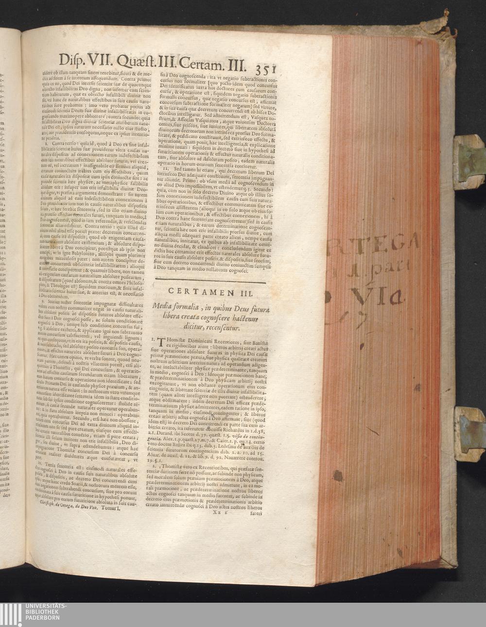 1 (1680) R. P. Christophori De Ortega È Societate Iesu, Quondam Scolasticæ Theologiæ publici Professoris, ac ejusdem Facultatis Præfecti ... Theologia Controversiarum Dogmaticarum, & Scholasticarum, de Divina Essentia, Attributis non vitalibus, de Scientia, & de Decreto concurrendi cum causis liberis