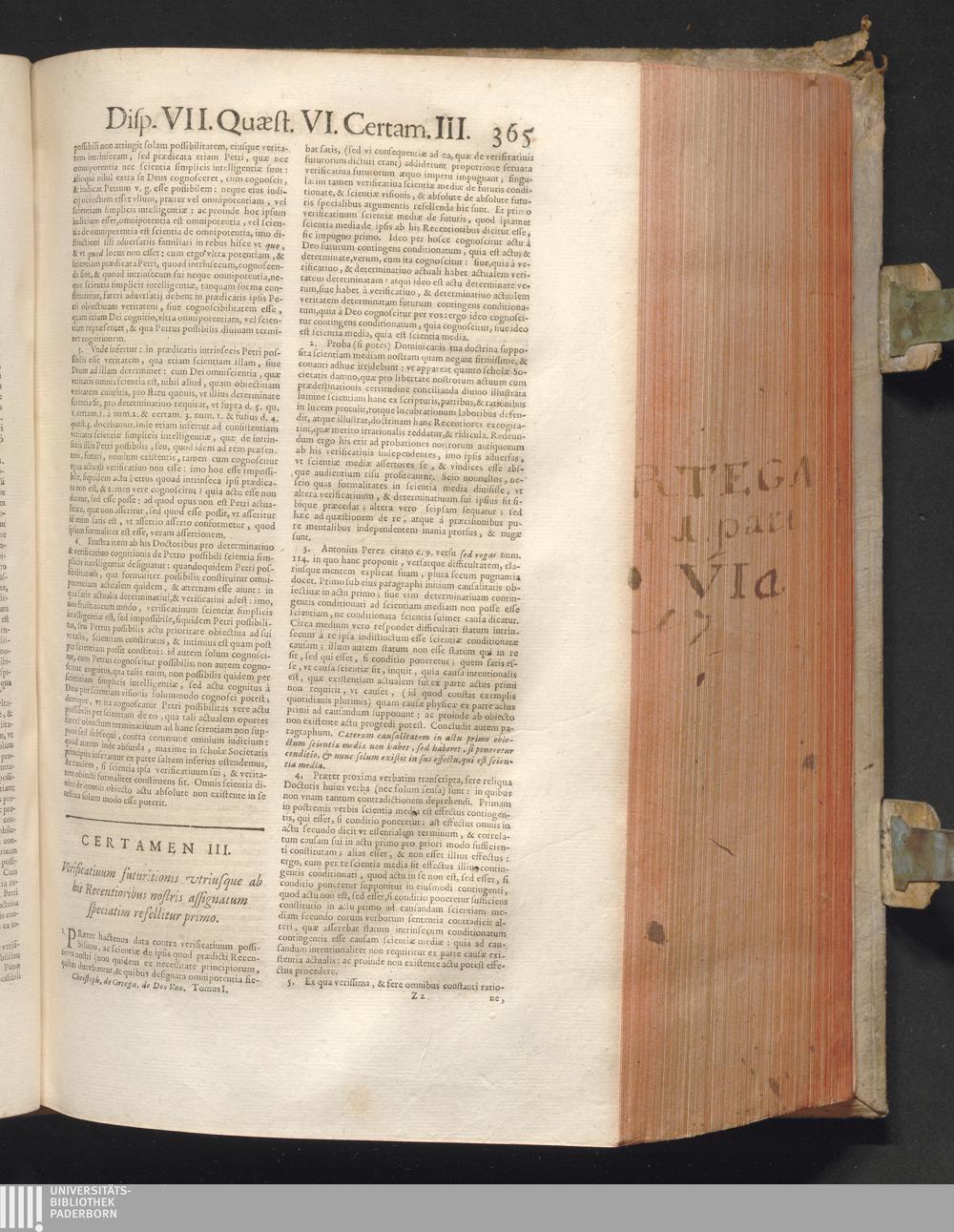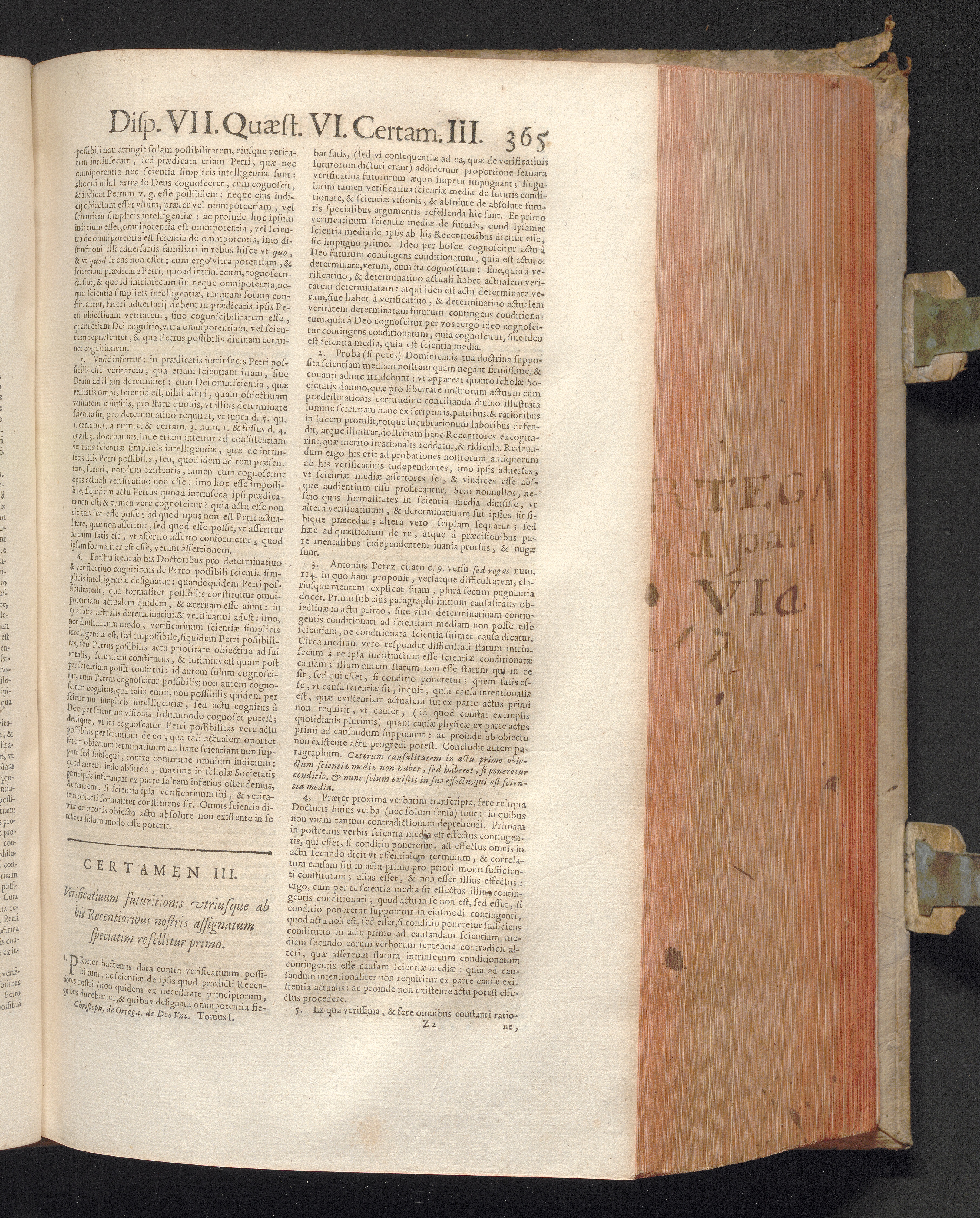 1 (1680) R. P. Christophori De Ortega È Societate Iesu, Quondam Scolasticæ Theologiæ publici Professoris, ac ejusdem Facultatis Præfecti ... Theologia Controversiarum Dogmaticarum, & Scholasticarum, de Divina Essentia, Attributis non vitalibus, de Scientia, & de Decreto concurrendi cum causis liberis