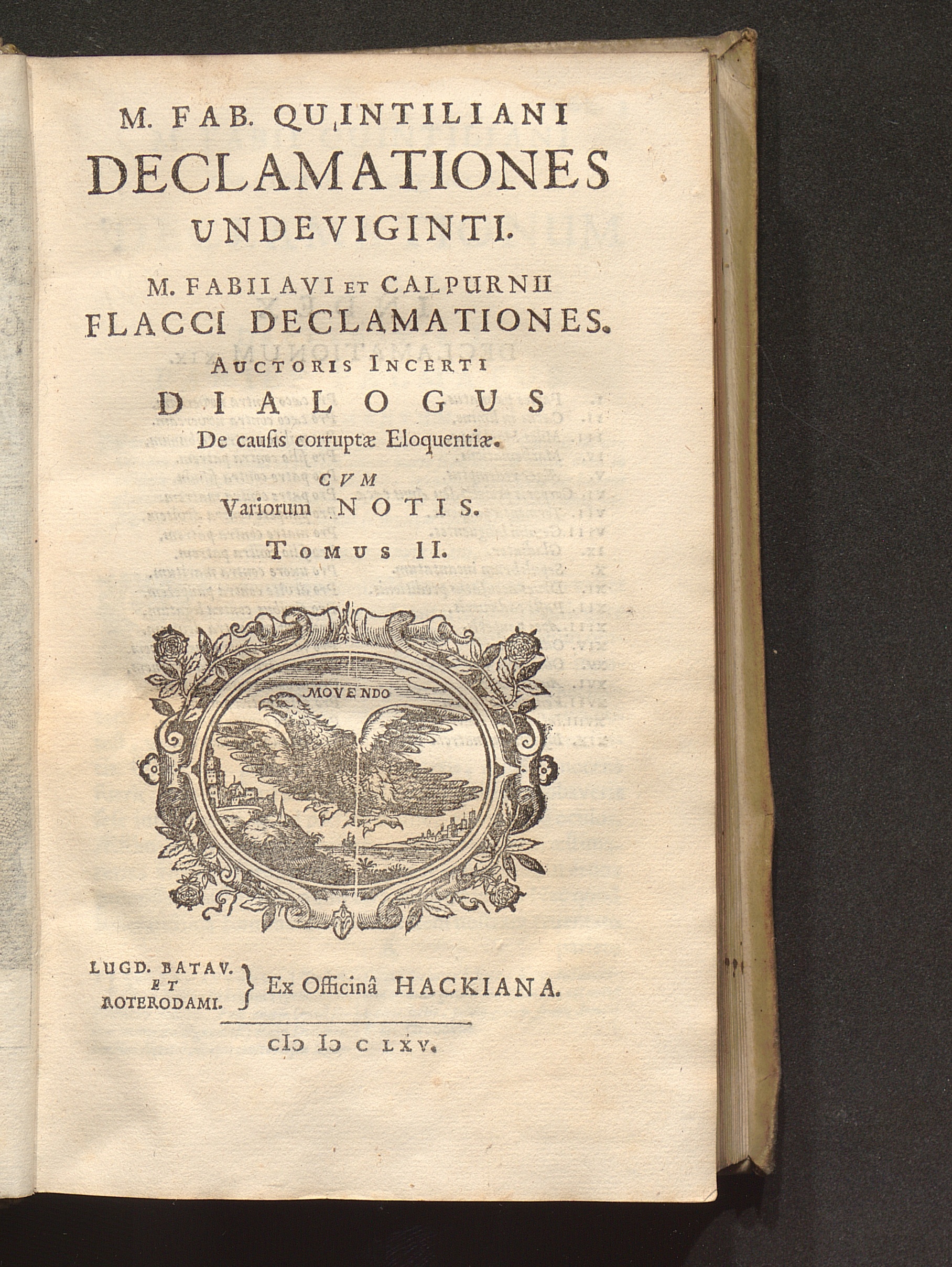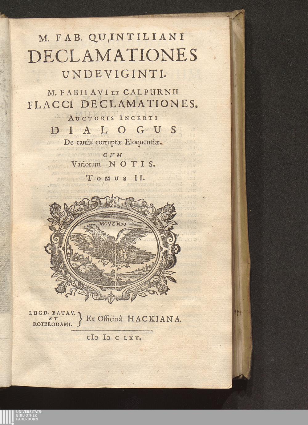 Tomus II (1665) M. Fab. Quintiliani Declamationes Undeviginti. M. Fabii Avi Et Calpurnii Flacci Declamationes. Auctoris Incerti Dialogus De causis corruptae Eloquentiae : Cvm Variorum Notis