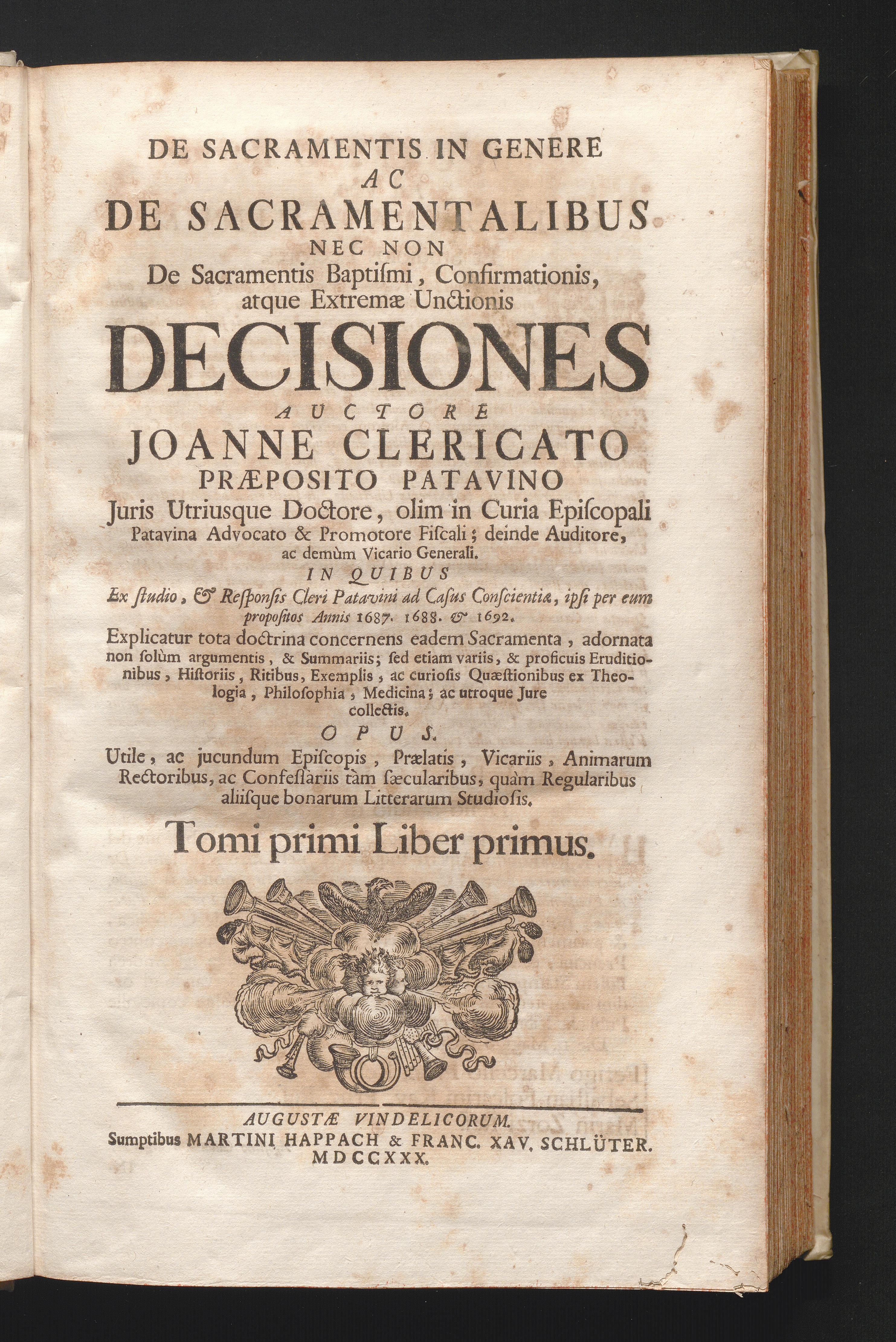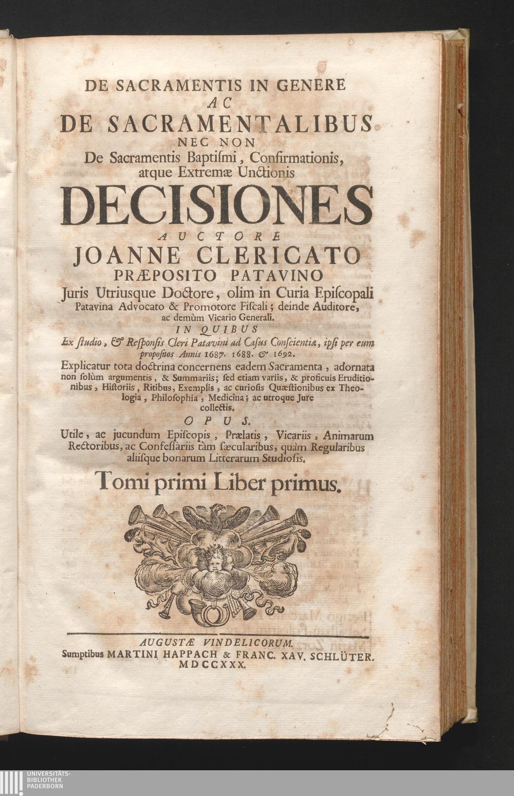 1,1 (1730) De Sacramentis In Genere Ac De Sacramentalibus Nec Non De Sacramentis Baptismi, Confirmationis, atque Extremæ Unctionis Decisiones / Auctore Joanne Clericato Præposito Patavino Juris Utriusque Doctore Olim in Curia Episcopali Patavina Advocato, & Promotore Fiscali, deinde Auditore, ac demùm sub Regimine Eminentissimi, ac Reverentissimi S.M. Gregorii Card. Barbadici Episcopo Patavini Vicario Generali