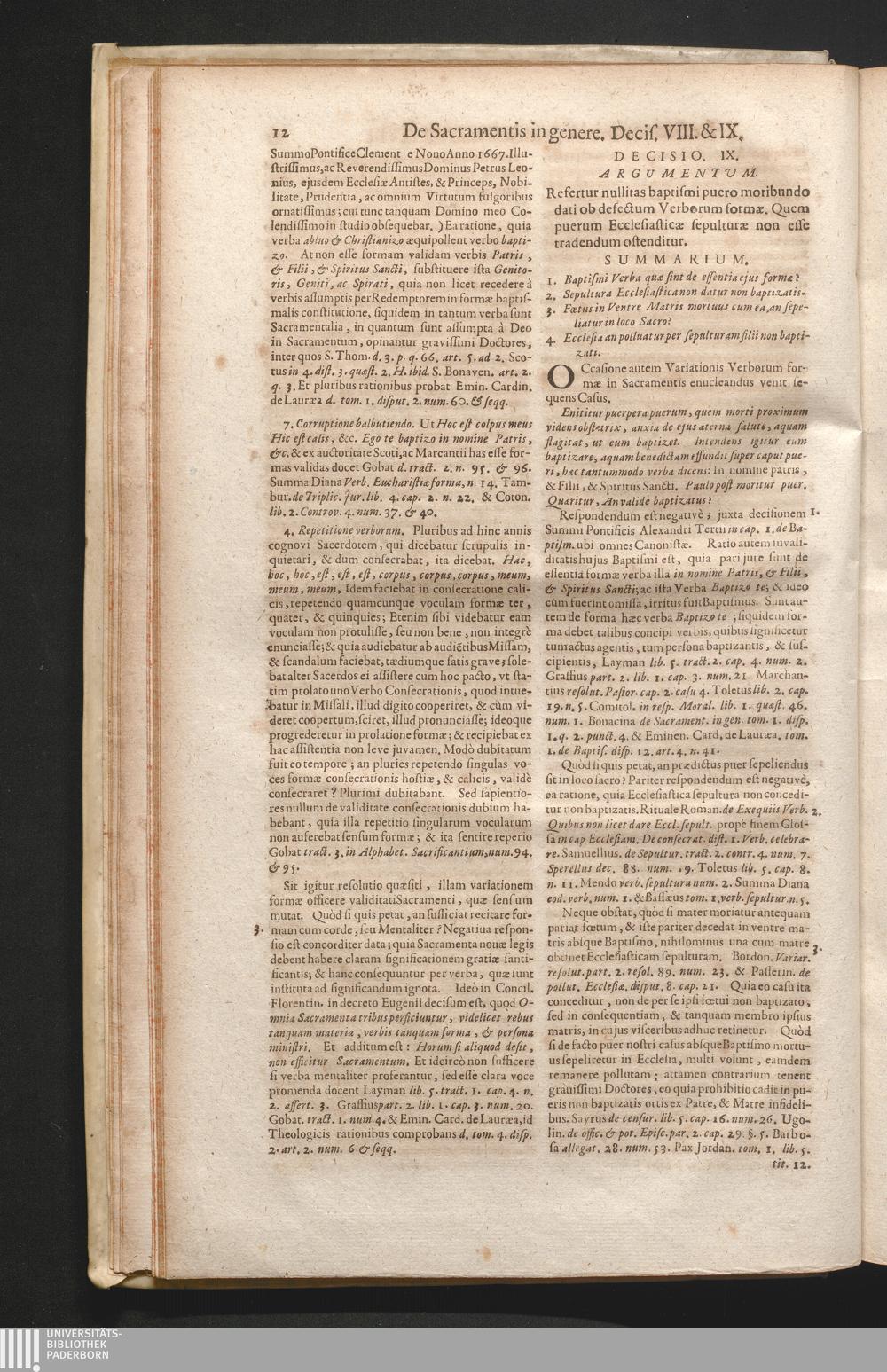 1,1 (1730) De Sacramentis In Genere Ac De Sacramentalibus Nec Non De Sacramentis Baptismi, Confirmationis, atque Extremæ Unctionis Decisiones / Auctore Joanne Clericato Præposito Patavino Juris Utriusque Doctore Olim in Curia Episcopali Patavina Advocato, & Promotore Fiscali, deinde Auditore, ac demùm sub Regimine Eminentissimi, ac Reverentissimi S.M. Gregorii Card. Barbadici Episcopo Patavini Vicario Generali