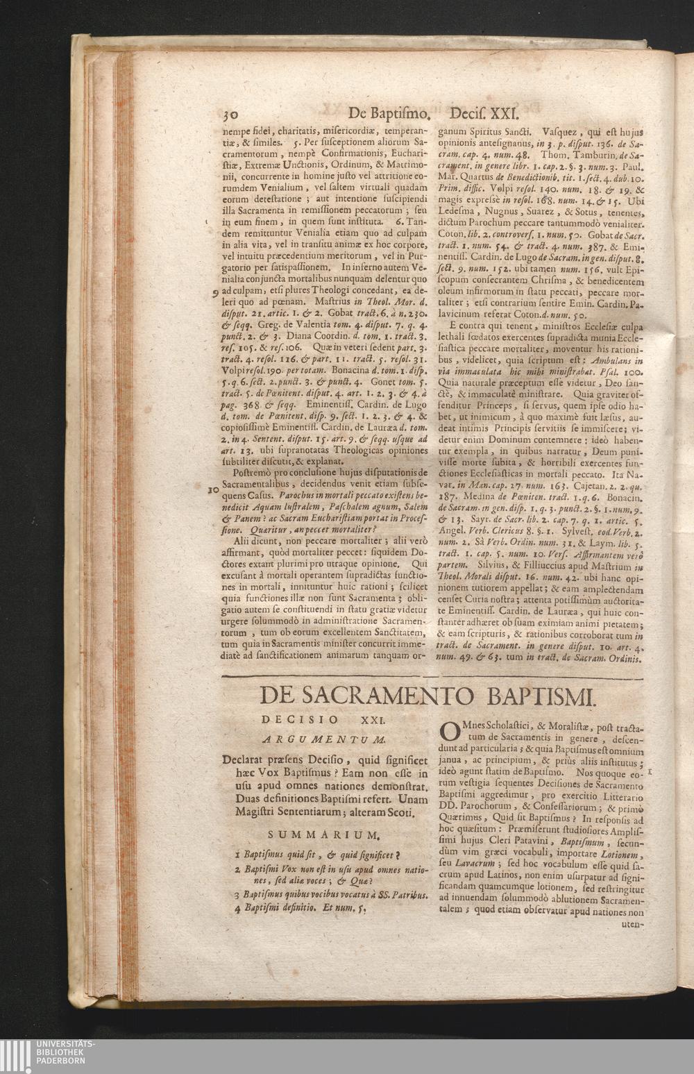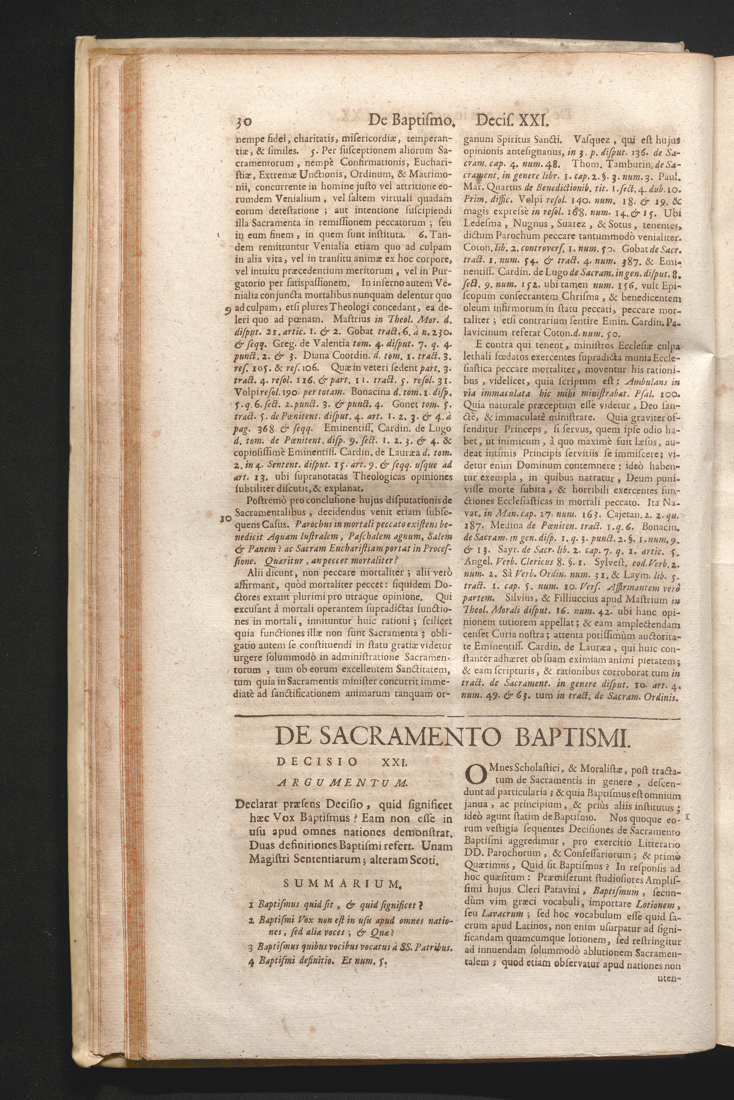 1,1 (1730) De Sacramentis In Genere Ac De Sacramentalibus Nec Non De Sacramentis Baptismi, Confirmationis, atque Extremæ Unctionis Decisiones / Auctore Joanne Clericato Præposito Patavino Juris Utriusque Doctore Olim in Curia Episcopali Patavina Advocato, & Promotore Fiscali, deinde Auditore, ac demùm sub Regimine Eminentissimi, ac Reverentissimi S.M. Gregorii Card. Barbadici Episcopo Patavini Vicario Generali