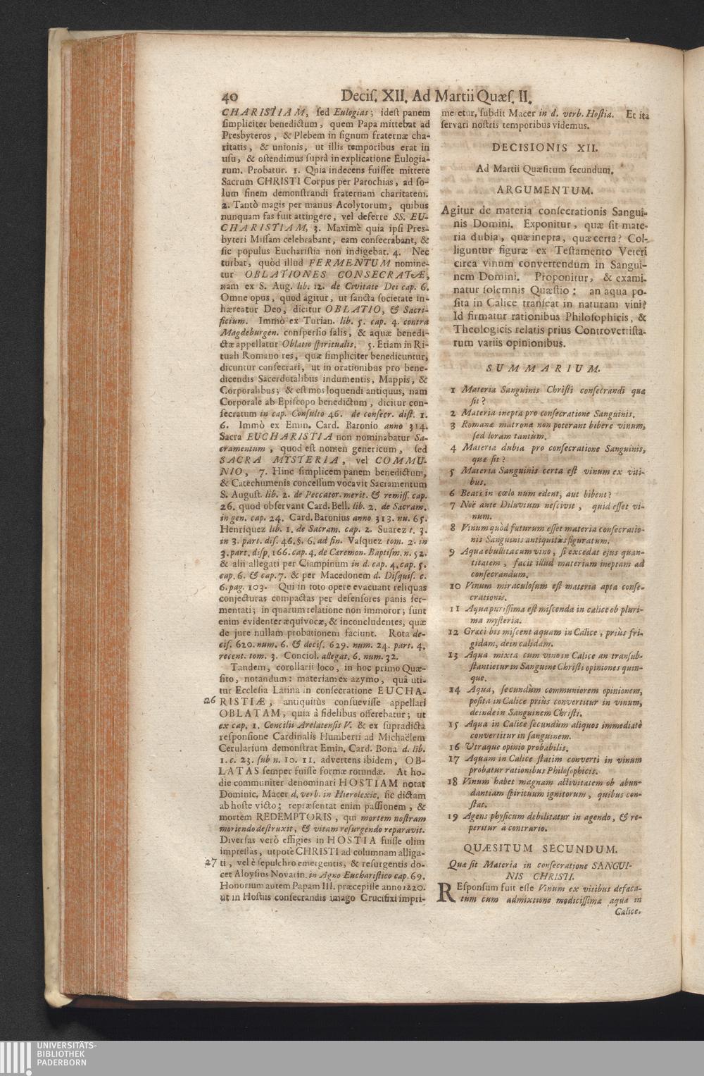 1,2 (1730) De Venerabili Eucharistiæ Sacramento Decisiones Theologico-Legales / Auctore Joanne Clericato Præposito Patavino Juris Utriusque Doctore Olim in Curia Episcopali Patavina Advocato, & Promotore Fiscali, deinde Auditore, ac demùm sub Regimine Eminentissimi, ac Reverentissimi S.M. Gregorii Card. Barbadici Episcopo Patavini Vicario Generali