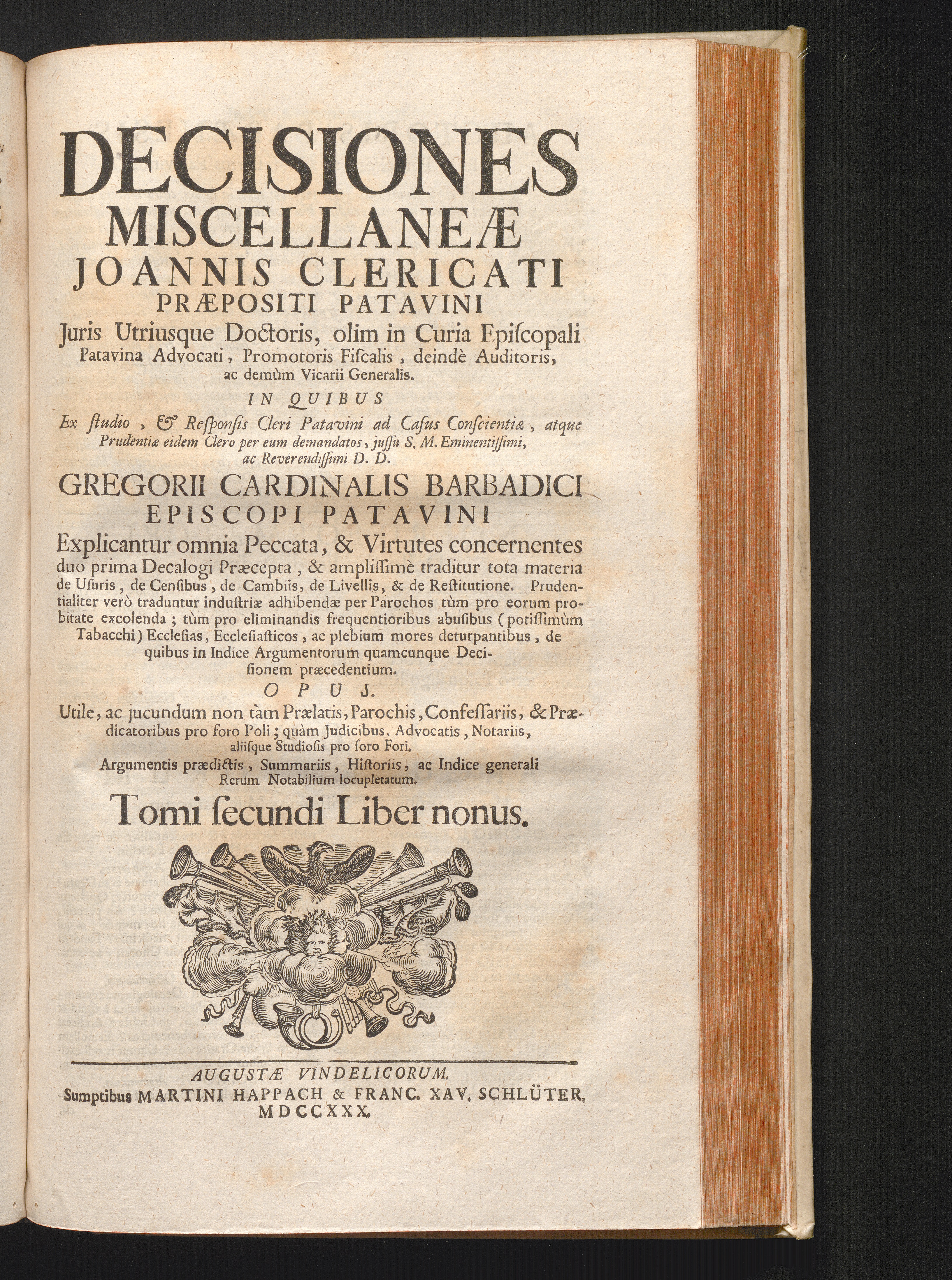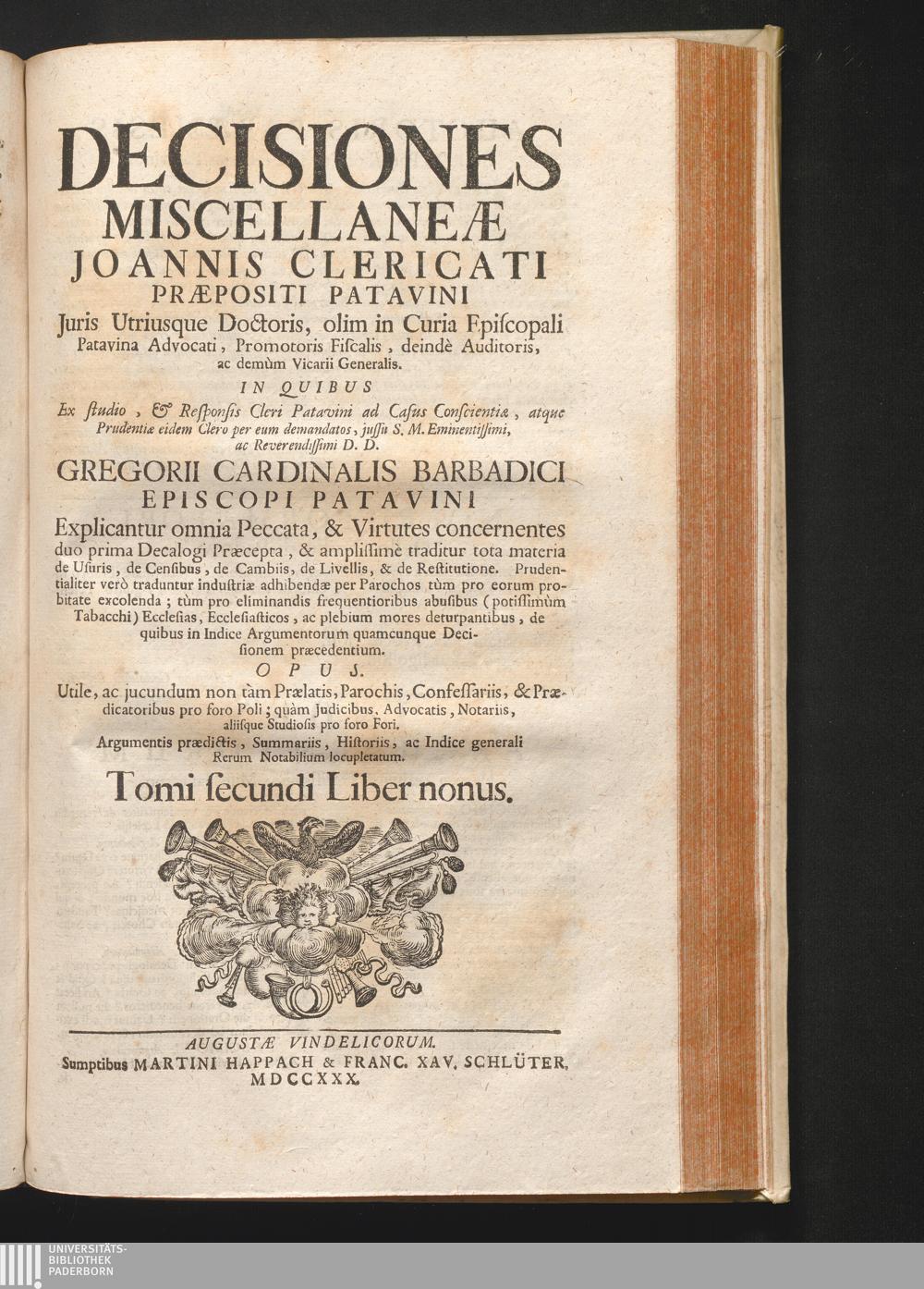 2,9 (1730) Decisiones Miscellanæ / Auctore Joanne Clericato Præposito Patavino Juris Utriusque Doctore Olim in Curia Episcopali Patavina Advocato, & Promotore Fiscali, deinde Auditore, ac demùm sub Regimine Eminentissimi, ac Reverentissimi S.M. Gregorii Card. Barbadici Episcopo Patavini Vicario Generali