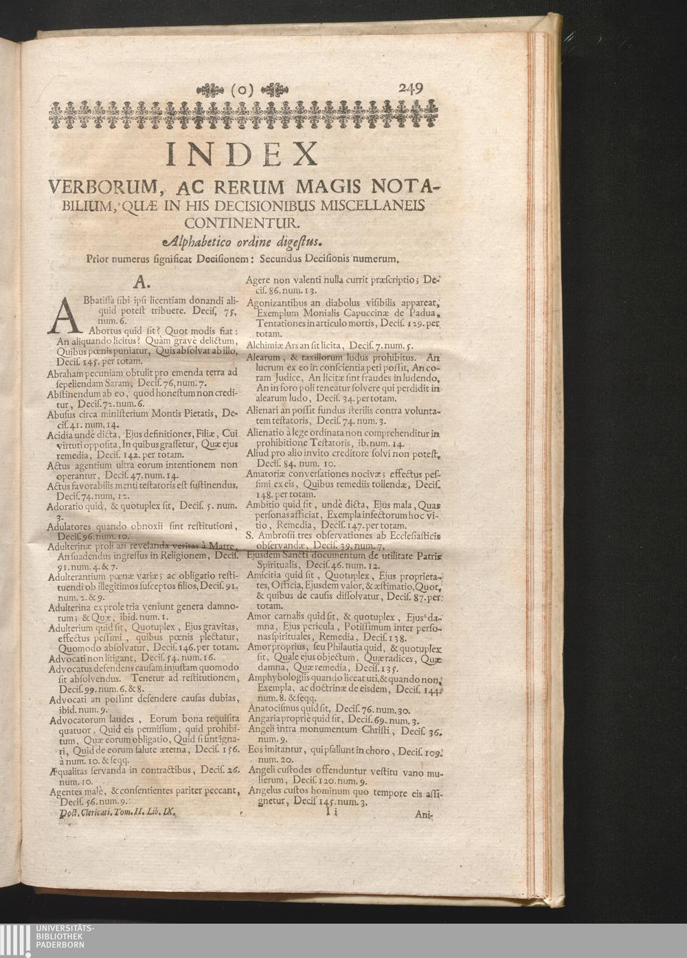 2,9 (1730) Decisiones Miscellanæ / Auctore Joanne Clericato Præposito Patavino Juris Utriusque Doctore Olim in Curia Episcopali Patavina Advocato, & Promotore Fiscali, deinde Auditore, ac demùm sub Regimine Eminentissimi, ac Reverentissimi S.M. Gregorii Card. Barbadici Episcopo Patavini Vicario Generali