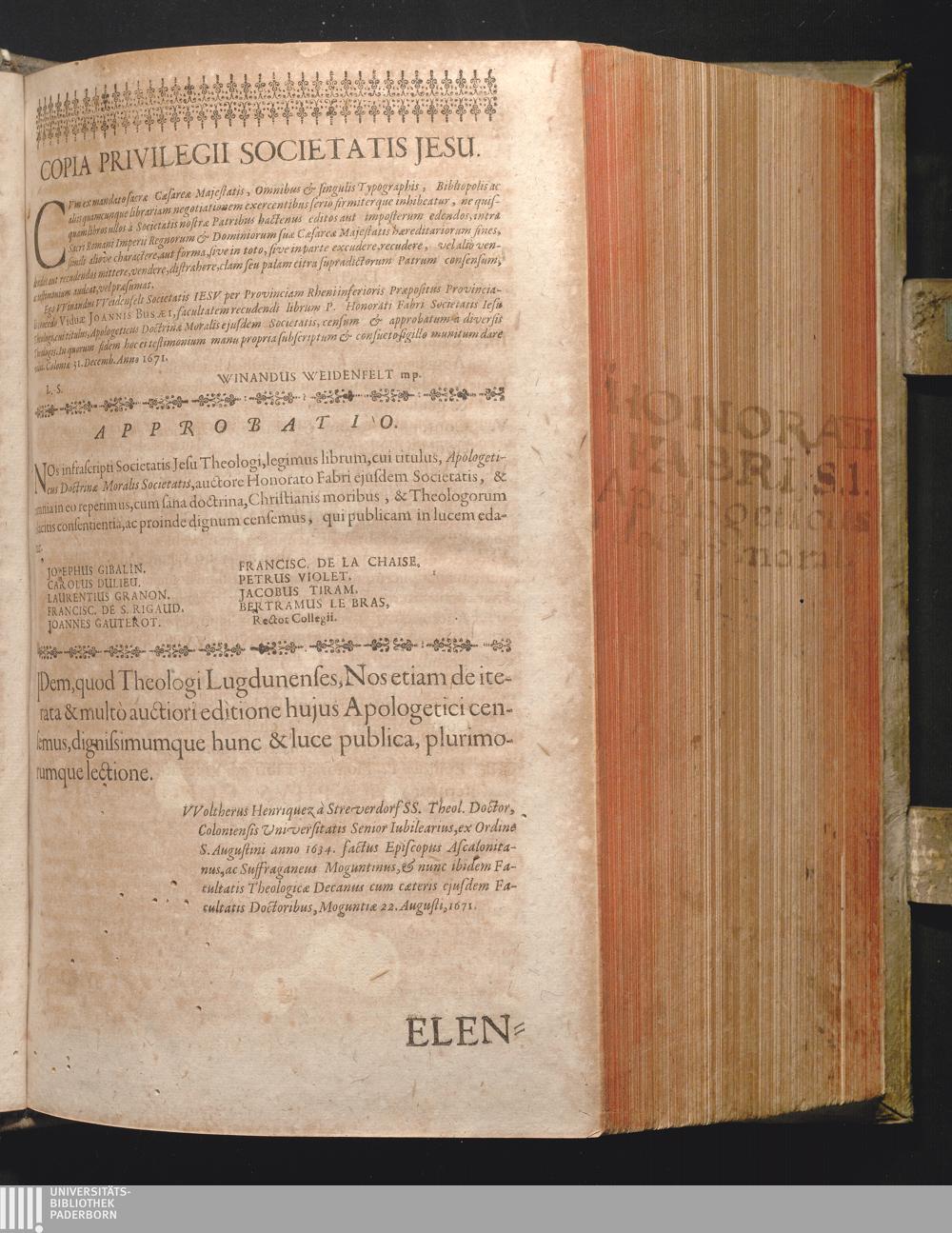 R. P. Honorati Fabri, Societatis Jesu Theologi, Apologeticus Doctrinæ Moralis Eiusdem Societatis : In Quo Variis Tractatibus, Diversorum Auctorum Opuscula confutantur; quorum nomina sequens Elenchus dabit; & selectæ quædam morales quæstiones discutiuntur ; In Duas Partes Commode Sectus: Cum Indicibus Tractatuum, & Rerum præcipuarum