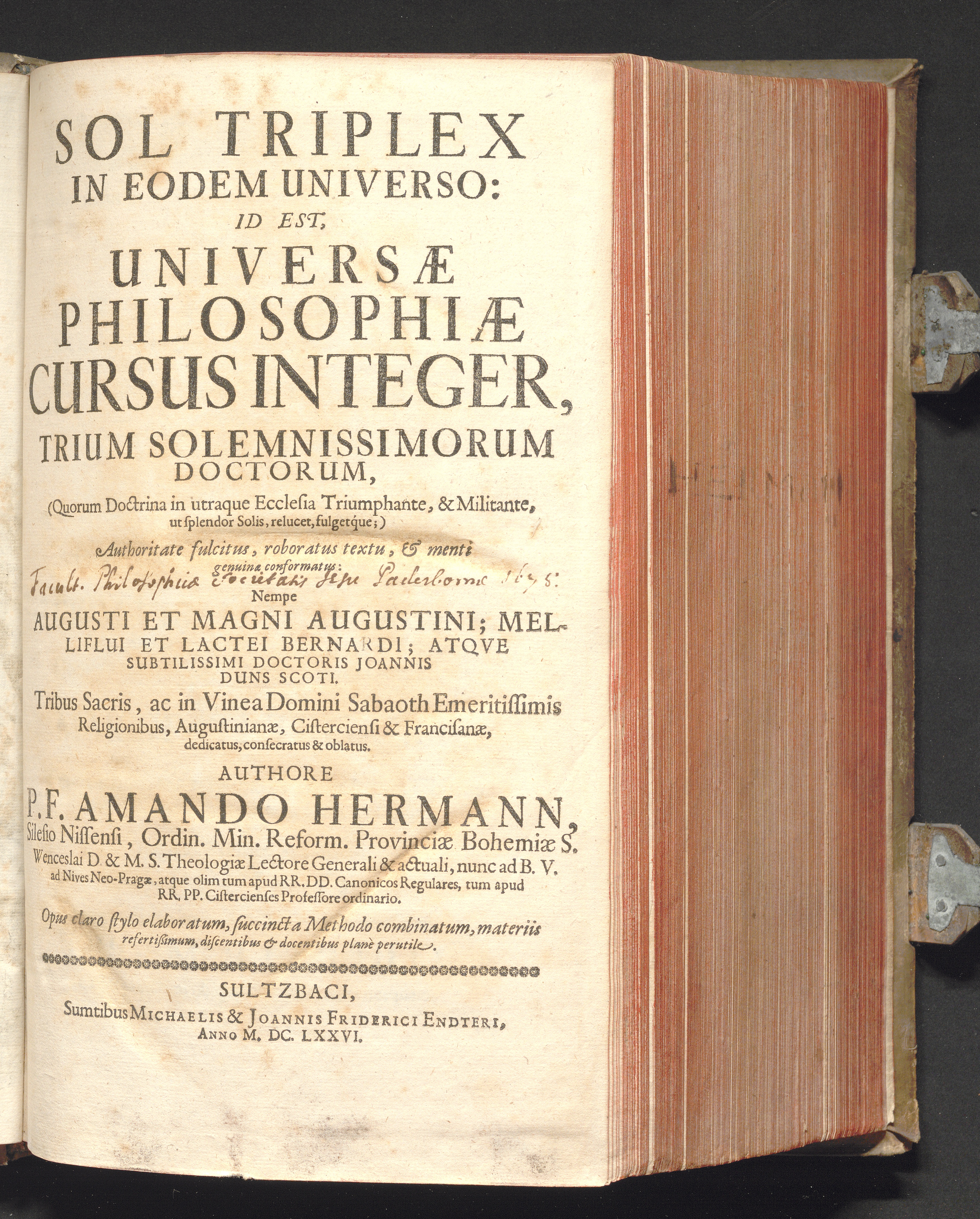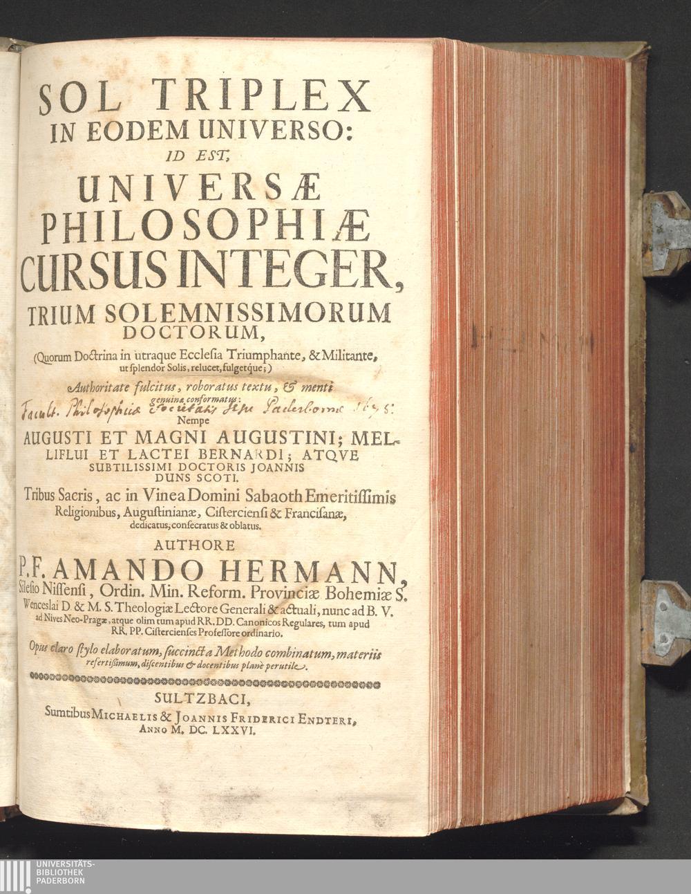 Sol Triplex In Eodem Universo : Id Est, Universæ Philosophiæ Cursus Integer, Trium Solemnissimorum Doctorum, (Quorum Doctrina in utraque Ecclesia Triumphante, & Militante, ut splendor Solis, relucet, fulgetque;) Authoritate fulcitus, roboratus textu, & menti genuinæ conformatus: Nempe Augusti Et Magni Augustini; Melliflui Et Lactei Bernardi; Atqve Subtilissimi Doctoris Joannis Duns Scoti. Tribus Sacris, ac in Vinea Domini Sabaoth Emeritissimis Religionibus, Augustinianæ, Cisterciensi et Franciscanæ, dedicatus, consecratus & oblatus / Authore P.F. Amando Hermann, Silesio Nissensi, Ordin. Min. Reform. Provinciae Bohemiae S. Wenceslai D. ...