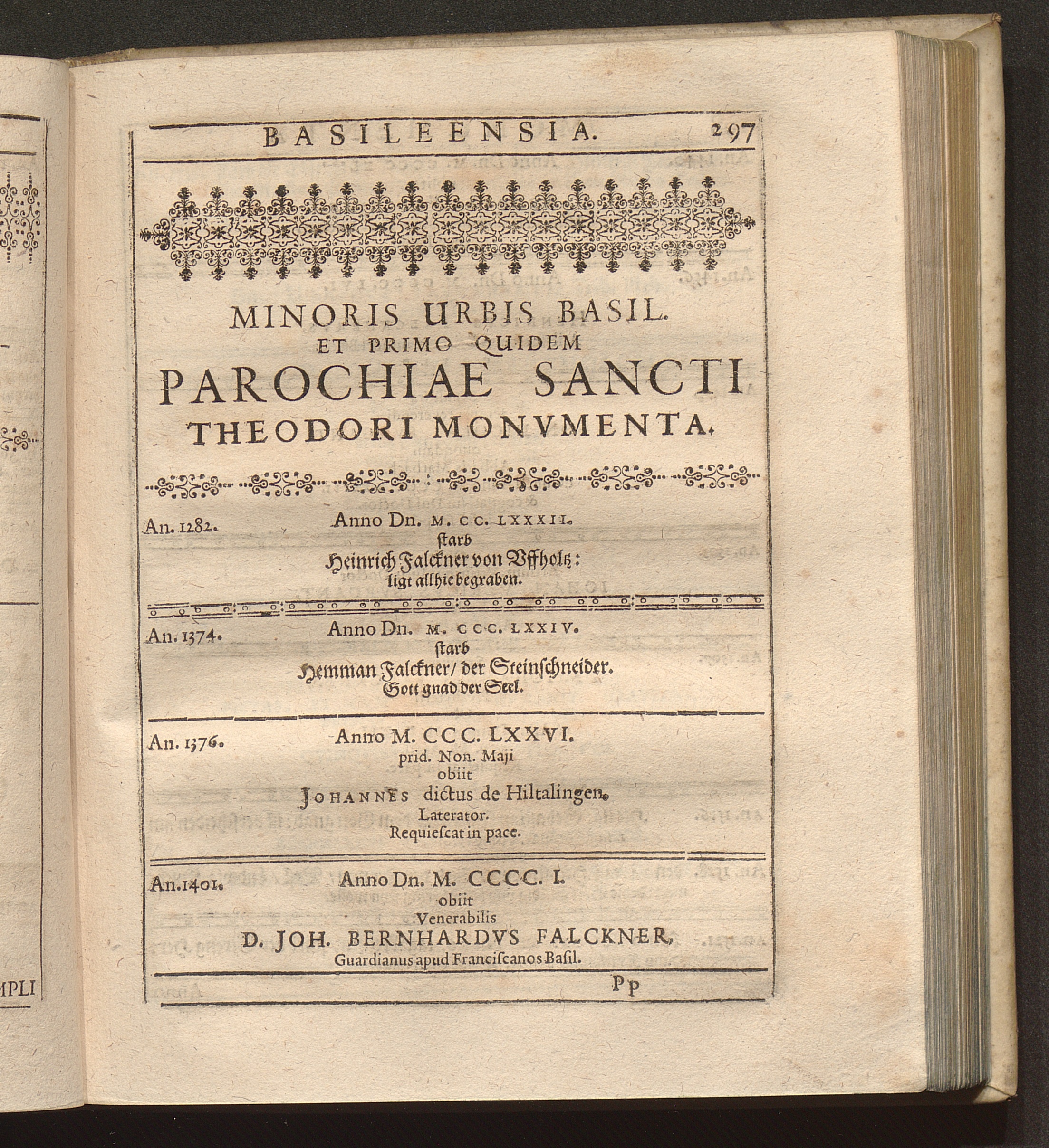 Basilea Sepulta Retecta Continuata. Hoc est: Tam Urbis quàm Agri Basileensis Monumenta Sepulchralia, Templorum Omnium, Curiae, Academiae, Aliarumque Aedium Publicarum Latinae Et Germanicae Inscriptiones : Nunc verò in ordinatam annorum seriem locata & ad annum M. DC. LXI. continuata / Olim quidem à Reverendo & Clariß. Dn. M. Johanne Grossio, Pastore Leonhardino ad annum 1619. sparsim collecta