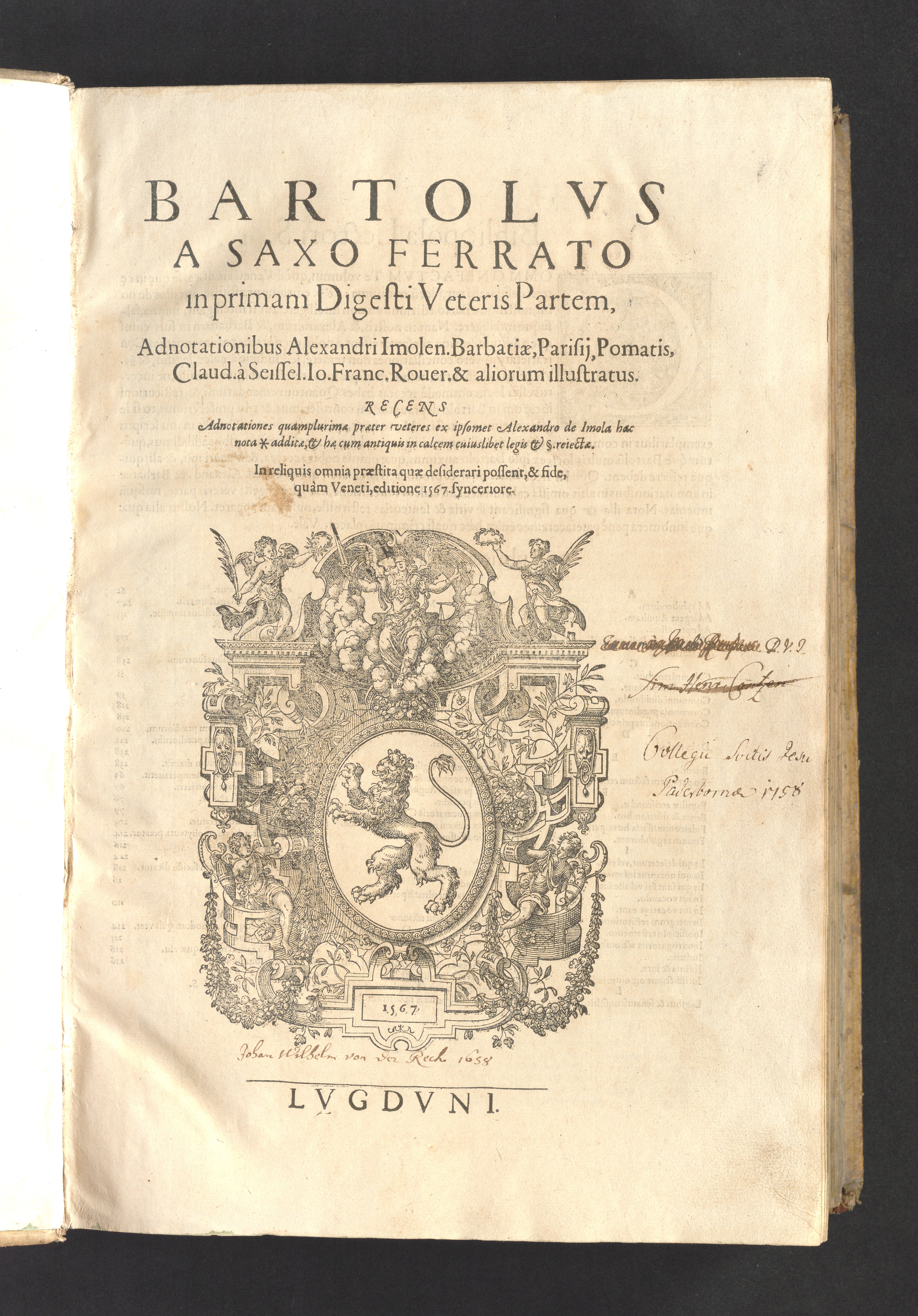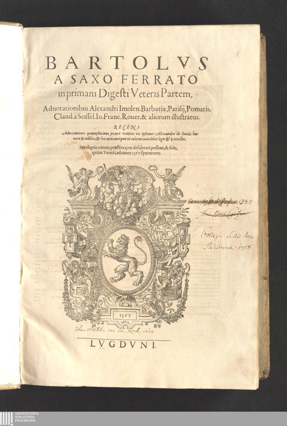 Bartolvs A Saxo Ferrato in primam Digesti Veteris Partem / Adnotationibus Alexandri Imolen. Barbatiæ, Parisij, Pomatis, Claud. à Seissel. Io. Franc. Rouer. & aliorum illustratus. Recens Adnotationes quamplurimæ præter ex ipsomet Alexandro de Imola ... reiectæ. In reliquis omnia præstita ... synceriore