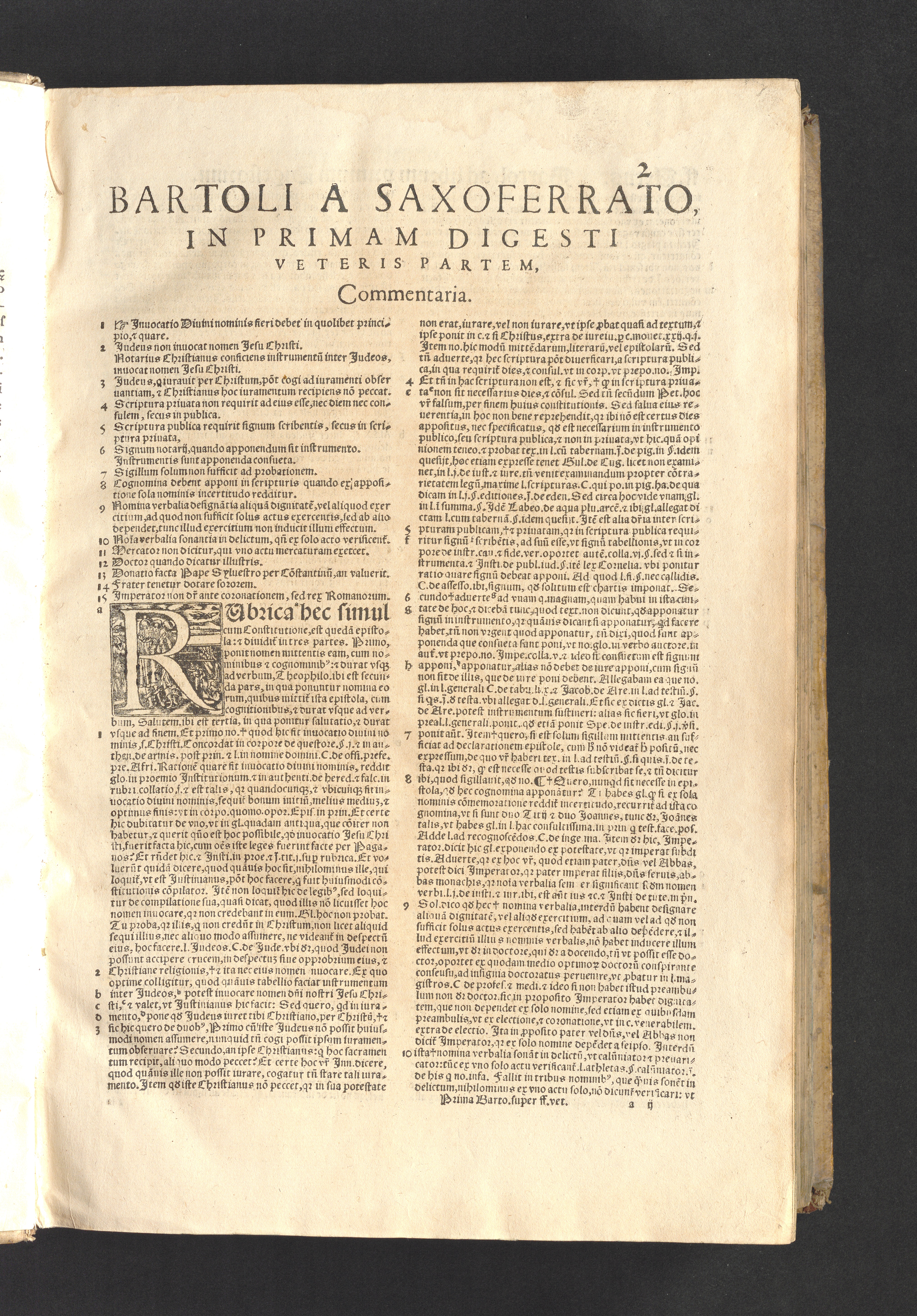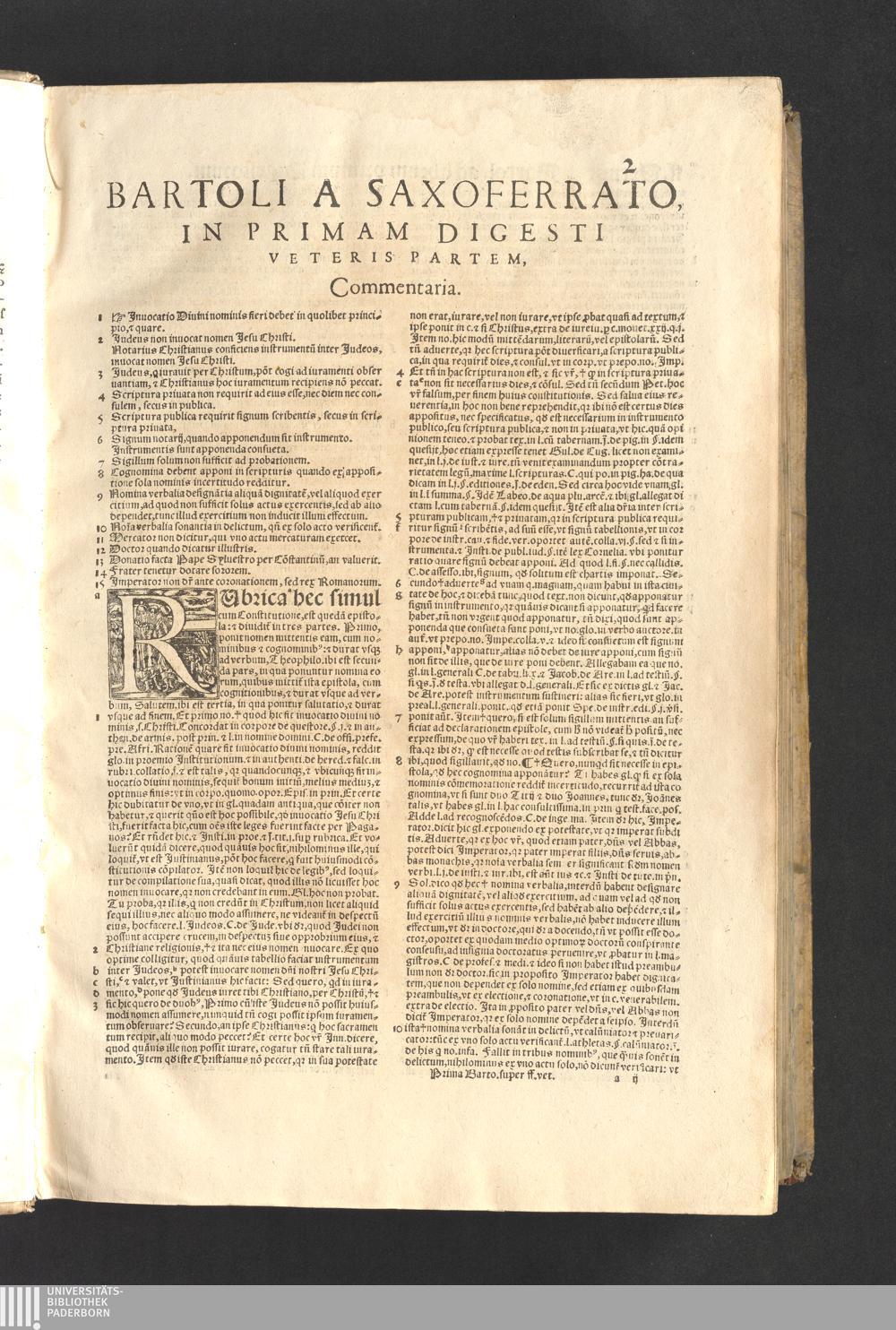 Bartolvs A Saxo Ferrato in primam Digesti Veteris Partem / Adnotationibus Alexandri Imolen. Barbatiæ, Parisij, Pomatis, Claud. à Seissel. Io. Franc. Rouer. & aliorum illustratus. Recens Adnotationes quamplurimæ præter ex ipsomet Alexandro de Imola ... reiectæ. In reliquis omnia præstita ... synceriore