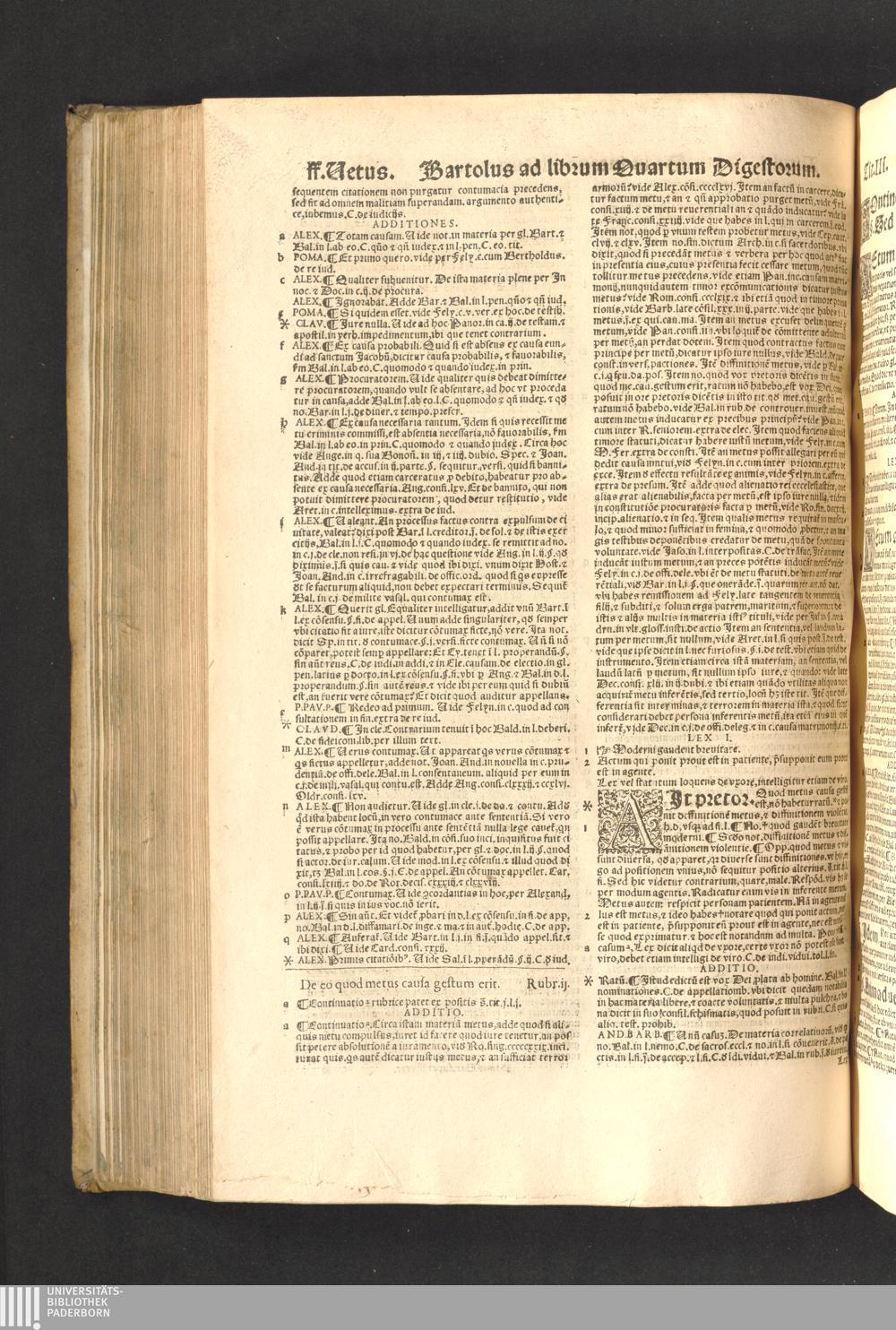 Bartolvs A Saxo Ferrato in primam Digesti Veteris Partem / Adnotationibus Alexandri Imolen. Barbatiæ, Parisij, Pomatis, Claud. à Seissel. Io. Franc. Rouer. & aliorum illustratus. Recens Adnotationes quamplurimæ præter ex ipsomet Alexandro de Imola ... reiectæ. In reliquis omnia præstita ... synceriore