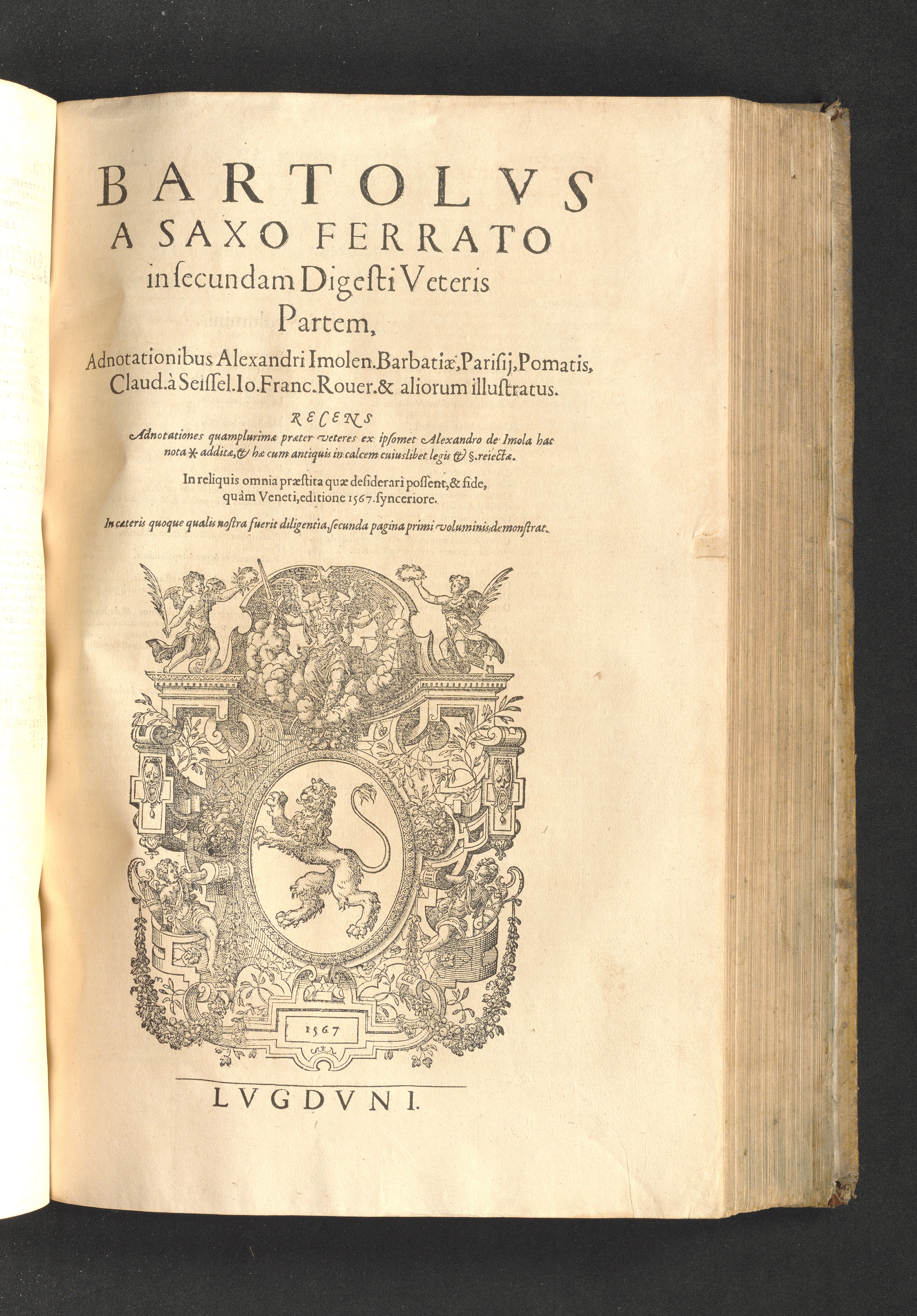 Bartolvs A Saxo Ferrato in primam Digesti Veteris Partem / Adnotationibus Alexandri Imolen. Barbatiæ, Parisij, Pomatis, Claud. à Seissel. Io. Franc. Rouer. & aliorum illustratus. Recens Adnotationes quamplurimæ præter ex ipsomet Alexandro de Imola ... reiectæ. In reliquis omnia præstita ... synceriore