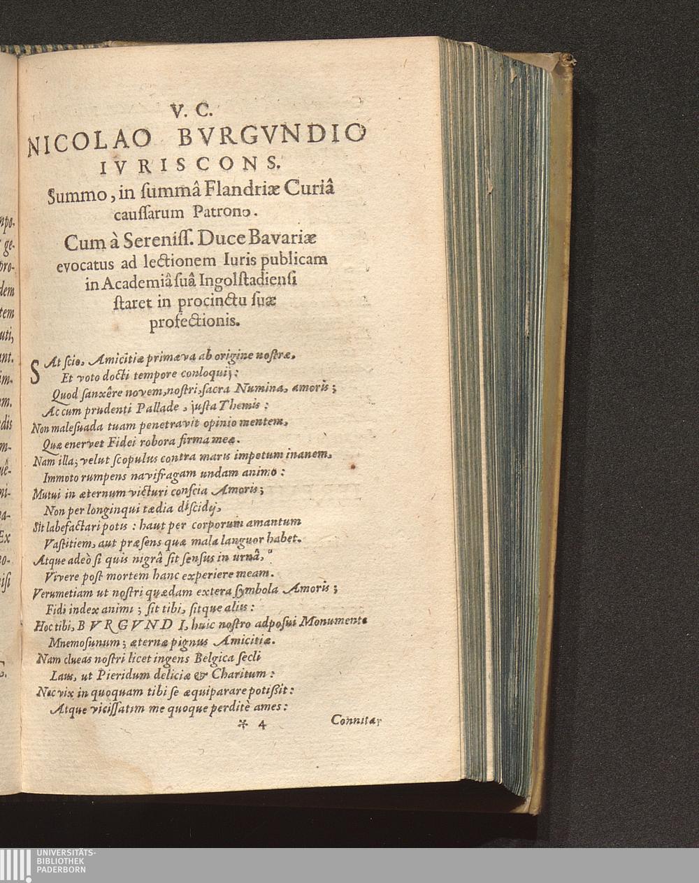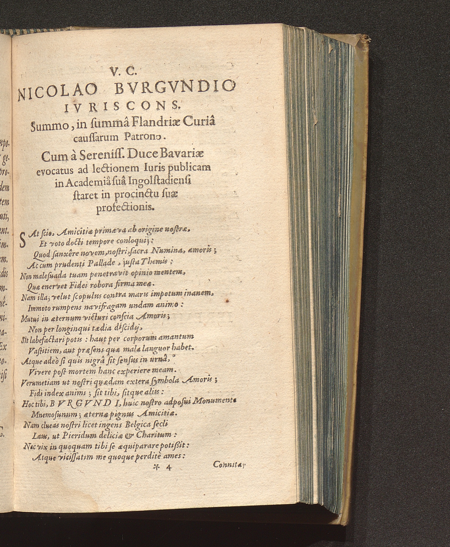 V. C. Nicolao Bvrgvndio Ivriscons. Summo, in summâ Flandriae Curiâ caussarum Patrono. Cum à Sereniss. Duce Bavariae evocatus ad lectionem Iuris publicam in Academiâ suâ Ingolstadiensi staret in procinctu suae profectionis.