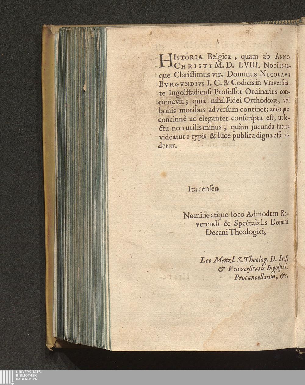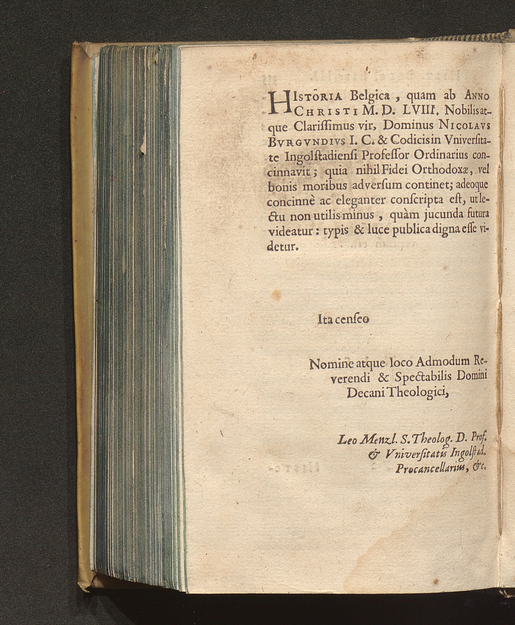 V. C. Nicolao Bvrgvndio Ivriscons. Summo, in summâ Flandriae Curiâ caussarum Patrono. Cum à Sereniss. Duce Bavariae evocatus ad lectionem Iuris publicam in Academiâ suâ Ingolstadiensi staret in procinctu suae profectionis.