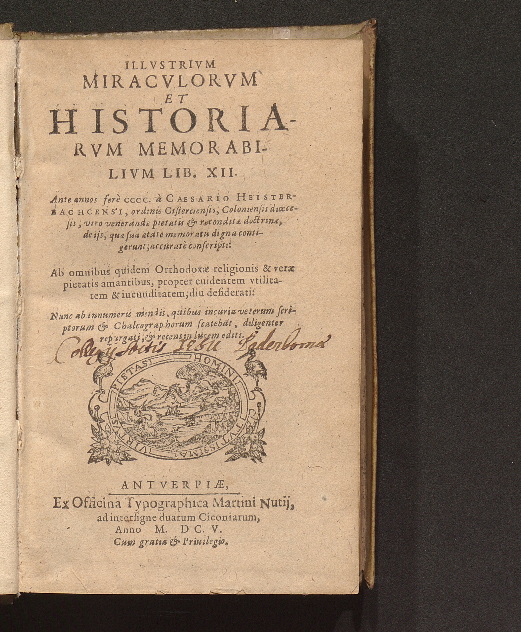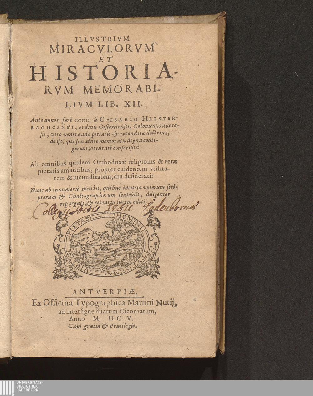 Illvstrivm Miracvlorvm Et Historiarvm Memorabilivm Lib. XII : Ante annos ferè CCCC. à Caesario Heisterbachcensi, ordinis Cisterciensis, Coloniensis dioecesis, viro venerandae pietatis & reconditae doctrinae, de ijs, quae sua aetate memoratu digna contigerunt, accuratè conscripti ; Ab omnibus quidem Orthodoxae religionis & verae pietatis amantibus, propter euidentem vtilitatem & iucunditatem, diu desiderati: Nunc ab innumeris mendis, quibus incuria veterum scriptorum & Chalcographorum scateba[n]t, diligenter repurgati & recens in lucem editi
