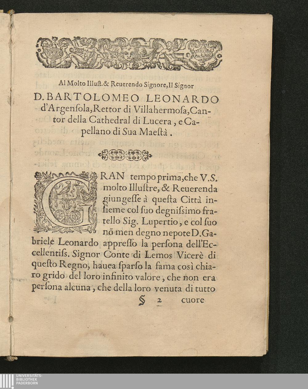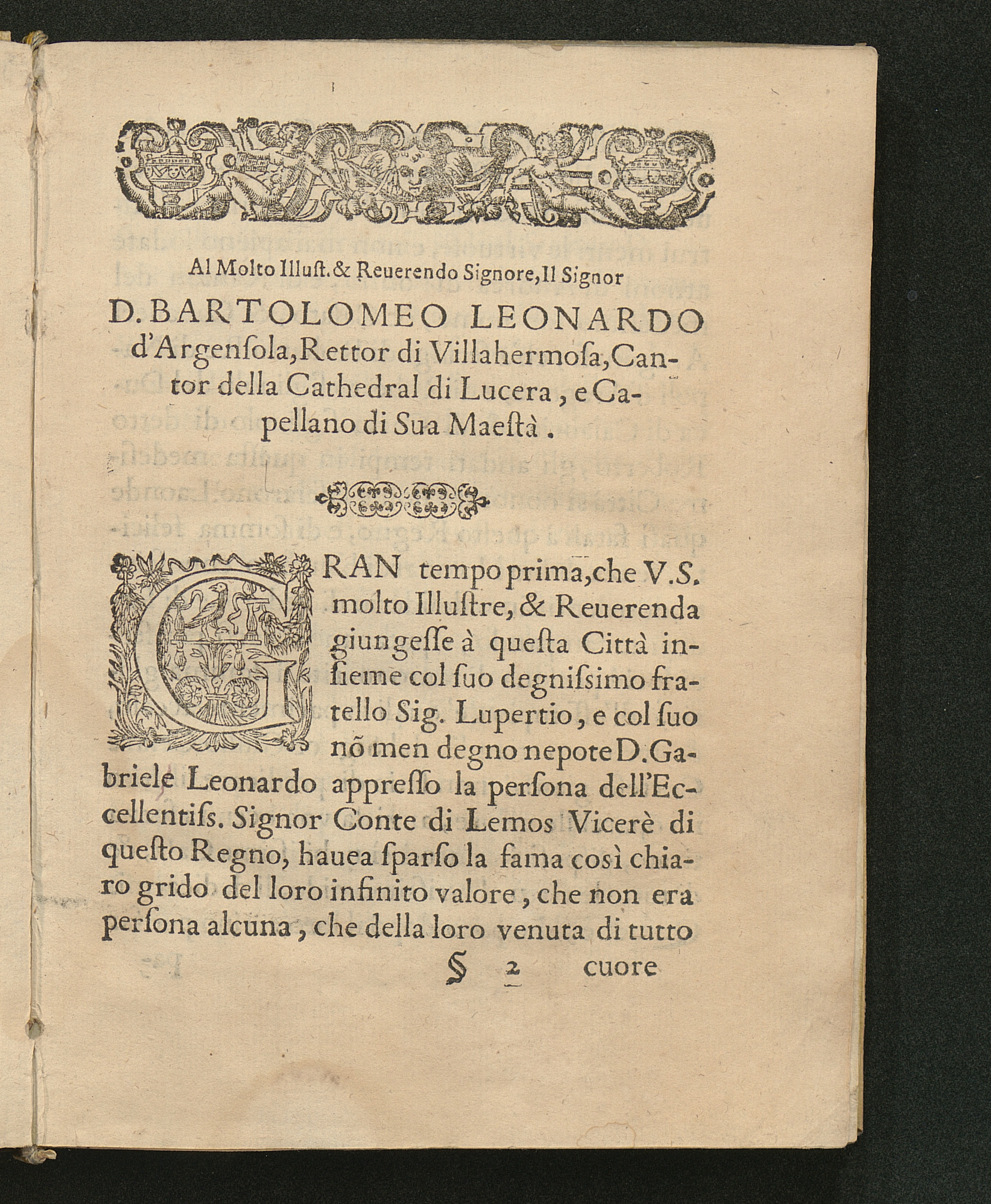 Al Molto Illust. & Reuerendo Signore, Il Signor D. Bartolomeo Leonardo d'Argensola,[...]