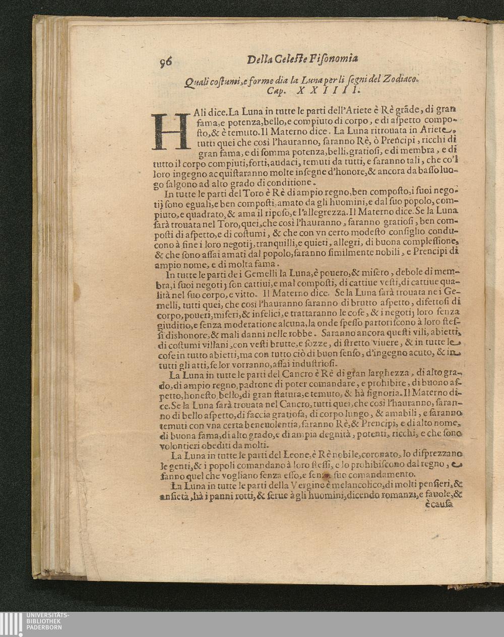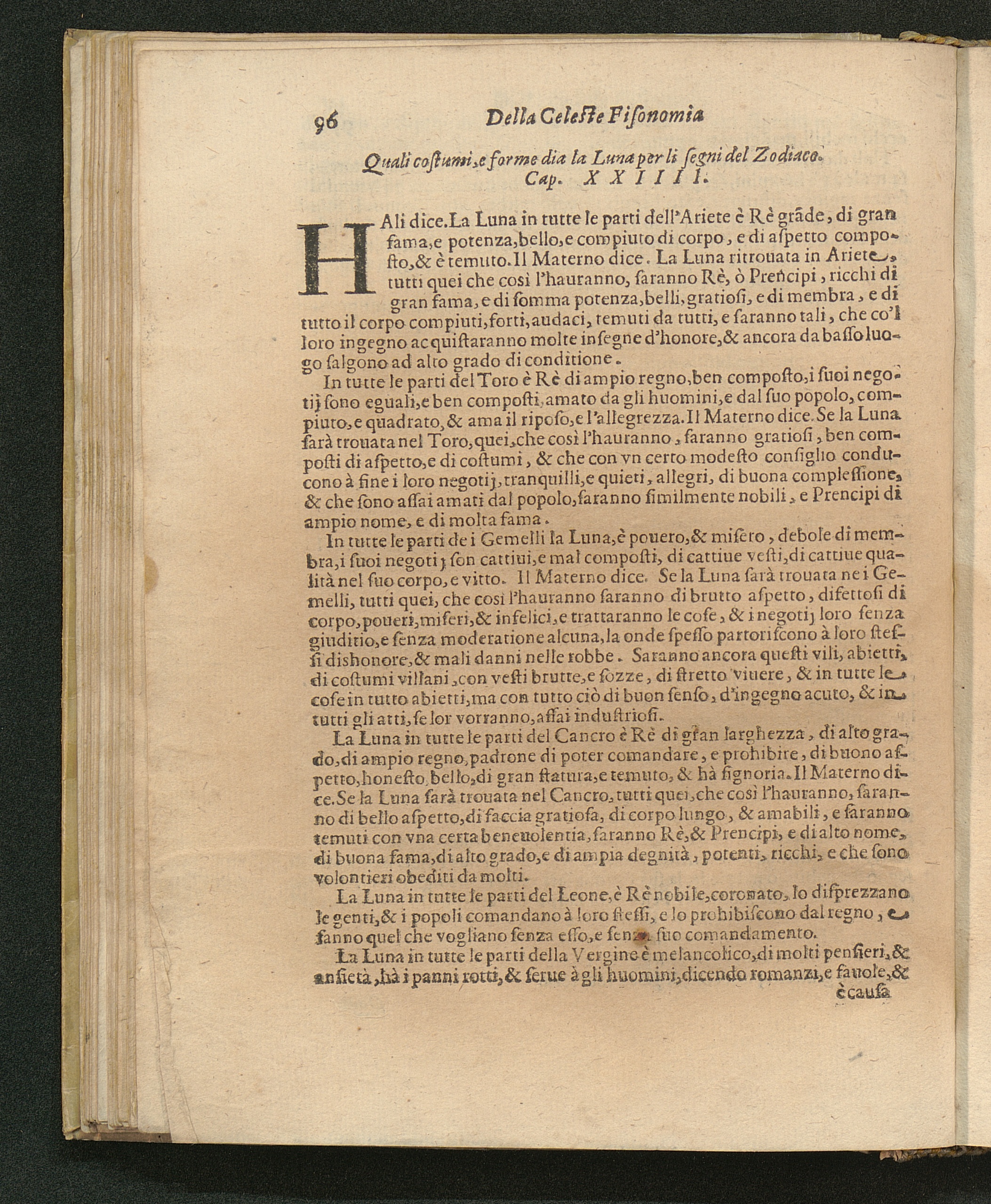Quali costumi, e forme dia la Luna per li segni del Zodiaco. Cap. 24.