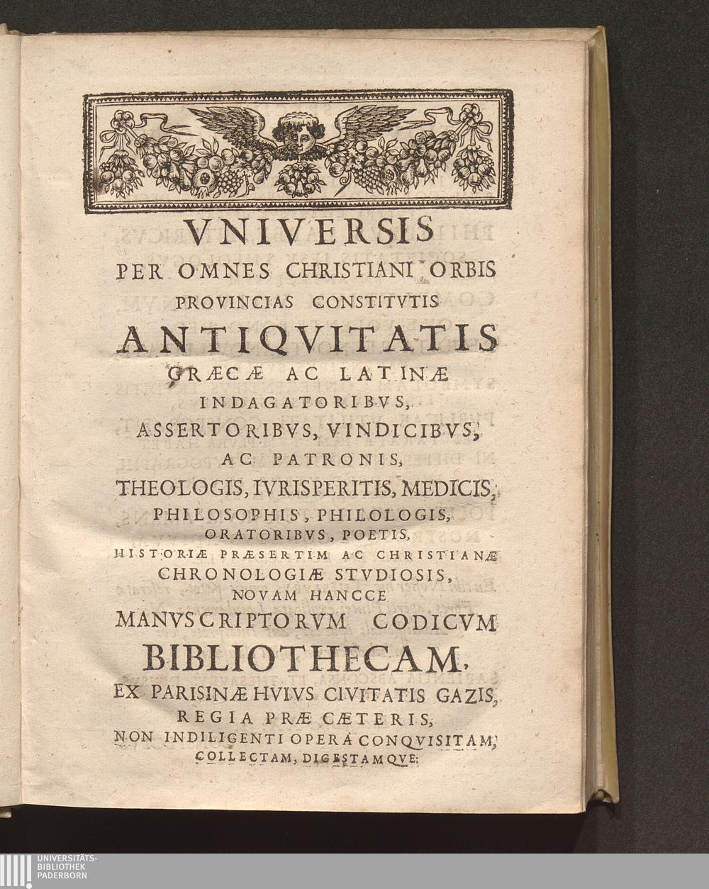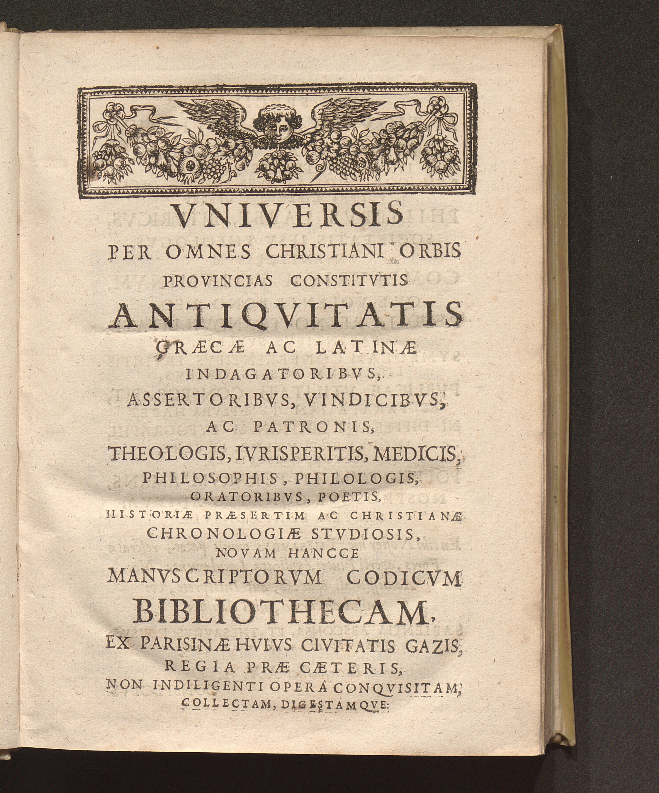 Philippi Labbei Bitvrici Societatis Iesv Presbyteri, Nova Bibliotheca Mss. Librorvm, Sive Specimen Antiqvarvm Lectionvm Latinarvm Et Græcarvm : In quatuor partes tributarum ; Cvm Coronide Dvplici, Poetica Et Libraria, Ac Supplementis decem