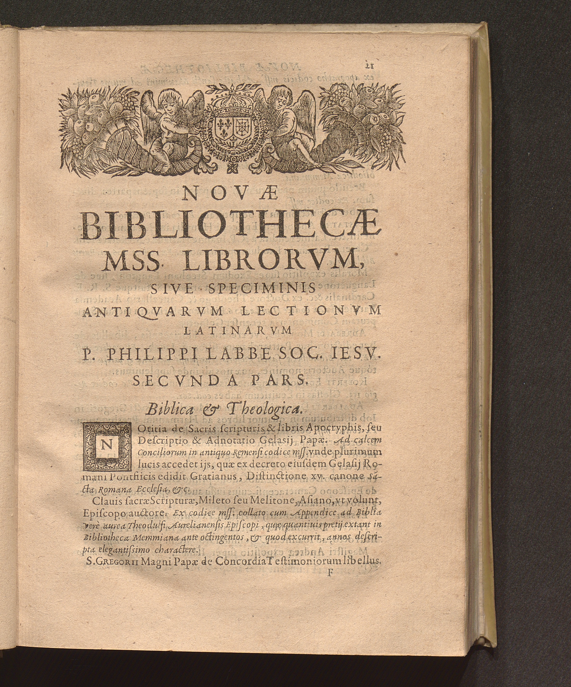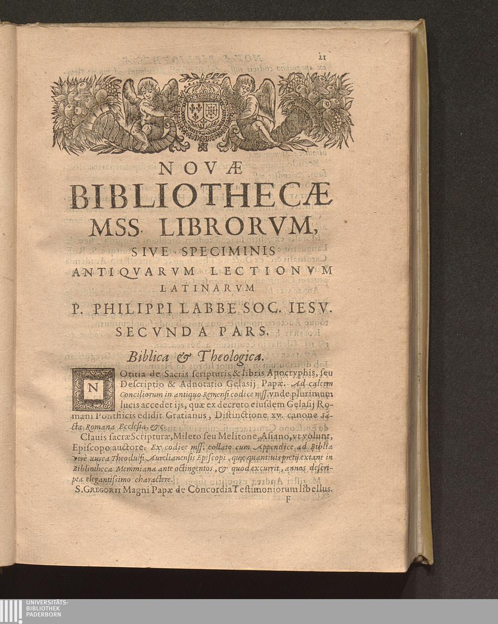 Philippi Labbei Bitvrici Societatis Iesv Presbyteri, Nova Bibliotheca Mss. Librorvm, Sive Specimen Antiqvarvm Lectionvm Latinarvm Et Græcarvm : In quatuor partes tributarum ; Cvm Coronide Dvplici, Poetica Et Libraria, Ac Supplementis decem