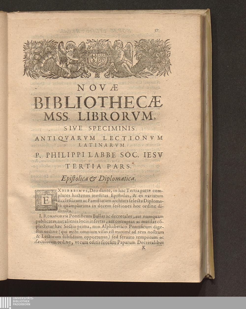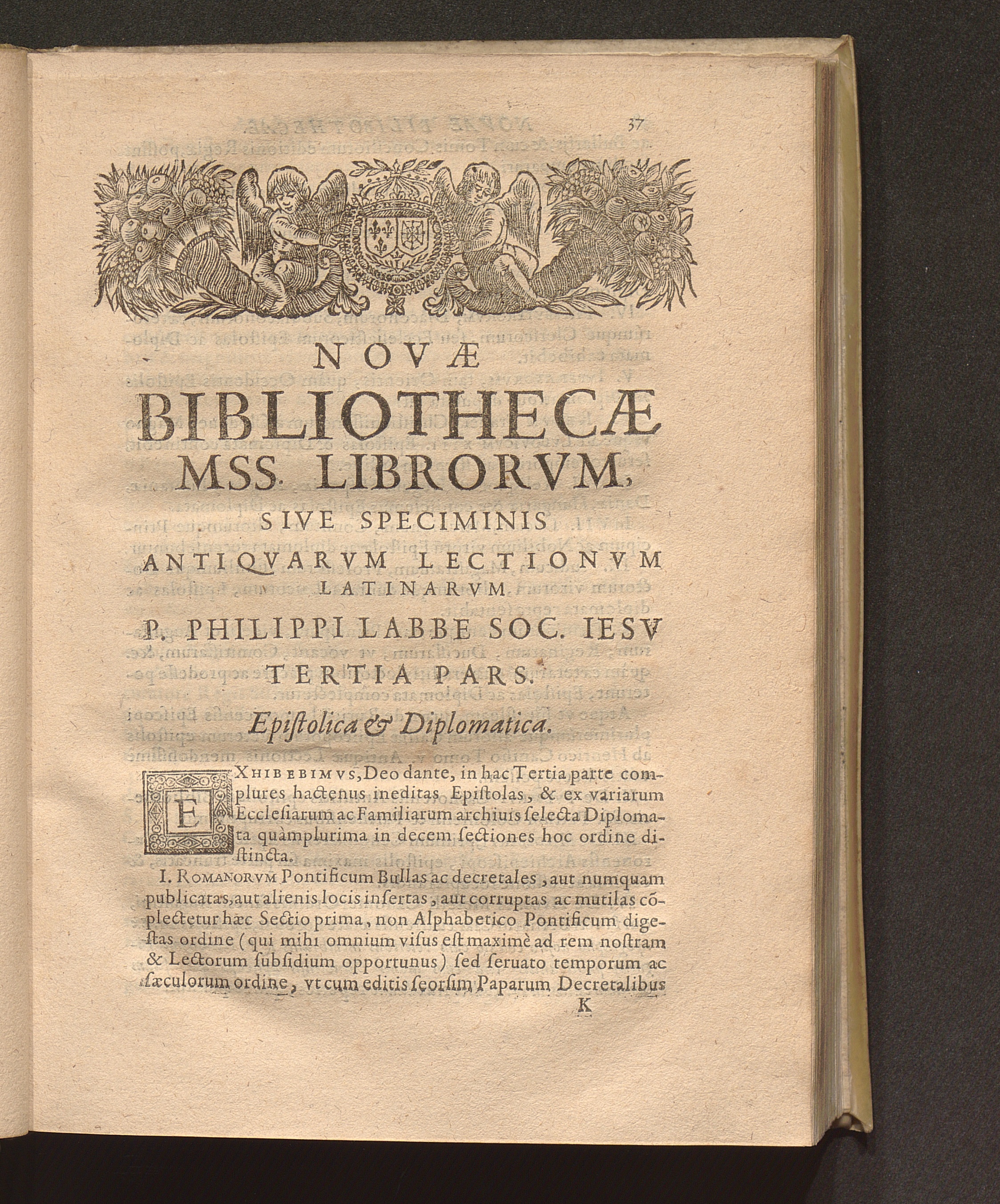 Philippi Labbei Bitvrici Societatis Iesv Presbyteri, Nova Bibliotheca Mss. Librorvm, Sive Specimen Antiqvarvm Lectionvm Latinarvm Et Græcarvm : In quatuor partes tributarum ; Cvm Coronide Dvplici, Poetica Et Libraria, Ac Supplementis decem