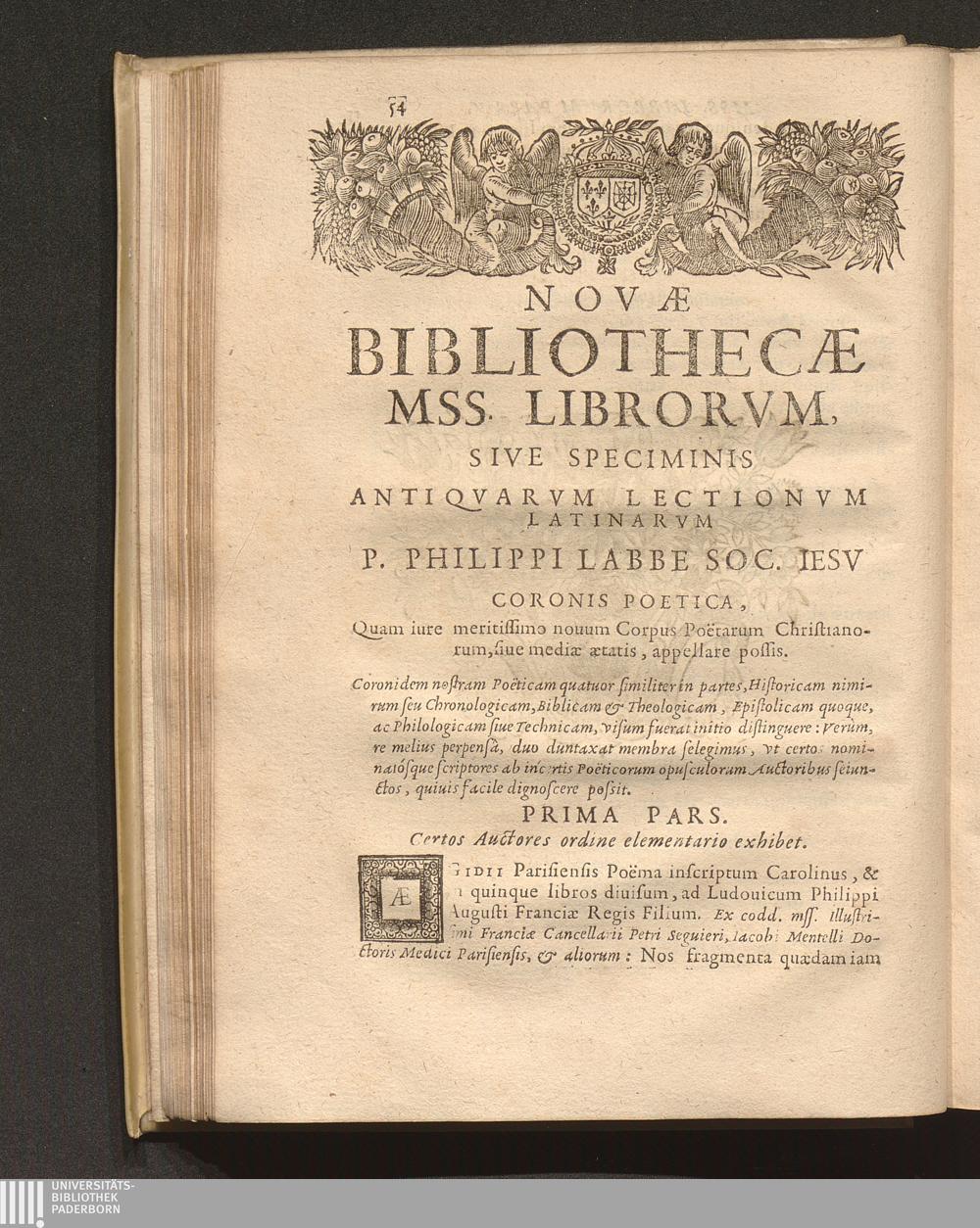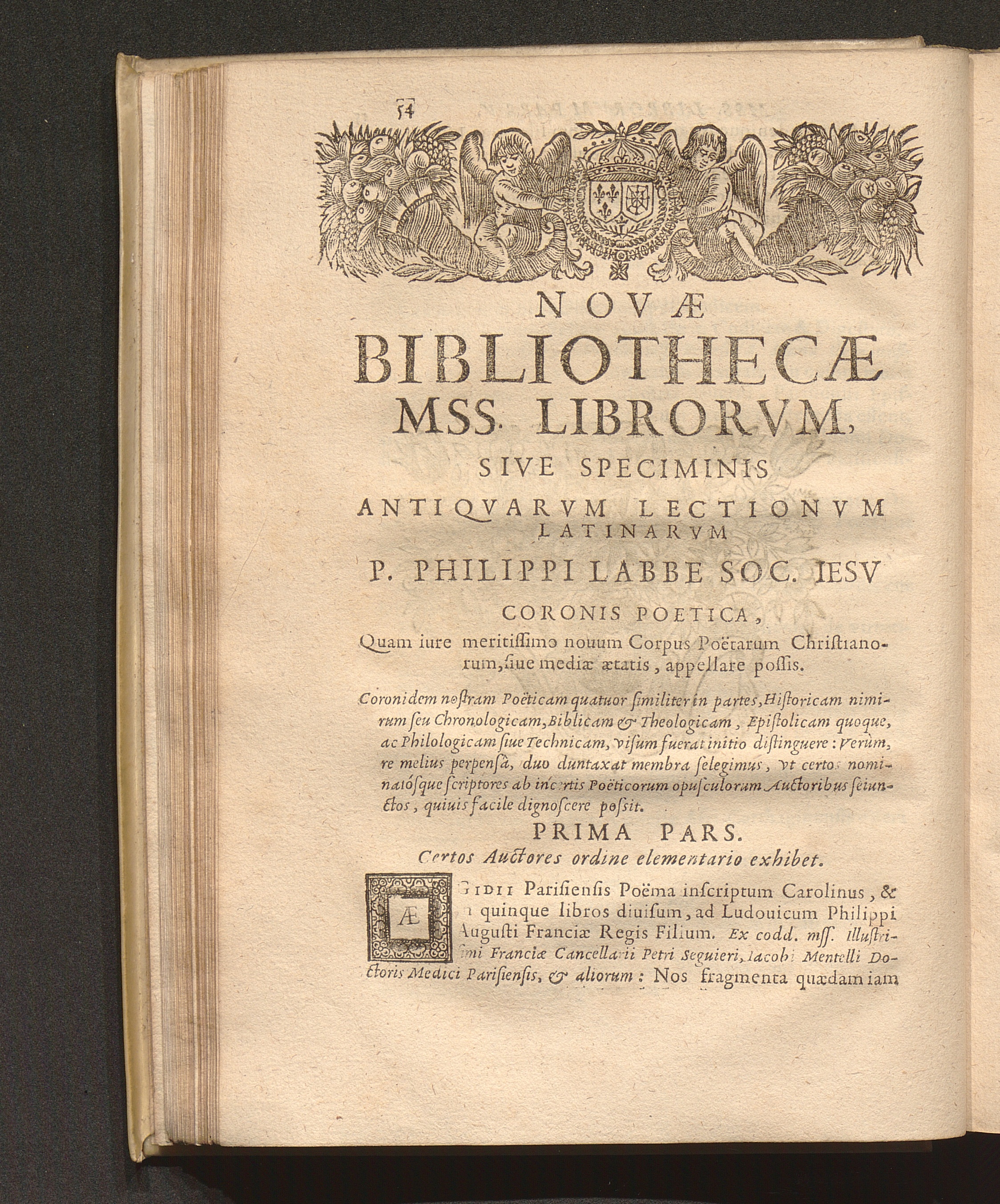 Philippi Labbei Bitvrici Societatis Iesv Presbyteri, Nova Bibliotheca Mss. Librorvm, Sive Specimen Antiqvarvm Lectionvm Latinarvm Et Græcarvm : In quatuor partes tributarum ; Cvm Coronide Dvplici, Poetica Et Libraria, Ac Supplementis decem