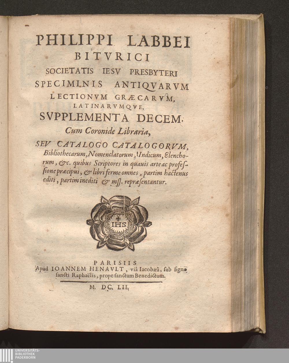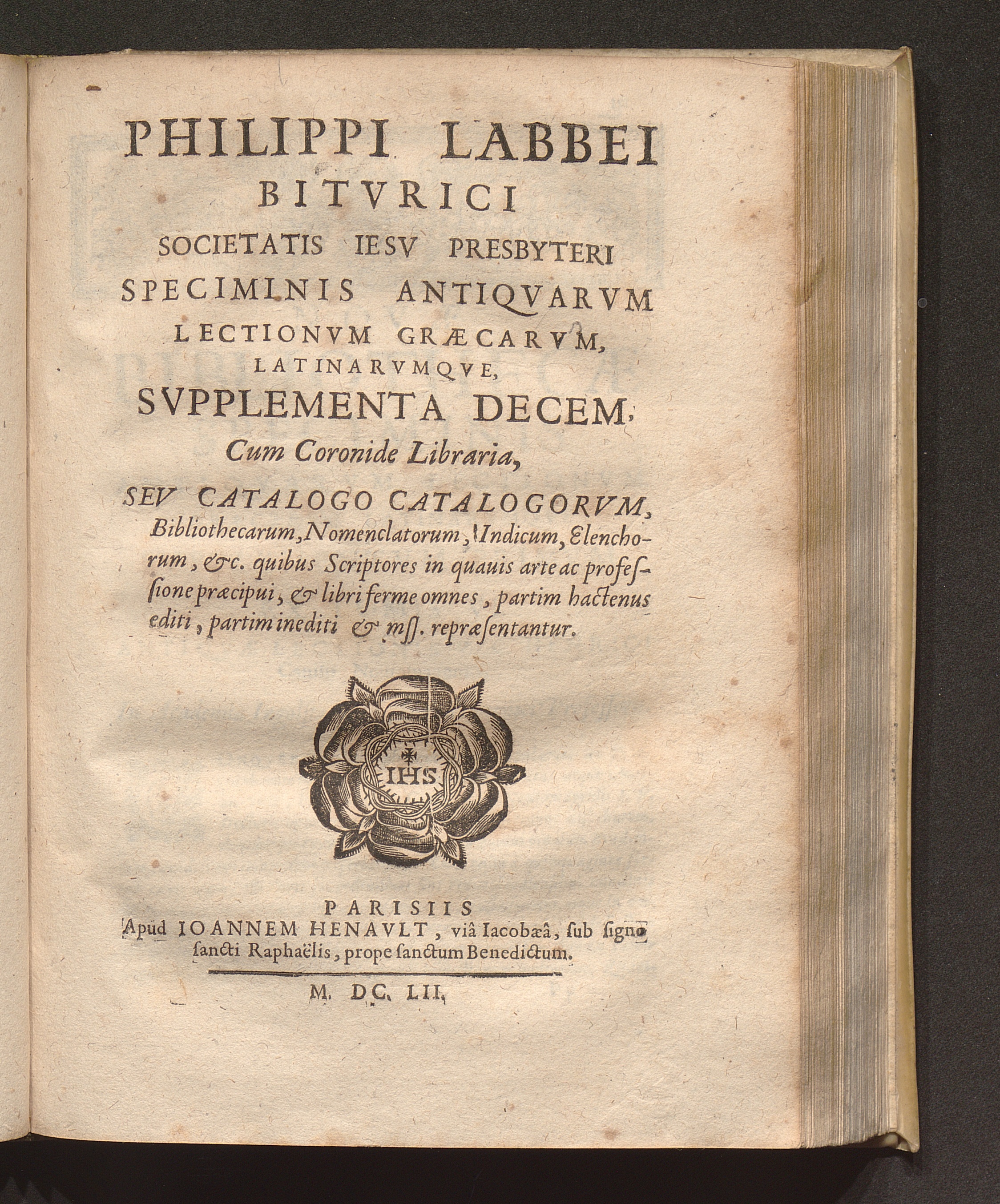 Philippi Labbei Bitvrici Societatis Iesv Presbyteri, Nova Bibliotheca Mss. Librorvm, Sive Specimen Antiqvarvm Lectionvm Latinarvm Et Græcarvm : In quatuor partes tributarum ; Cvm Coronide Dvplici, Poetica Et Libraria, Ac Supplementis decem