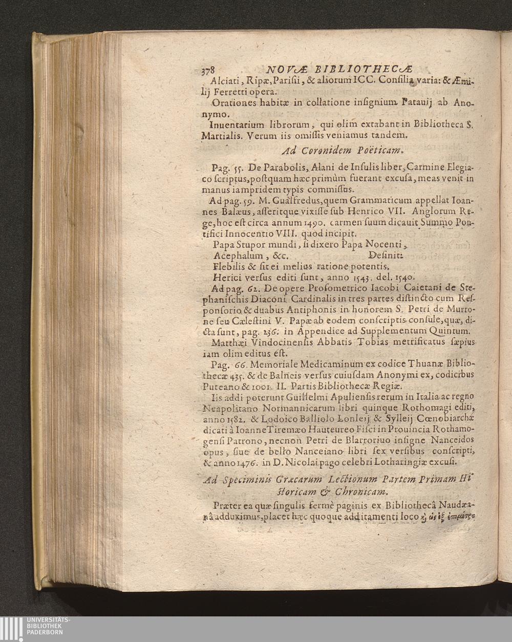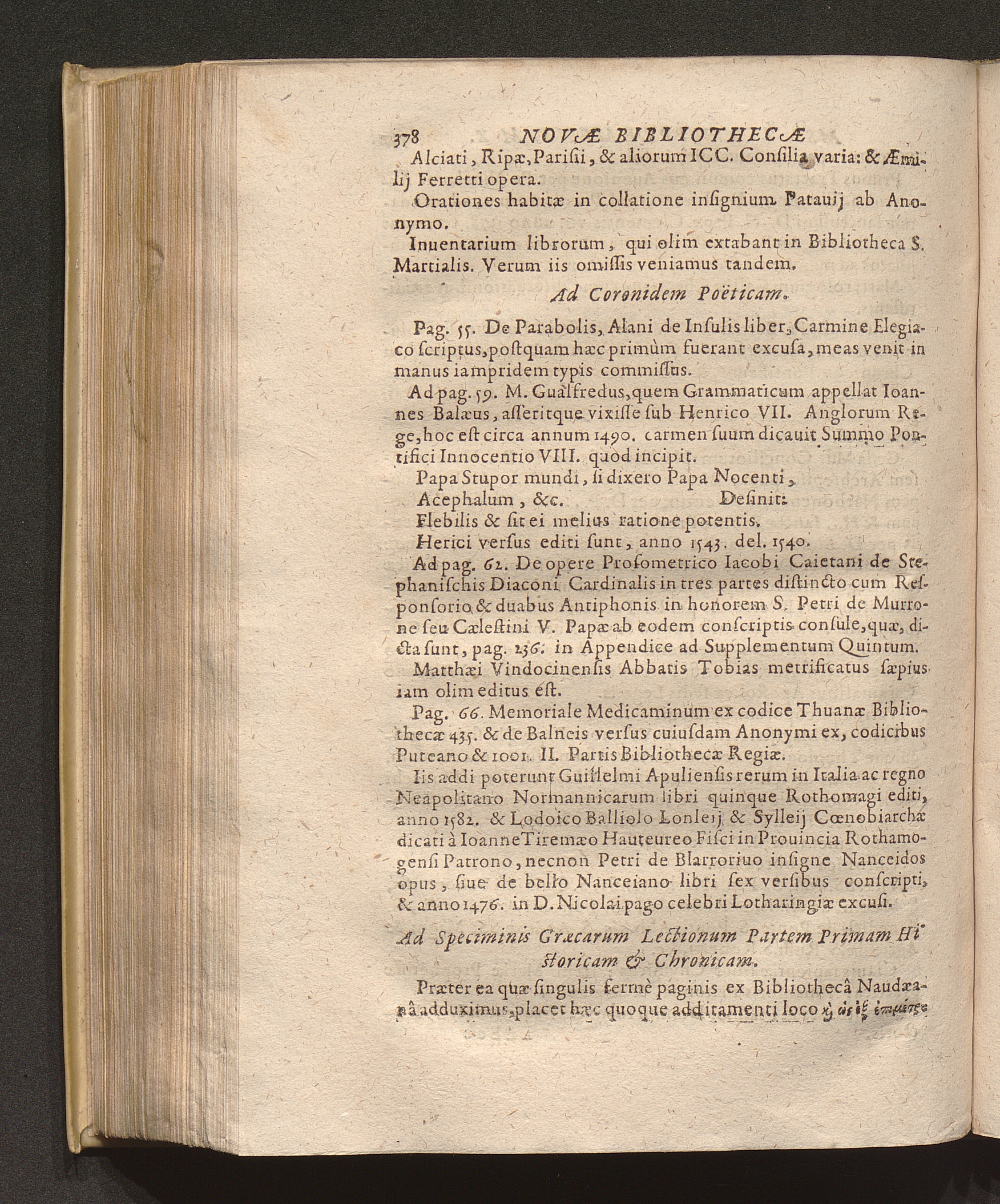 Philippi Labbei Bitvrici Societatis Iesv Presbyteri, Nova Bibliotheca Mss. Librorvm, Sive Specimen Antiqvarvm Lectionvm Latinarvm Et Græcarvm : In quatuor partes tributarum ; Cvm Coronide Dvplici, Poetica Et Libraria, Ac Supplementis decem