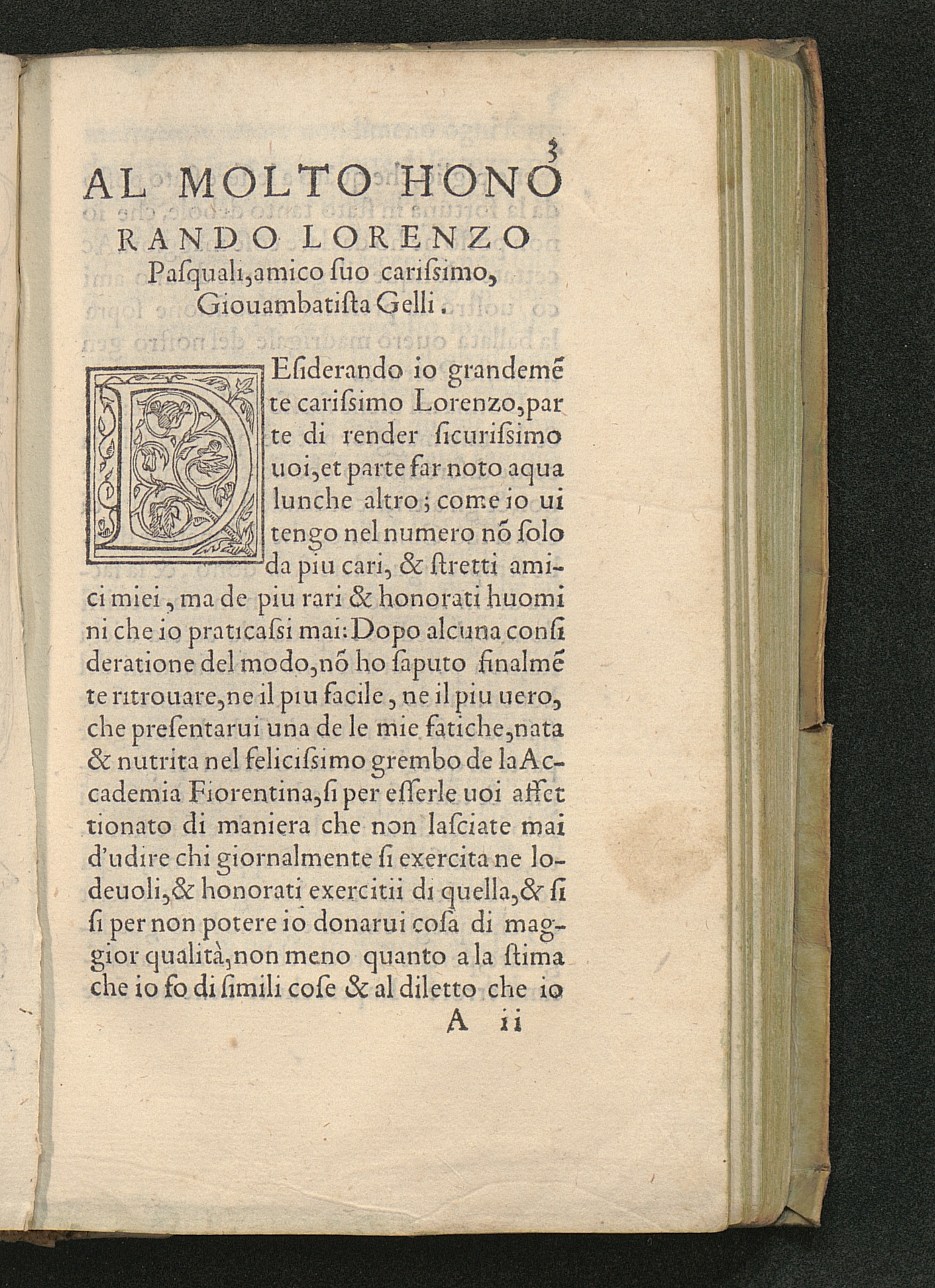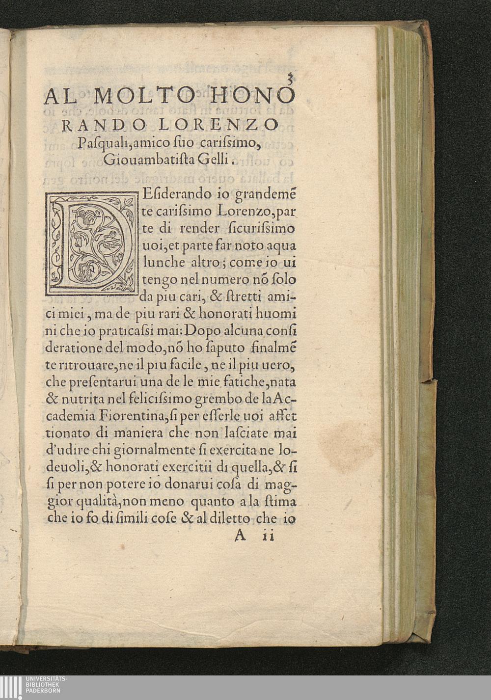 Al Molto Honorando Lorenzo Pasquali, amico suo carisimo, Giouambatista Gelli.