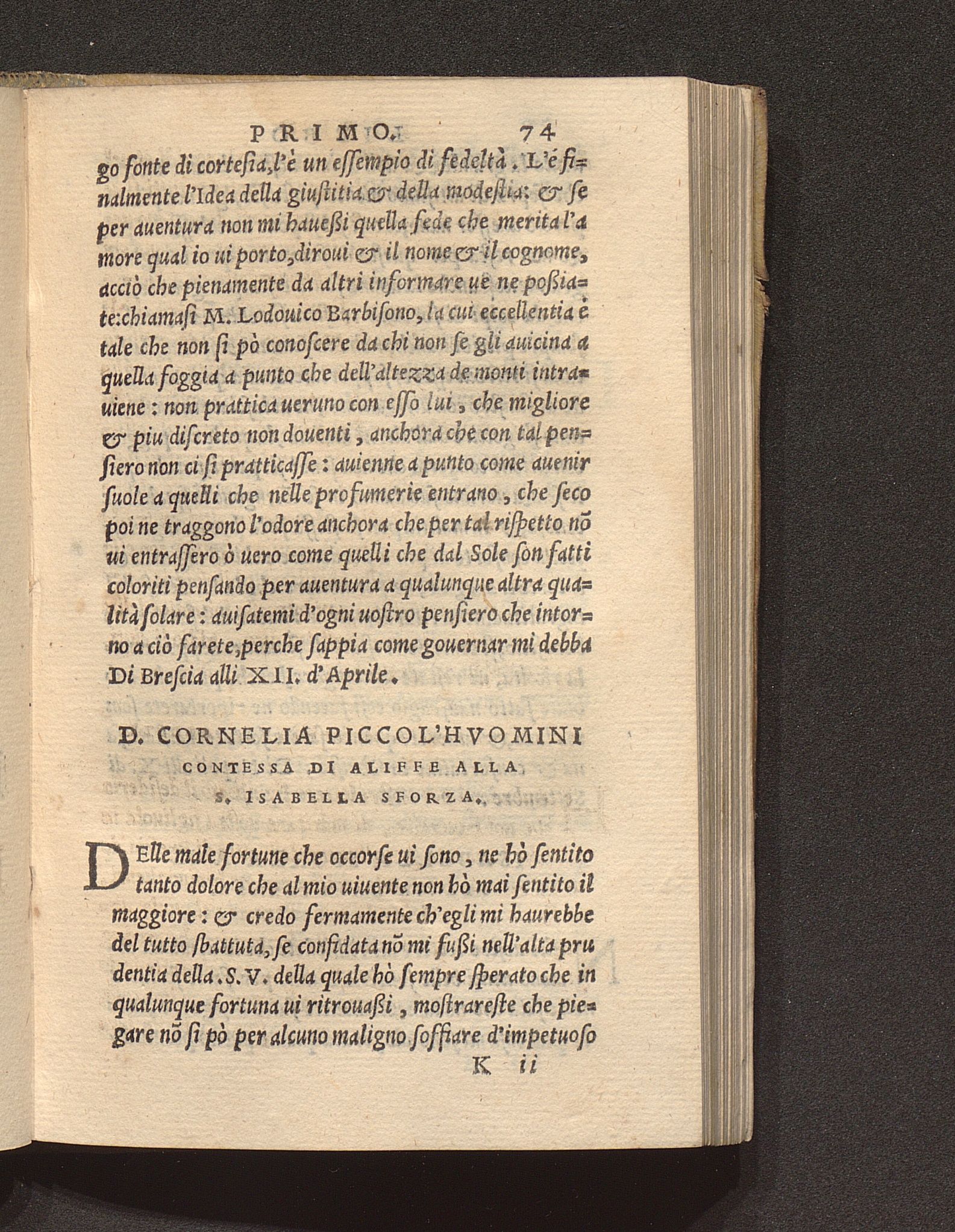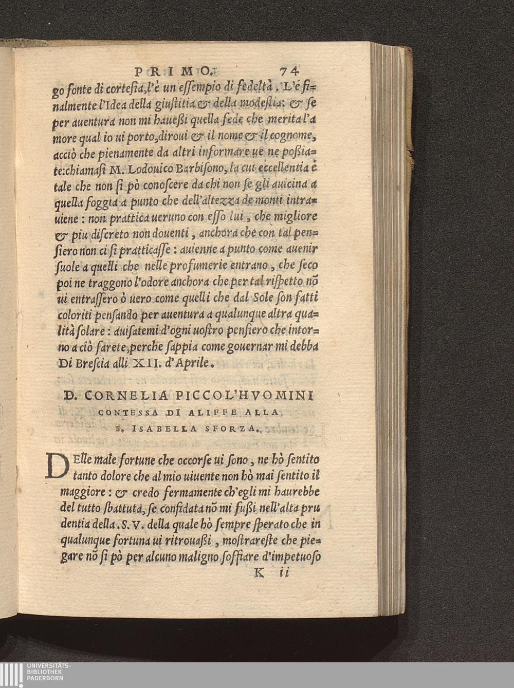 D. Cornelia Piccol'Hvomini Contessa Di Aliffe Alla S. Isabella Sforza.