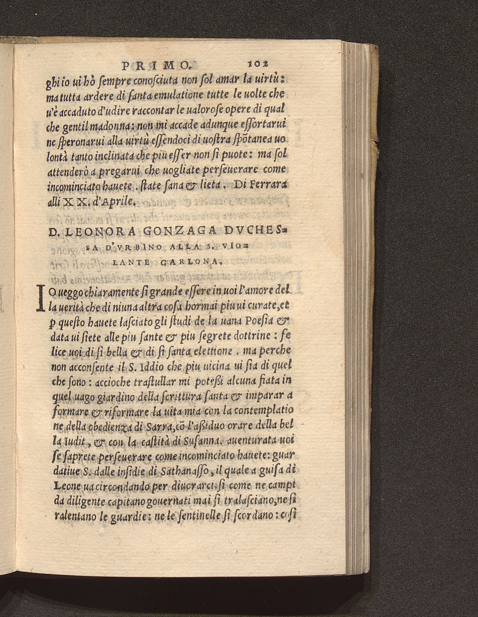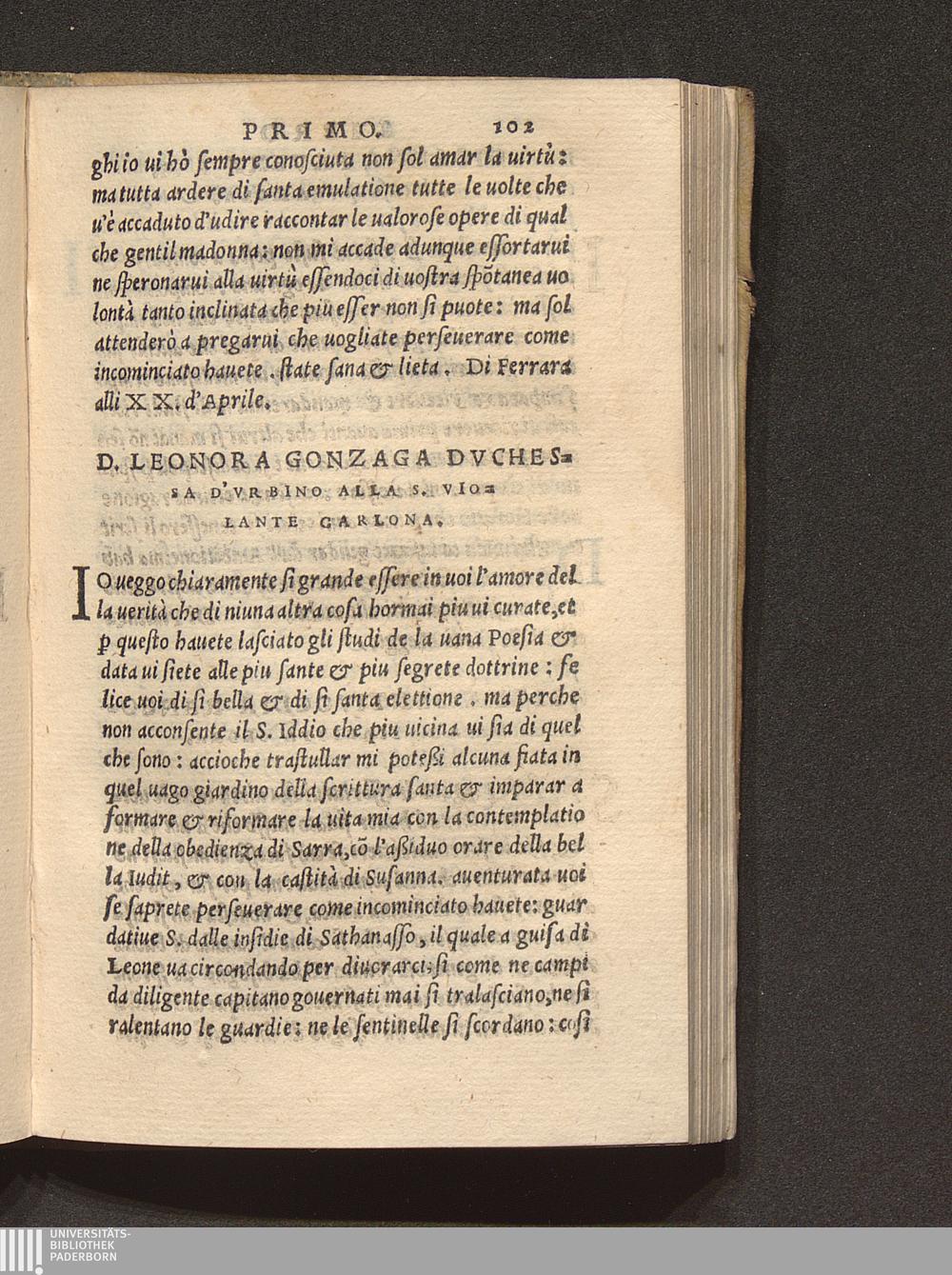 D. Leonora Gonzaga Dvchessa D'Vrbino Alla S. Violante Carlona.