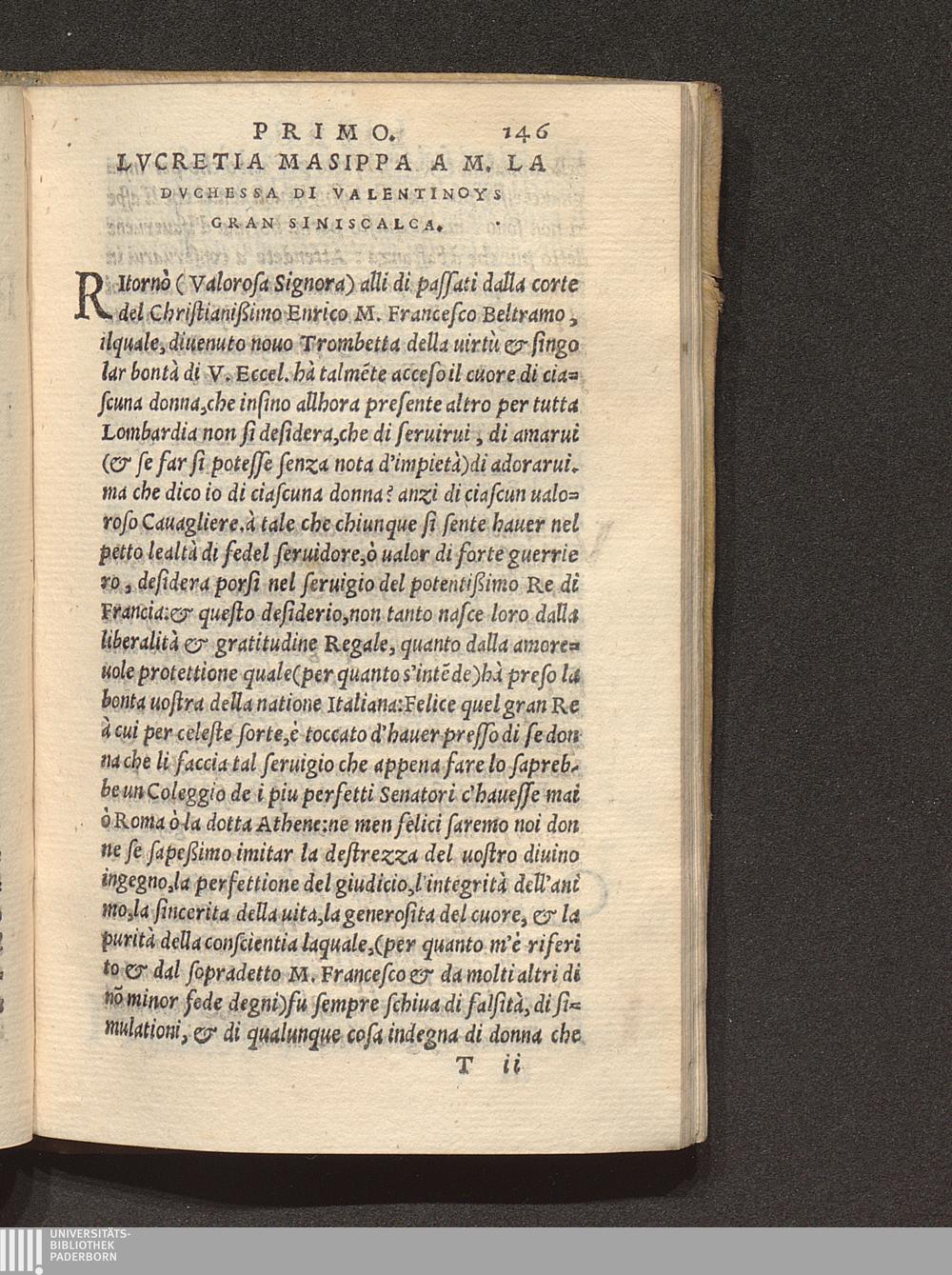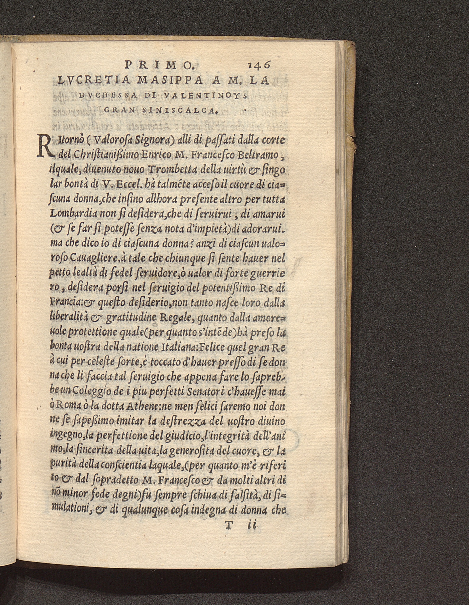 Lvcretia Masippa A M. La Dvchessa Di Valentinoys Gran Siniscalca.