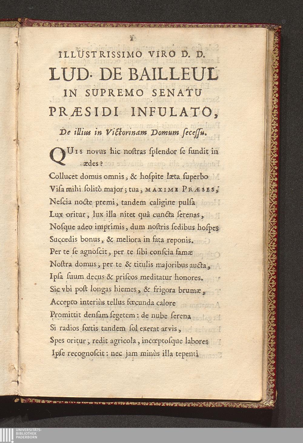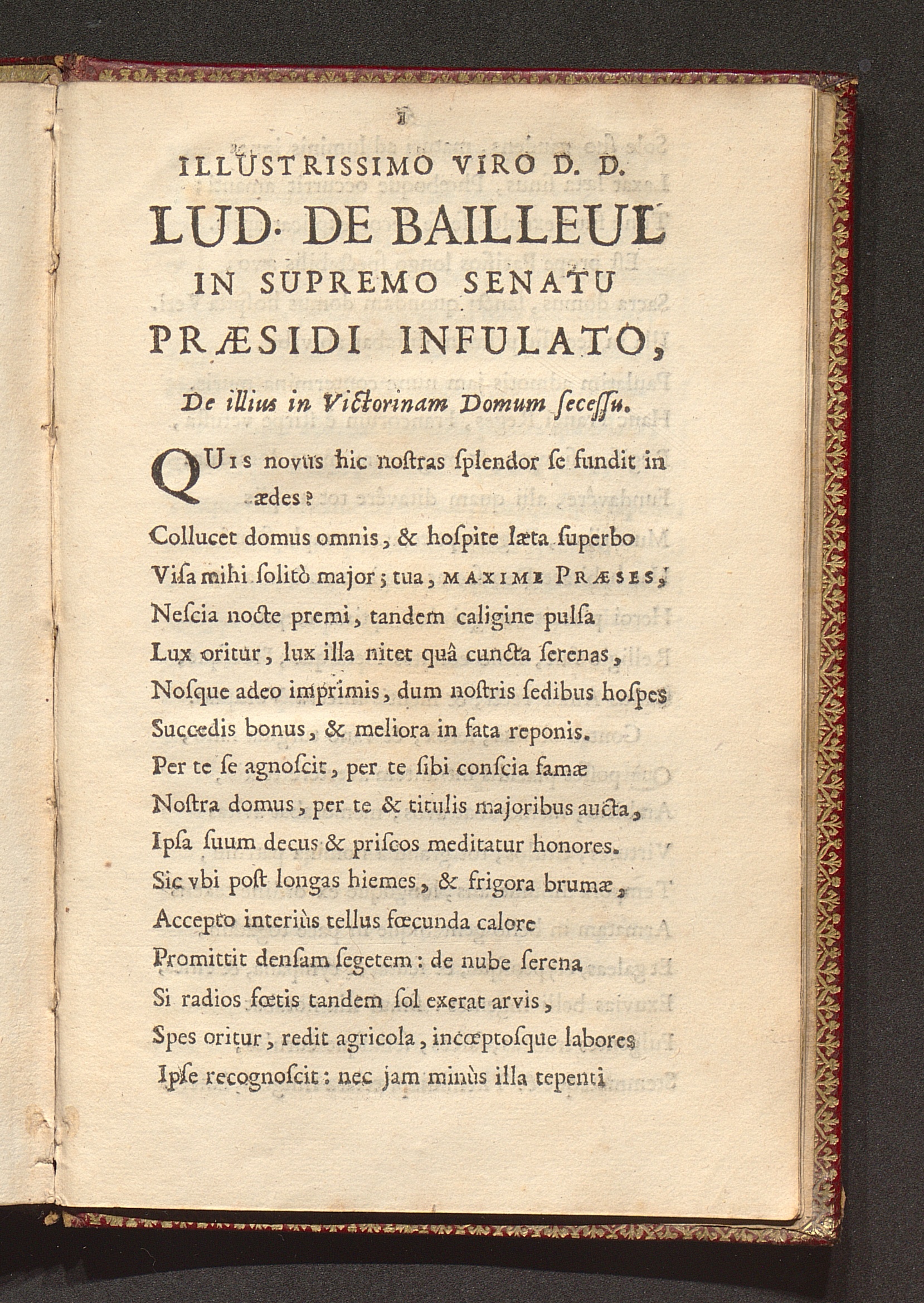 Illustrissimo Viro D. D. Lud. De Bailleul In Supremo Senatu Præsidi Infulato, De illius in Victorinam Domum secessu / [Jean Santeul]