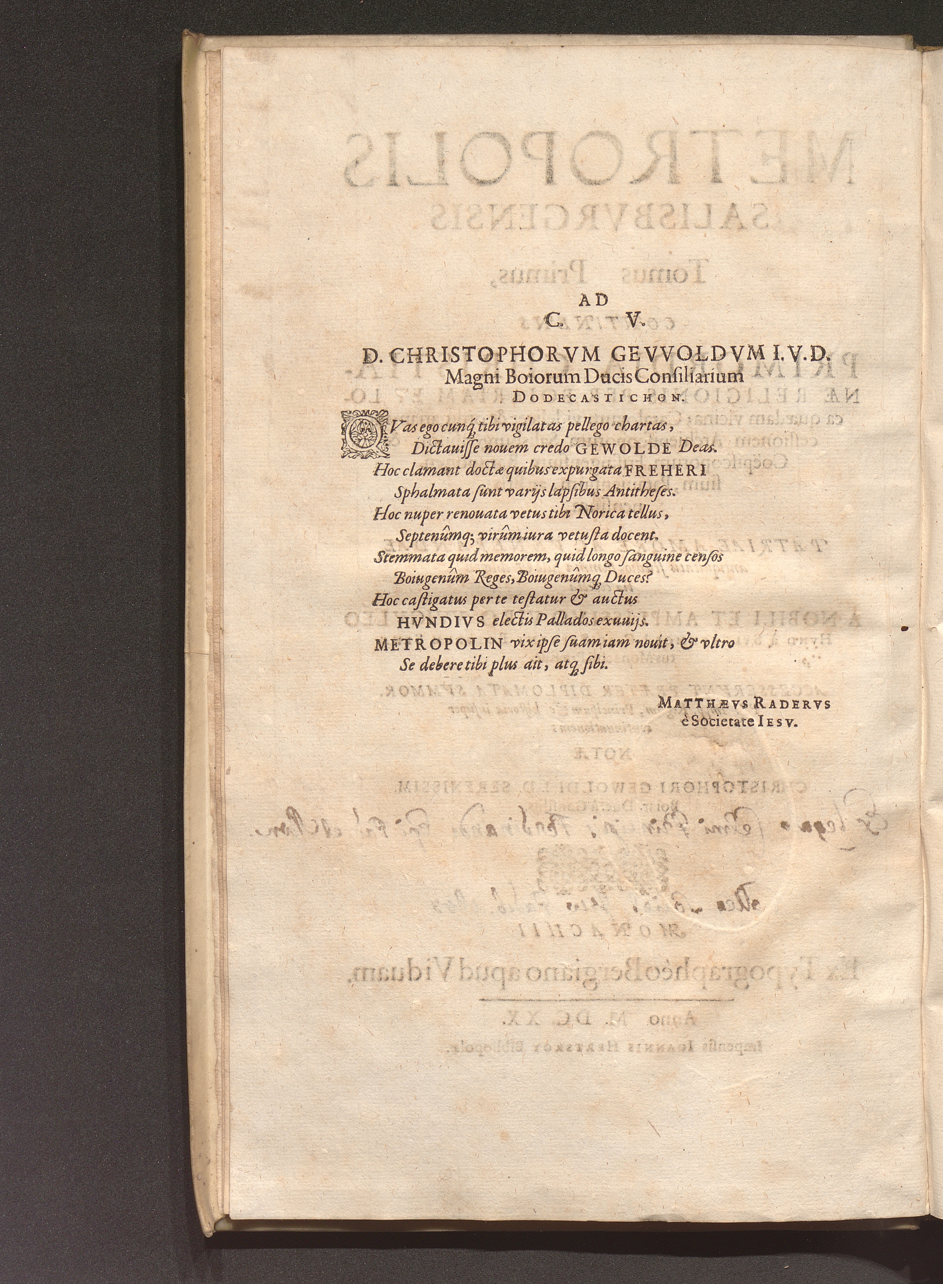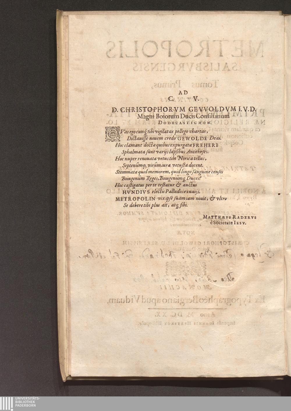 Tomus Primus (1620) Continens Primordia Christianæ Religionis Per Boiariam Et Loca quædam vicina; Catalogum videlicet & ordinariam successionem Archiepiscoporum Salisburgensium, & Coëpiscoporum, Frisingensium, Ratisponensium, Patauiensium, ac Brixinensium