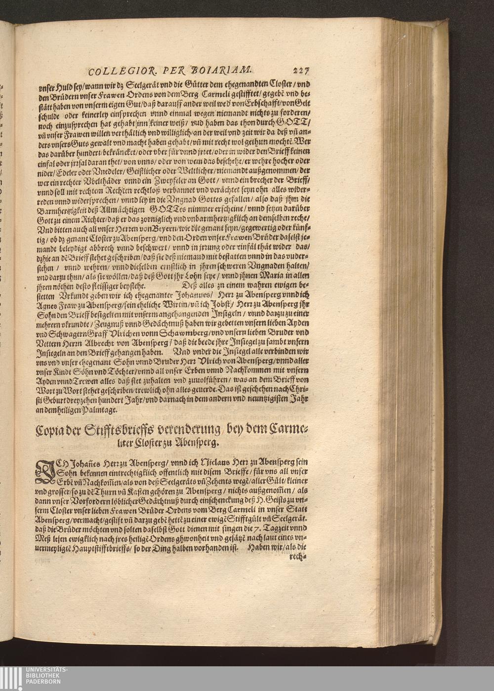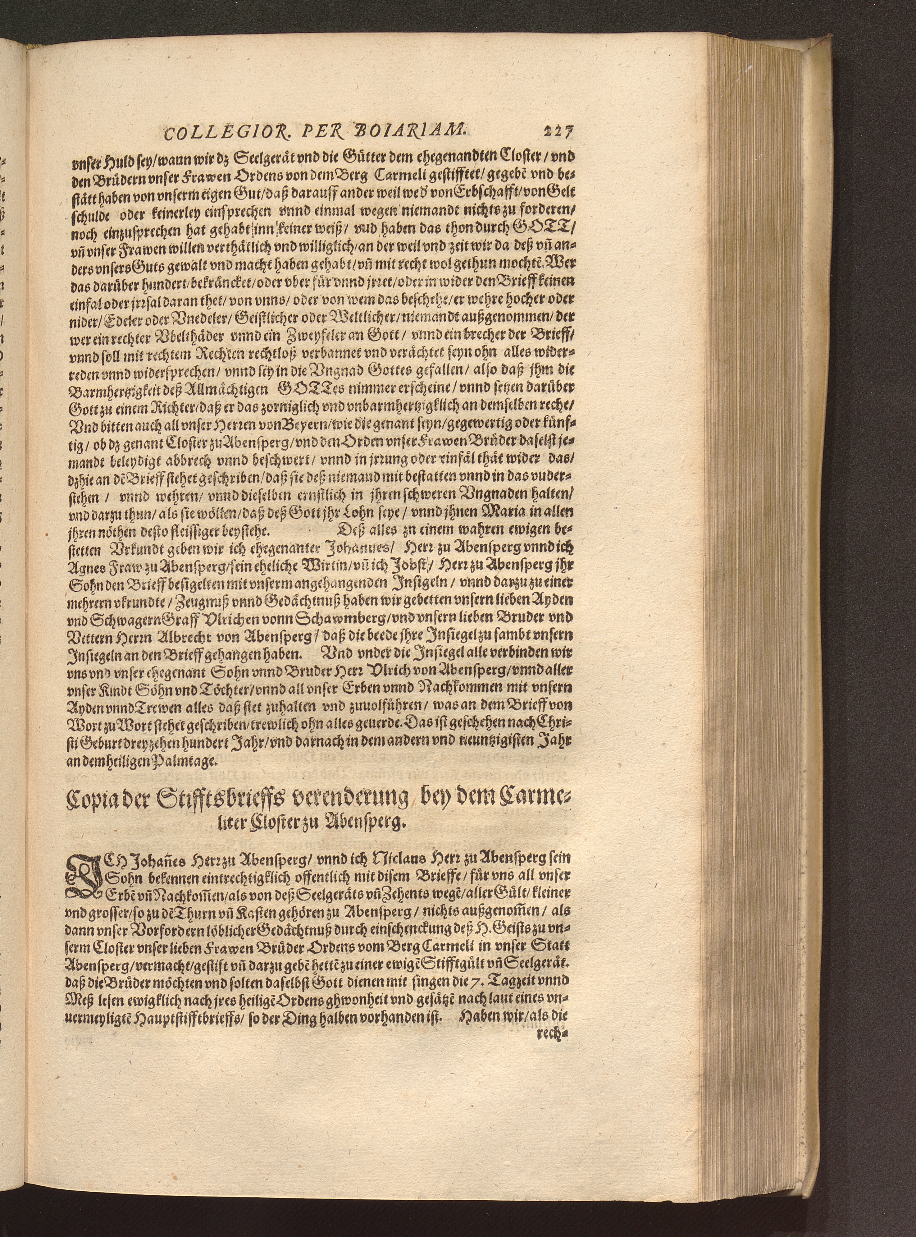 Copia der Stifftsbrieffs verenderung bey dem Carmeliter Closter zu Abensperg.