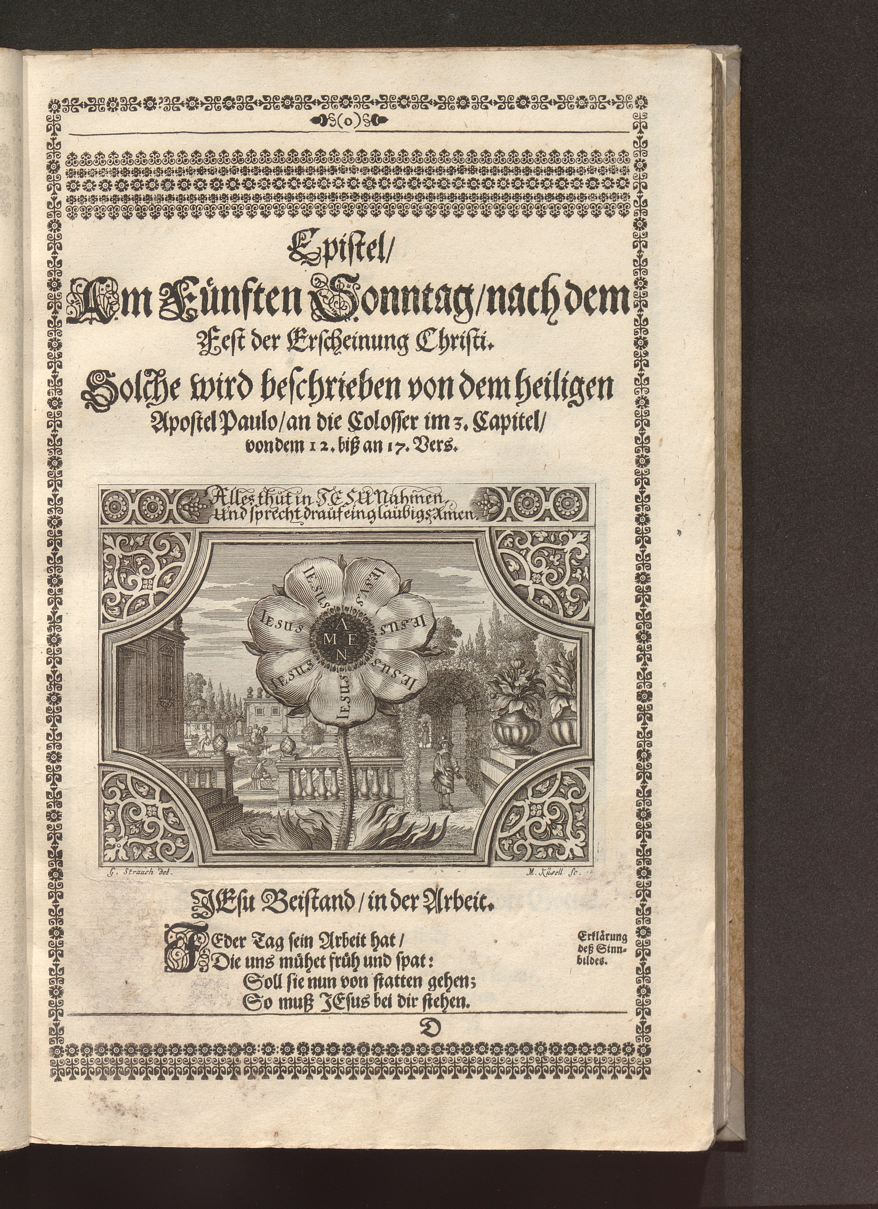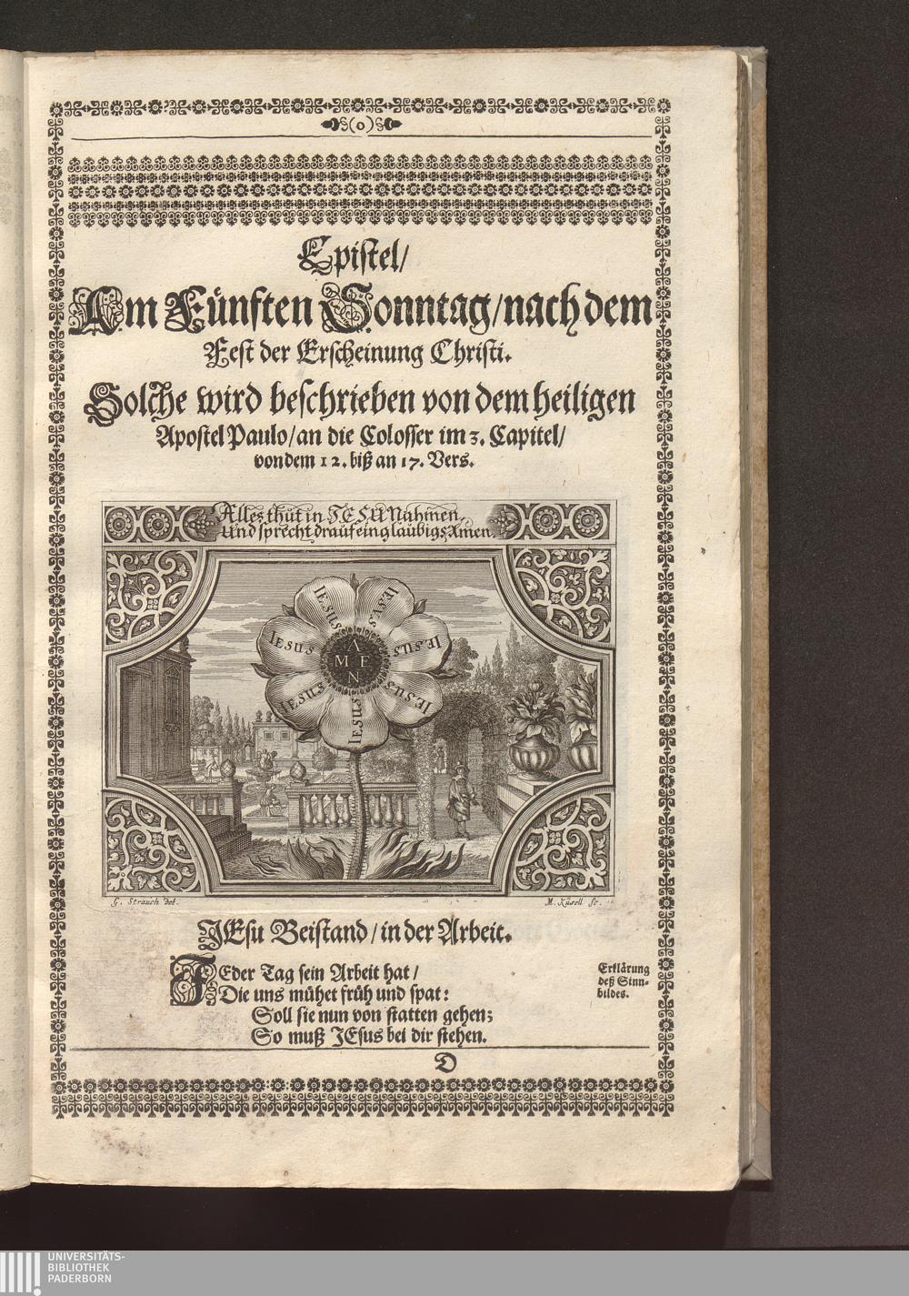 Heilig-Epistolischer Bericht und Licht / I. M. D. Inv. Georg Strauch delineavit. Melchior Küsell sculps.