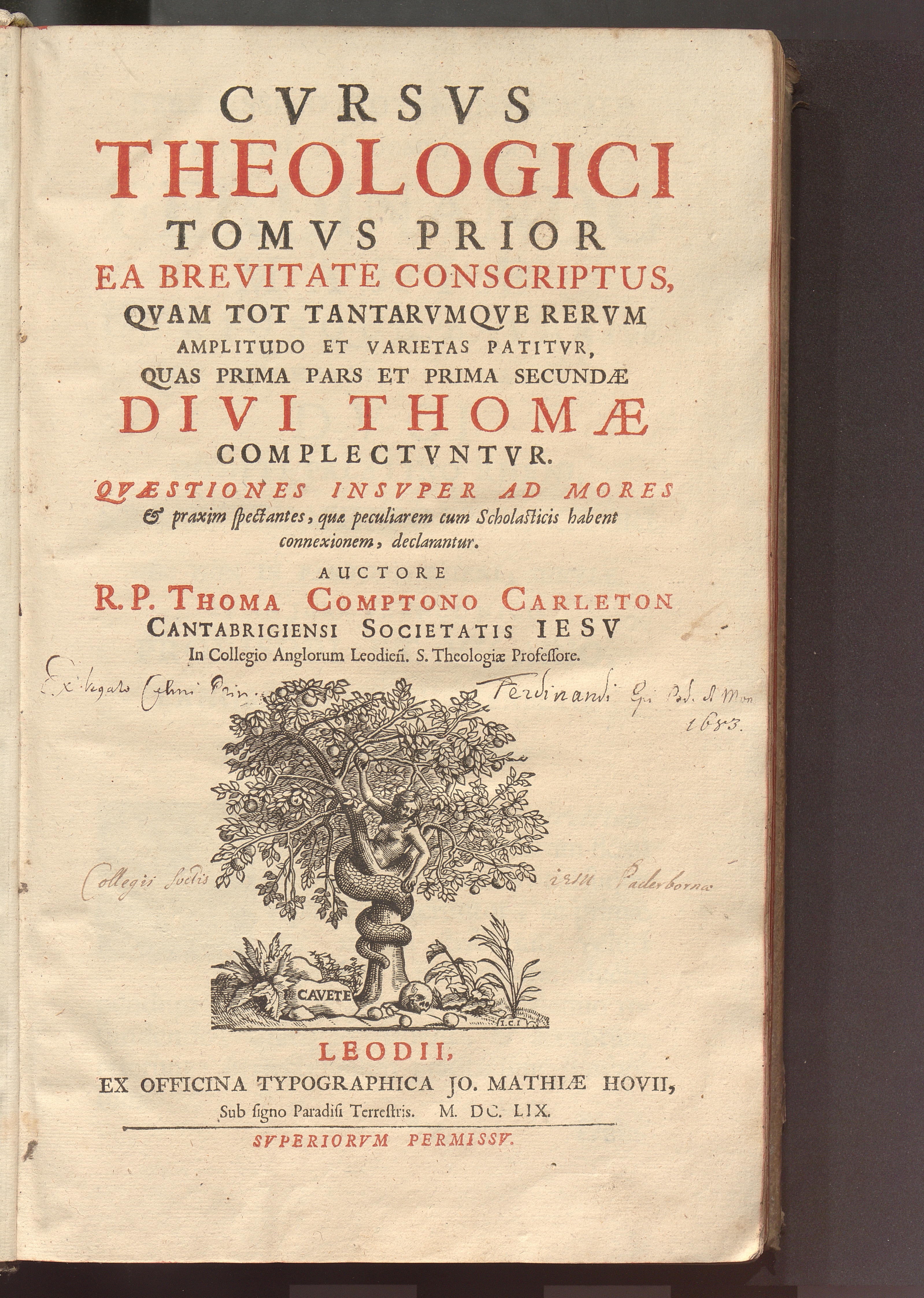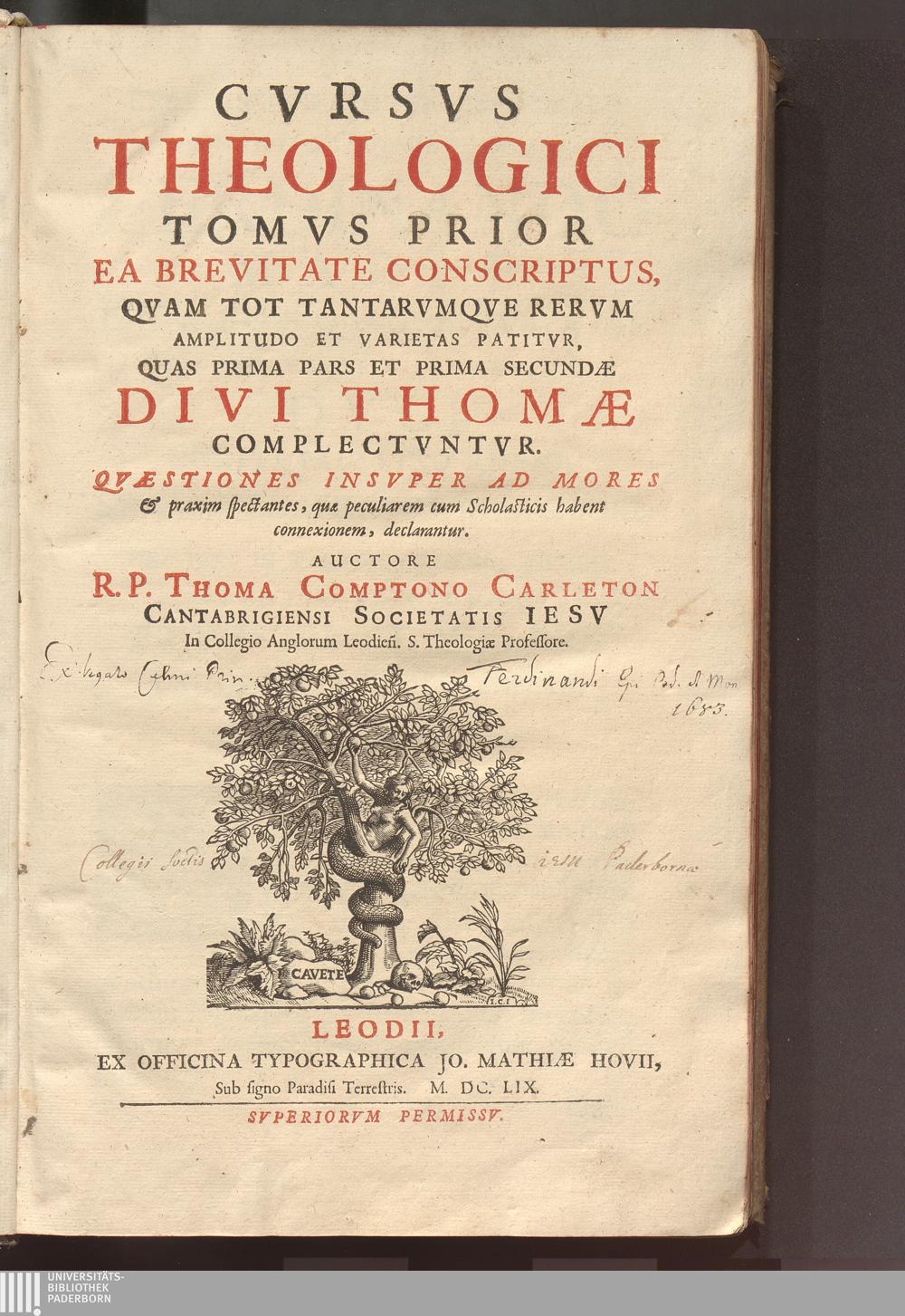 Tomvs Prior (1659) Quas Prima Pars Et Prima Secundæ Divi Thomæ Complectvntvr : Qvæstiones Insvper Ad Mores & praxim spectantes, quæ peculiarem cum Scholasticis habent connexionem, declarantur